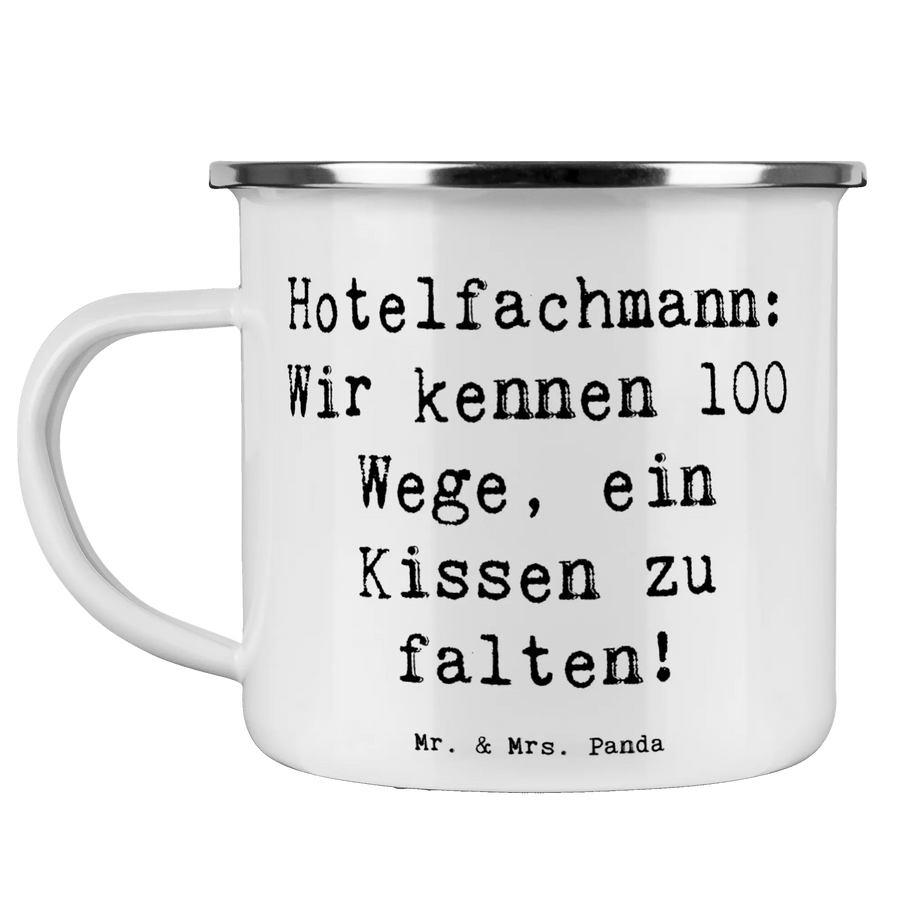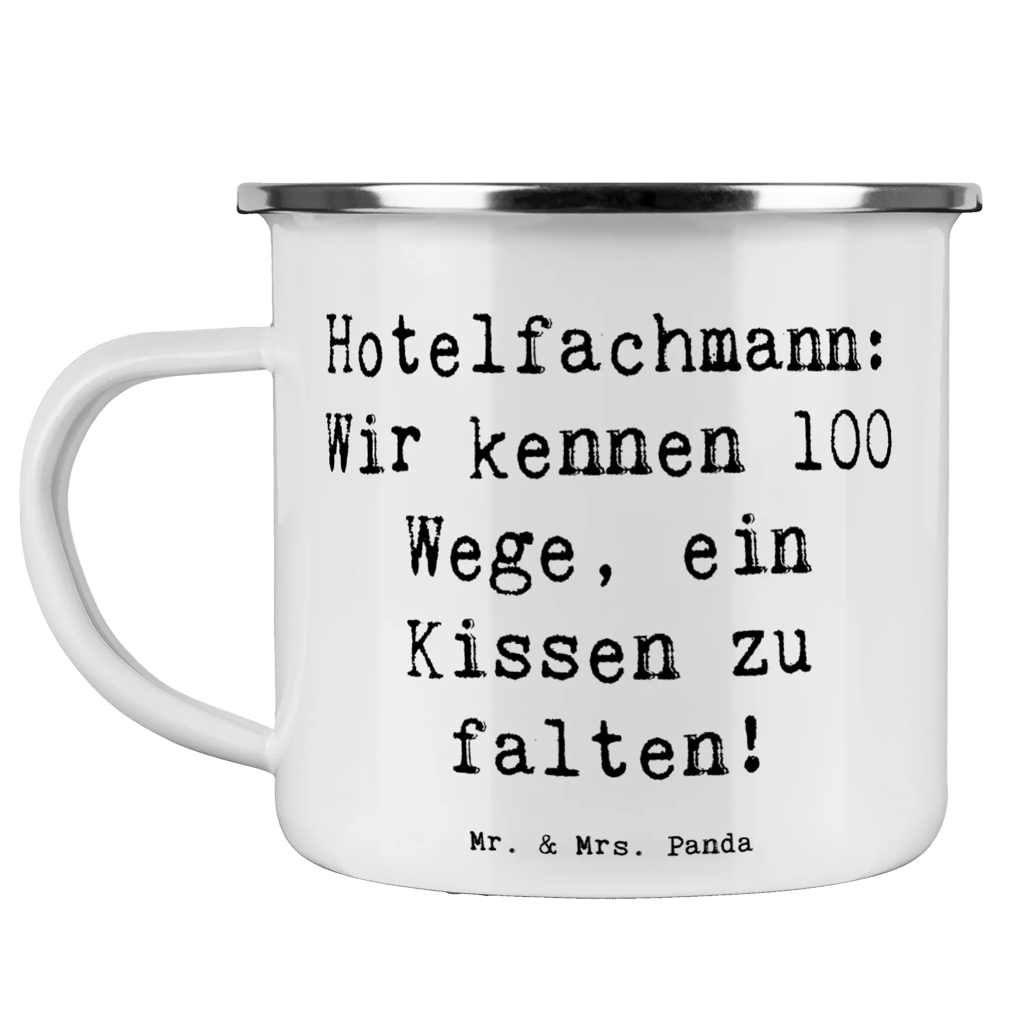 Camping Emaille Tasse Spruch Hotelfachmann: Wir kennen 100 Wege, ein Kissen zu falten!