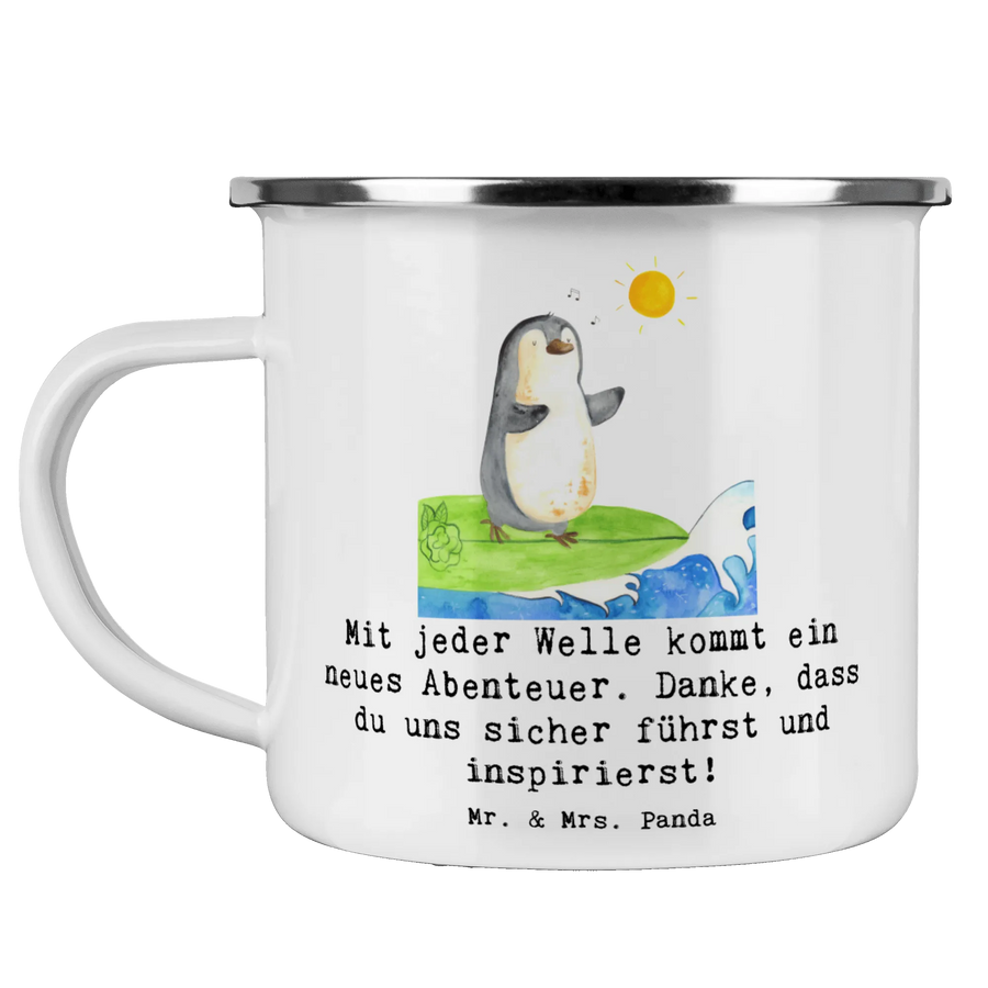 Die Camping Emaille Tasse "Surfen Trainerin" von Mr. & Mrs. Panda ist das perfekte Geschenk für alle Sportbegeisterten und Trainerinnen, die ihre Leidenschaft für das Surfen mit einem praktischen Accessoire kombinieren möchten! Diese wunderschöne und beständige Emaille Tasse vereint Funktionalität und Stil.