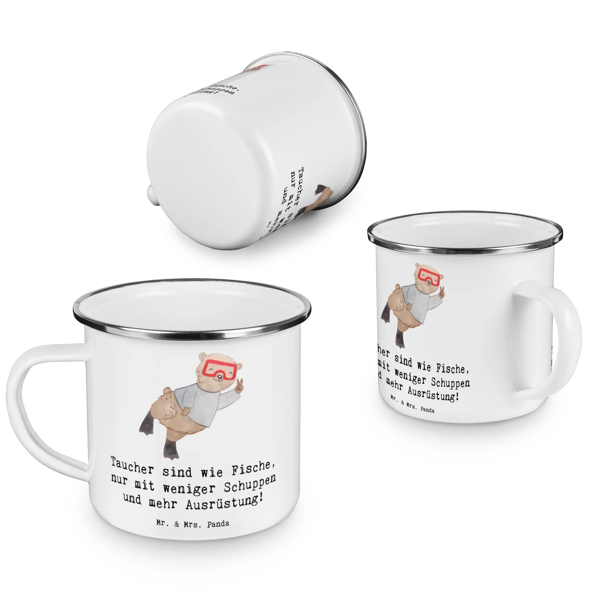Die Camping Emaille Tasse von Mr. & Mrs. Panda ist das perfekte Geschenk für alle Sportliebhaber und Outdoor-Enthusiasten! Mit dem witzigen Spruch "Taucher sind wie Fische, nur mit weniger Schuppen und mehr Ausrüstung!" bringt diese Tasse nicht nur ein Lächeln auf dein Gesicht, sondern auch eine Portion Humor in jede Outdoor-Aktivität.