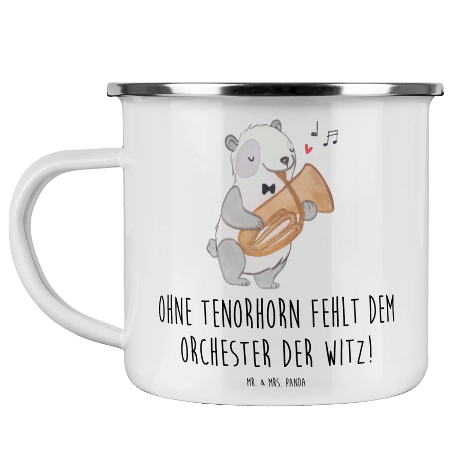 Die wunderschöne Camping Emaille Tasse von Mr. & Mrs. Panda mit dem charmanten Motiv des Tenorhorns ist das perfekte Geschenk für alle Musiker und Musikliebhaber! Egal, ob beim Camping, auf einer Wanderung oder einfach nur im heimischen Garten – mit dieser robusten, kratzfesten Emaille Tasse hast du immer dein Lieblingsgetränk in der Hand. Mit einer Füllmenge von 300 ml, einem Gewicht von nur 172 g und den kompakten Maßen von 80 mm x 80 mm x 80 mm ist sie superleicht und perfekt für unterwegs.