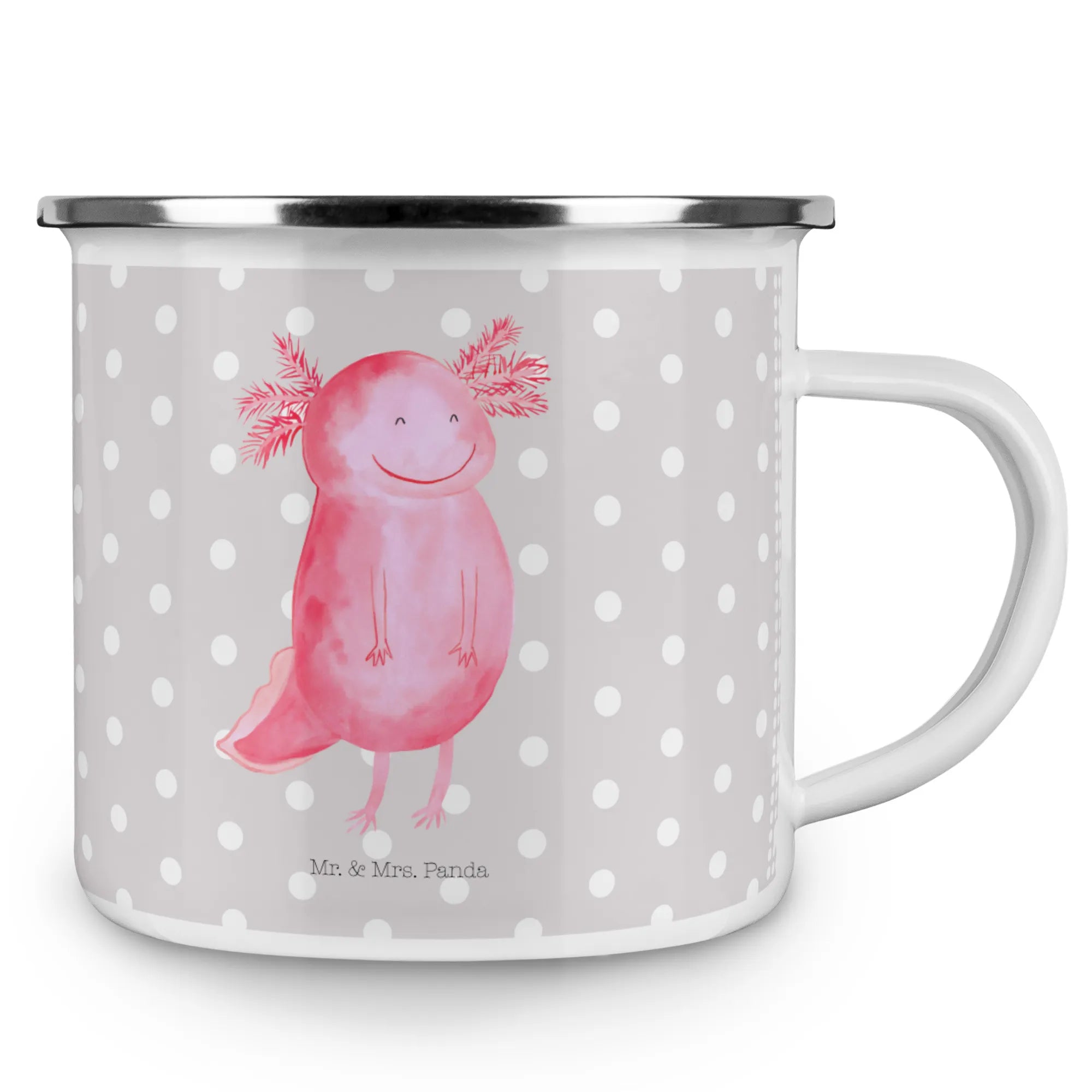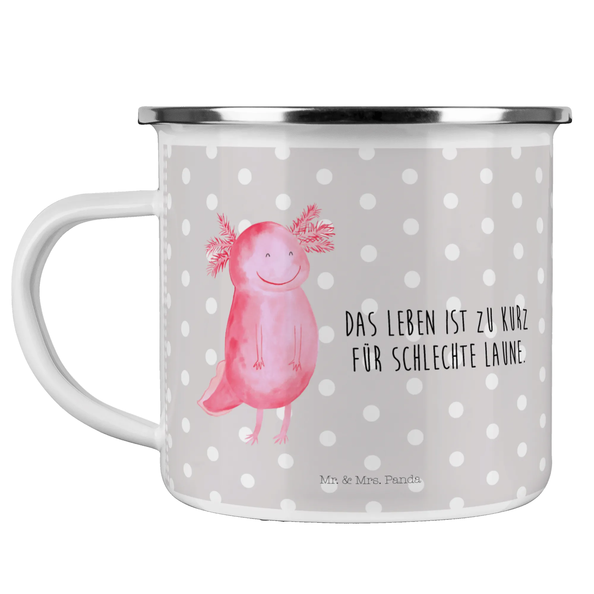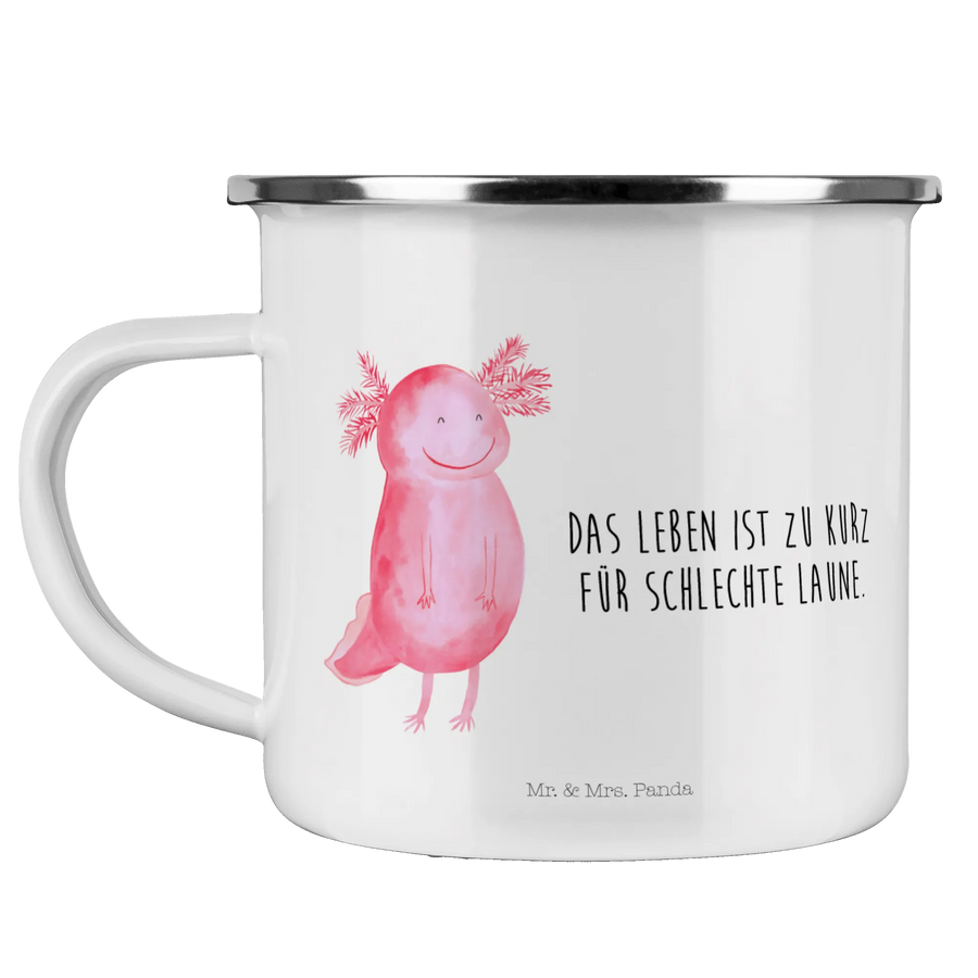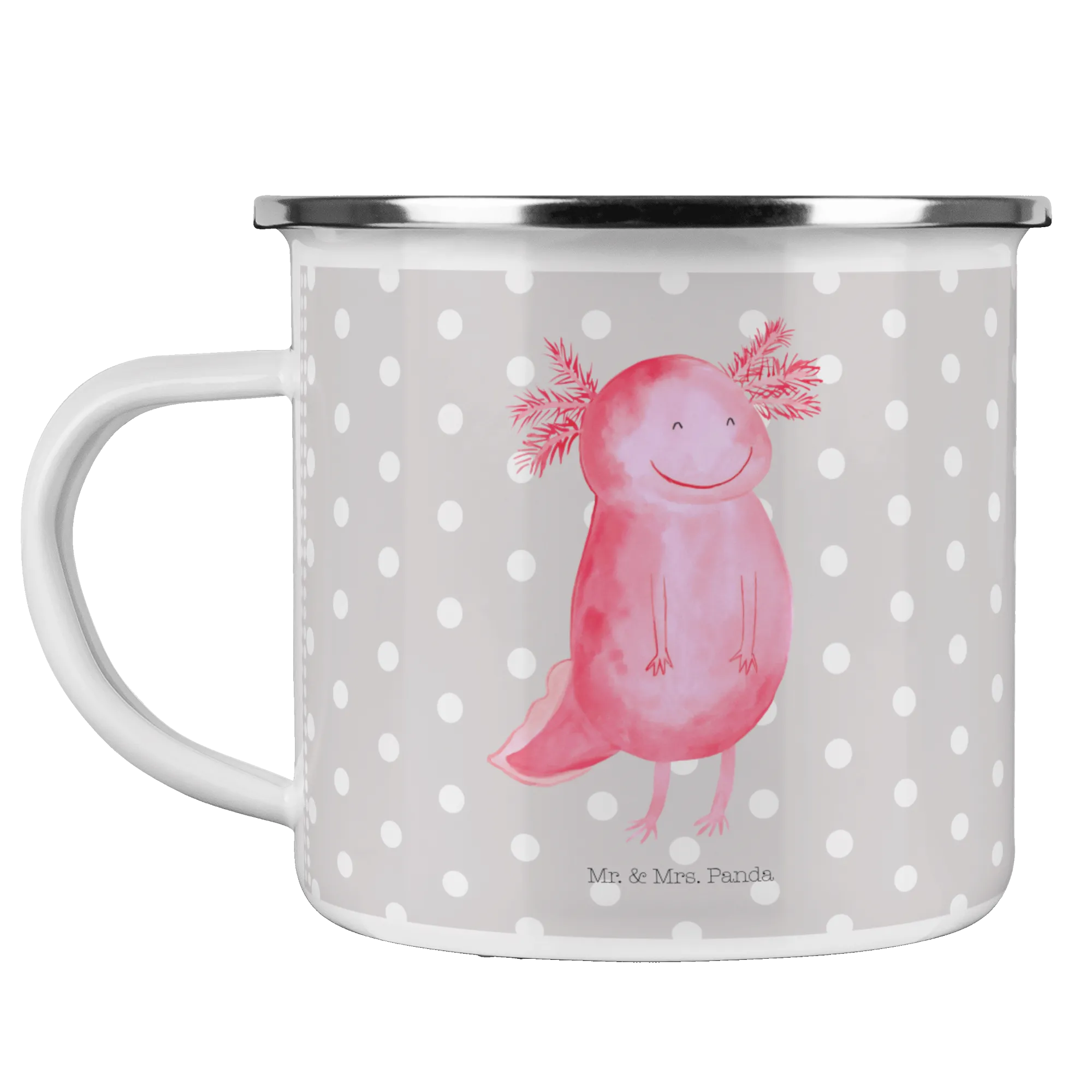 Kempingowy kubek emaliowany Aksolotl Szczęśliwy - z napisem - Biały