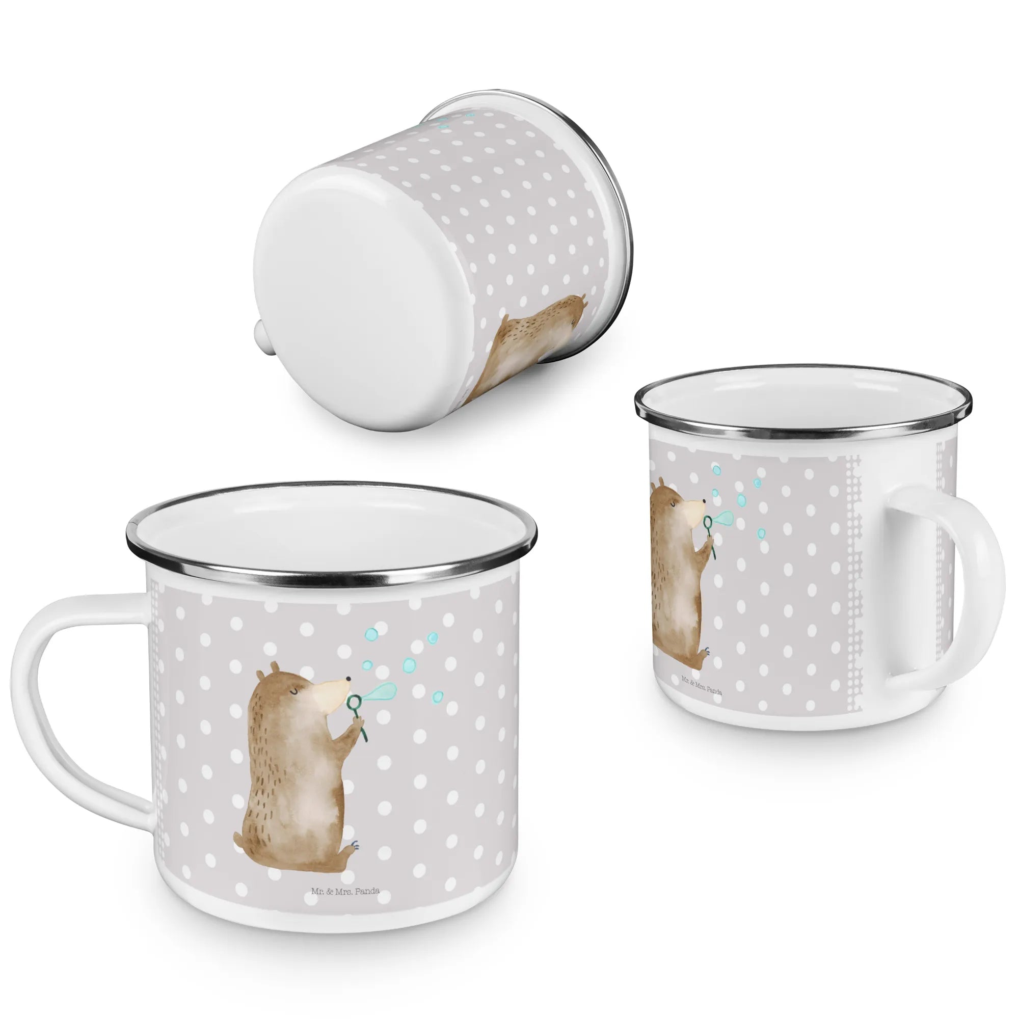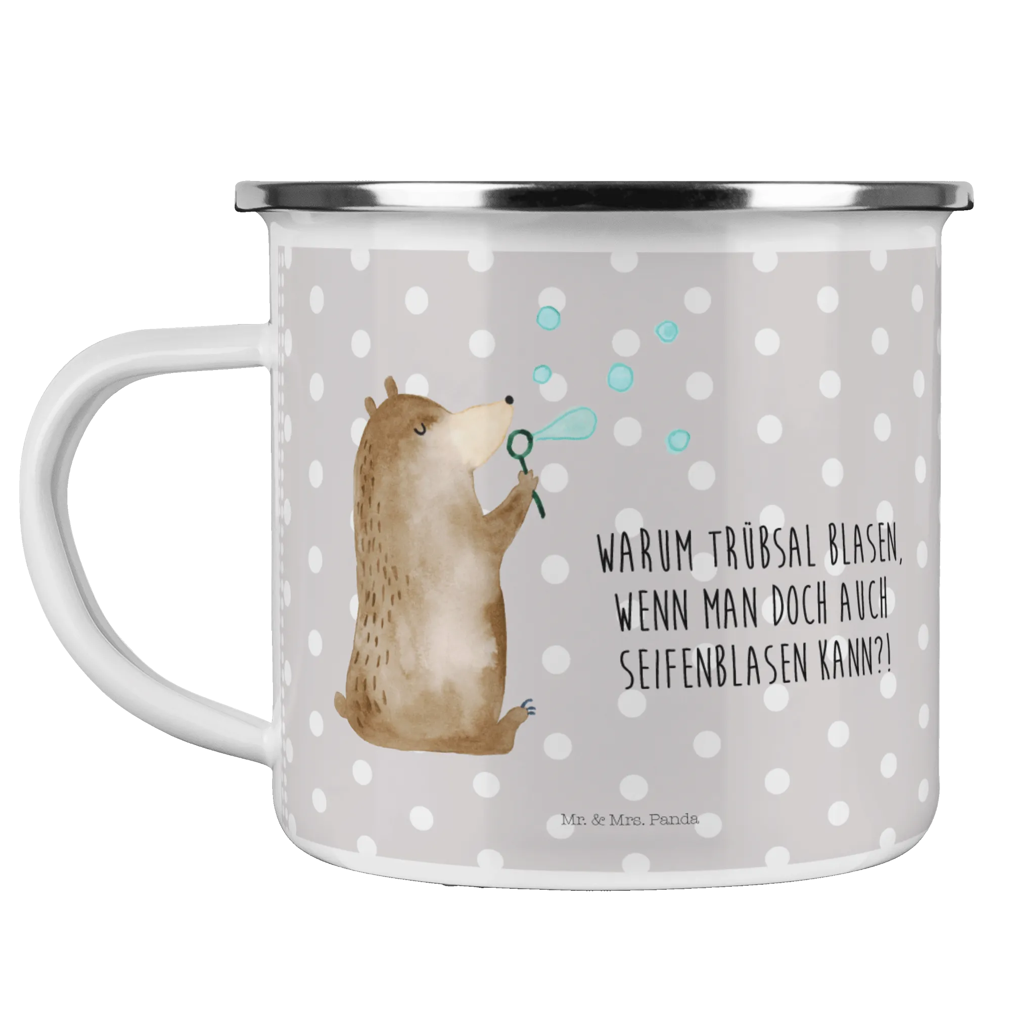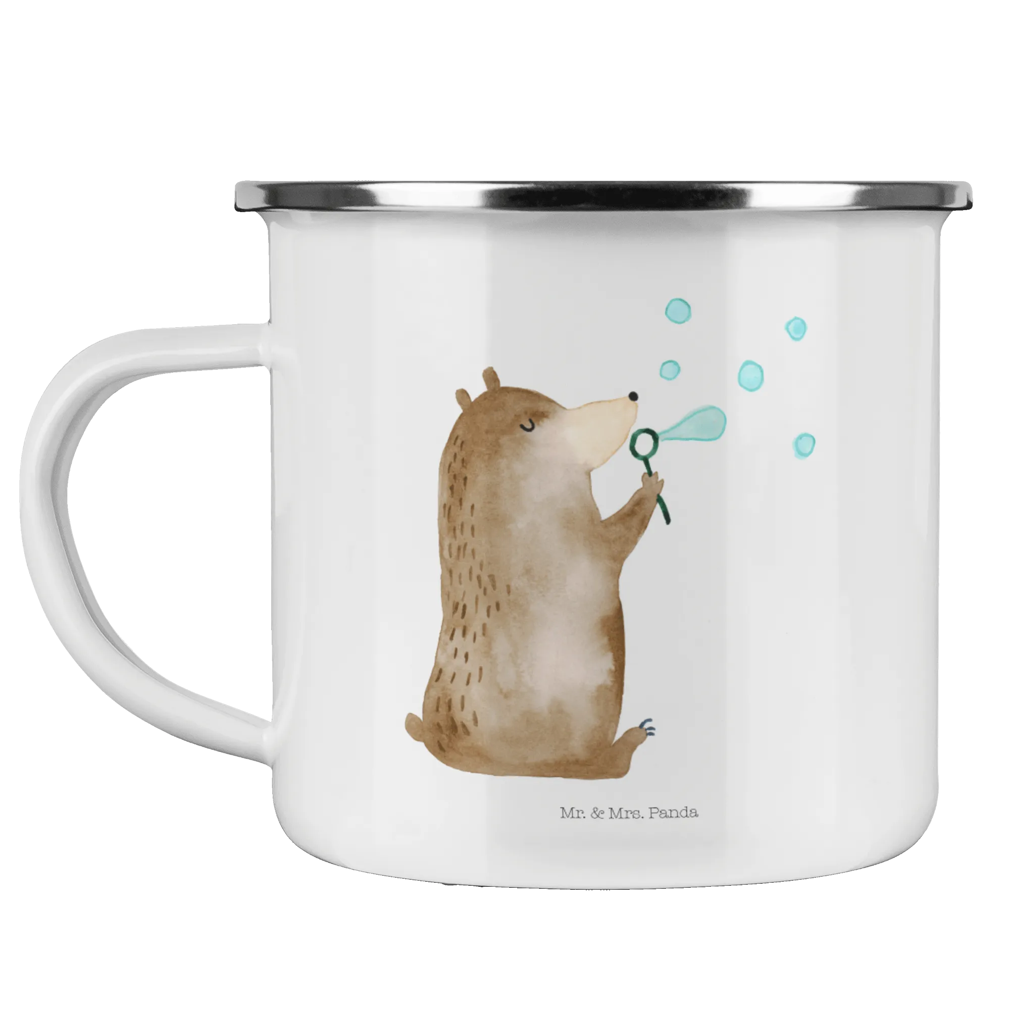 Kempingowy kubek emaliowany niedźwiedź bańki mydlane - z napisem - biały