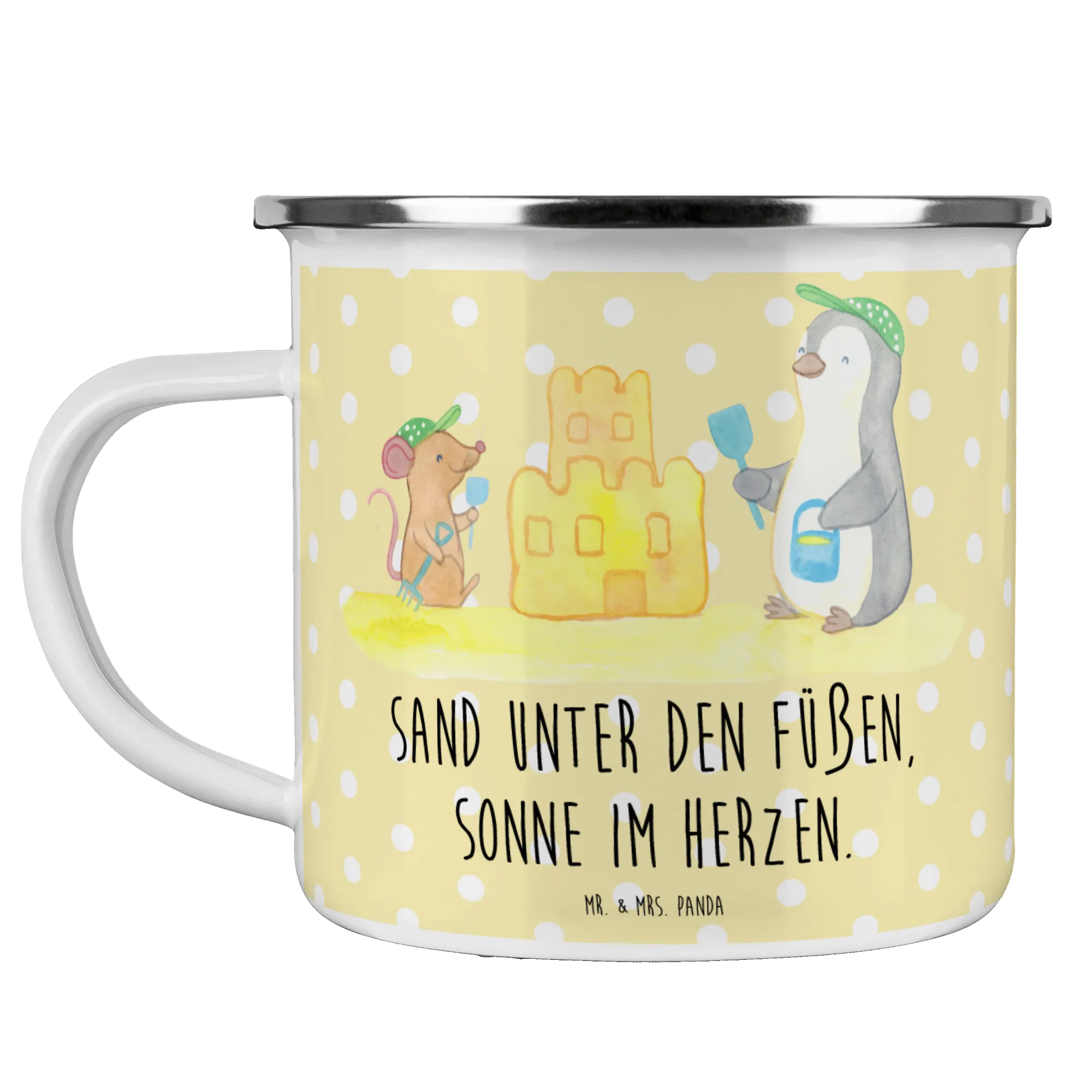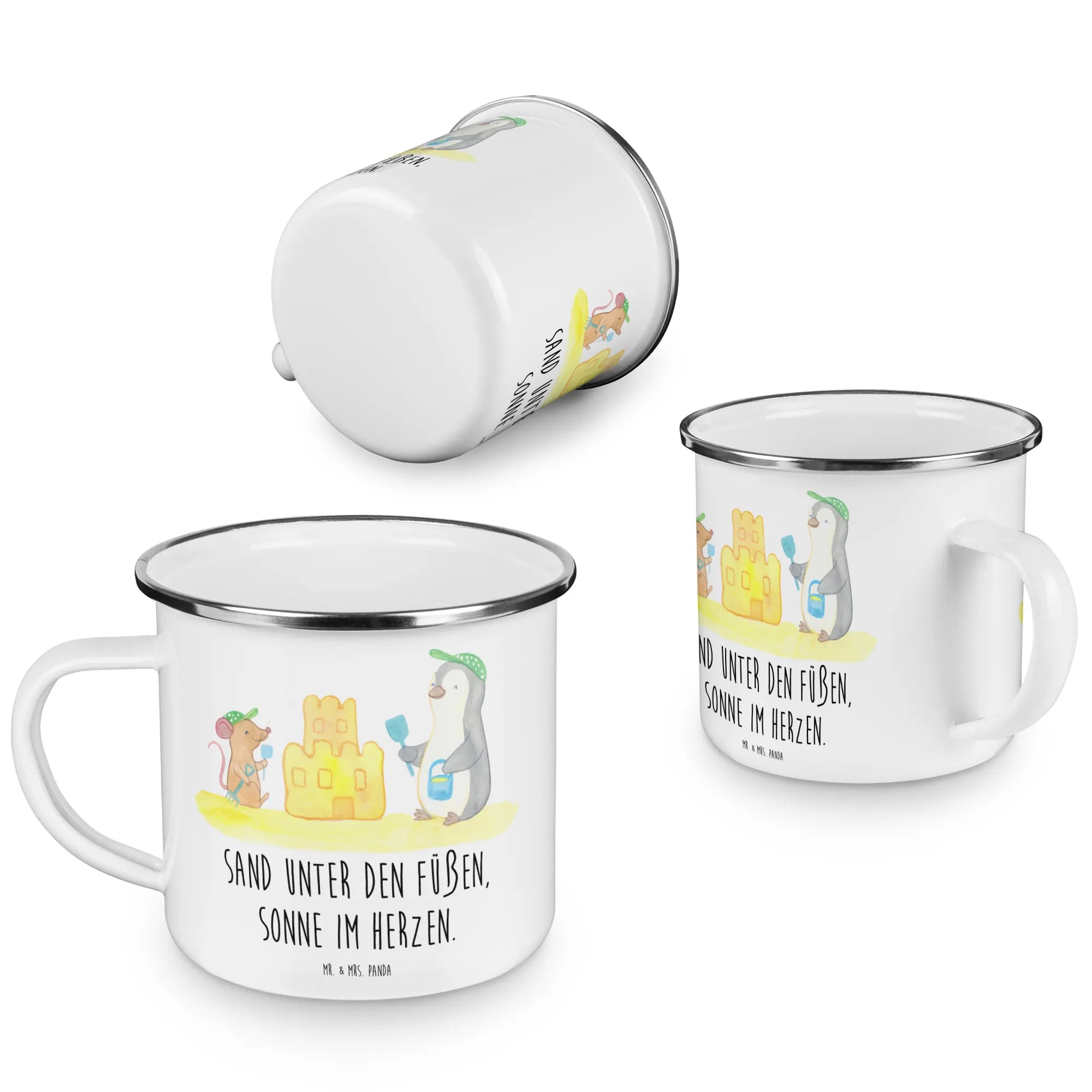 Kempingowy kubek emaliowany Sand unter den Füßen, Sonne im Herzen. - biały