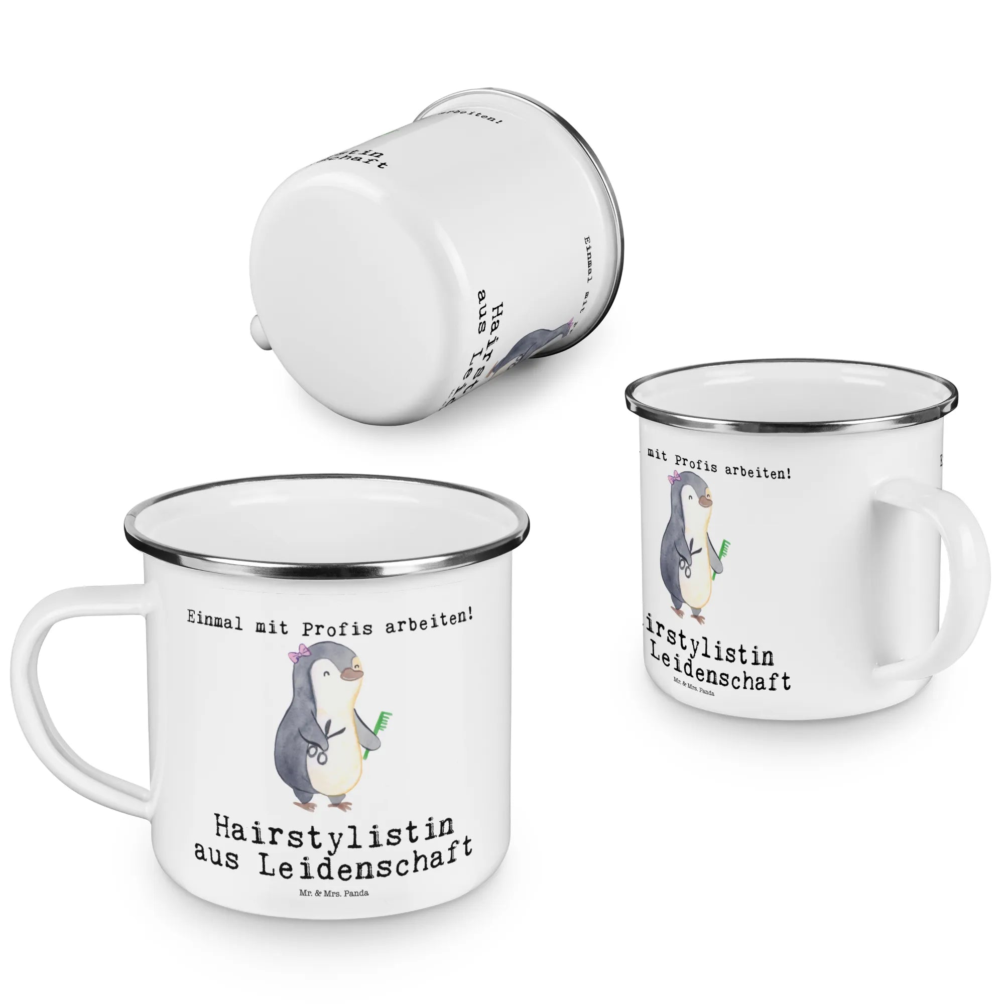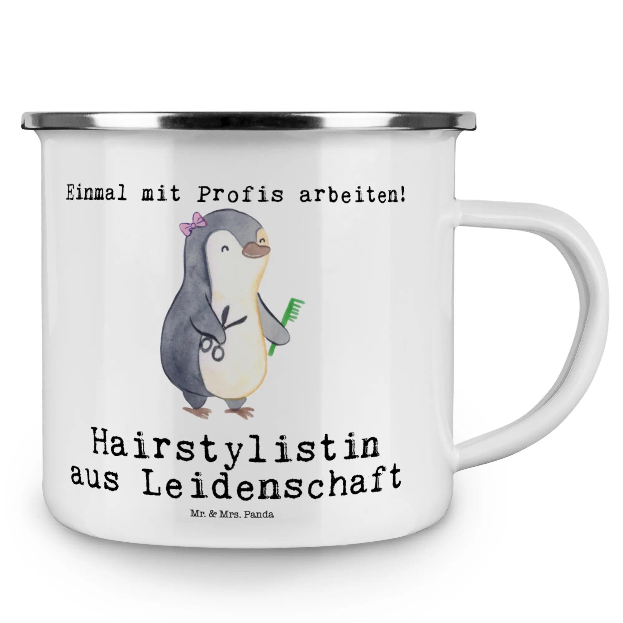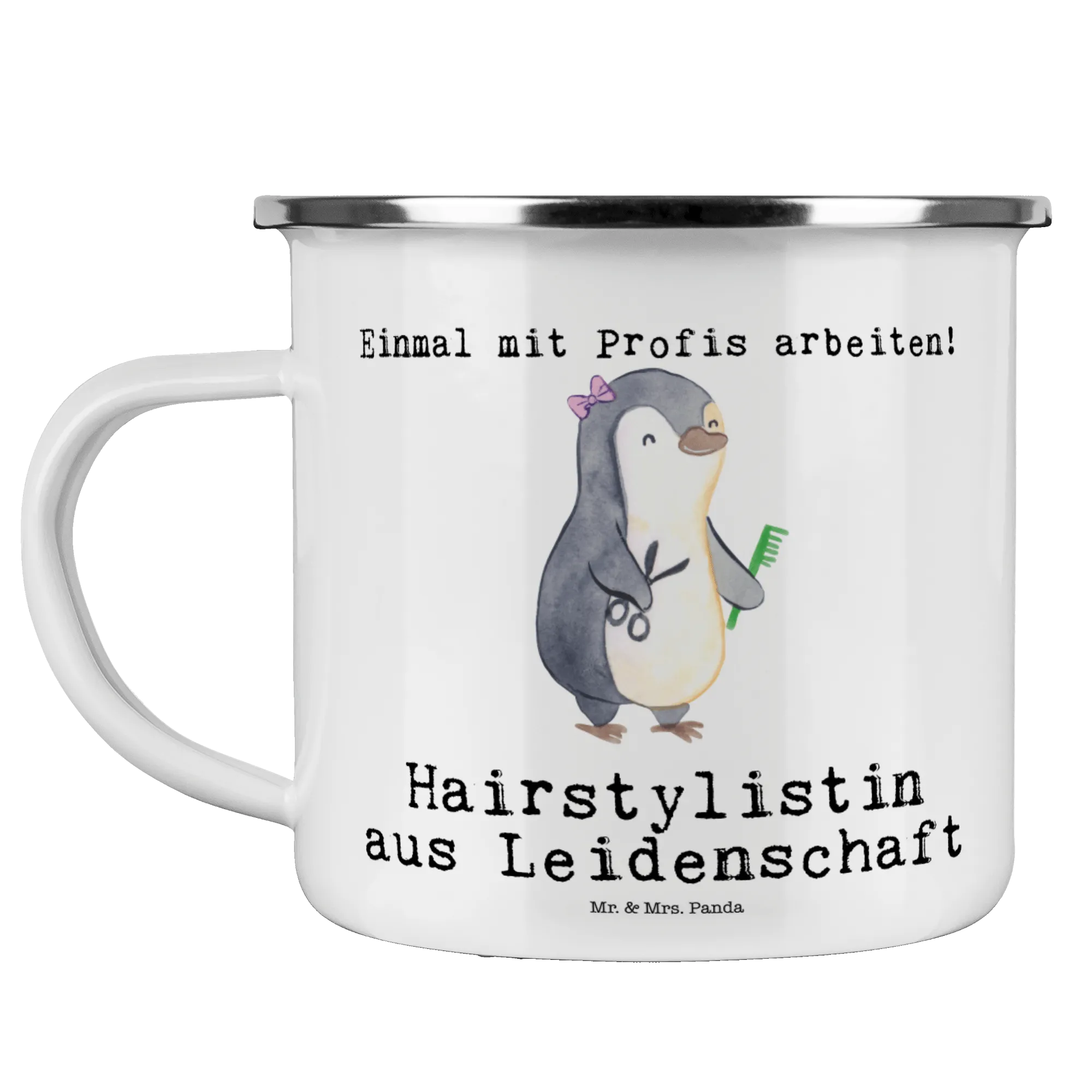 Kempingowy kubek emaliowany stylistka fryzur pasja – Mr. & Mrs. Panda