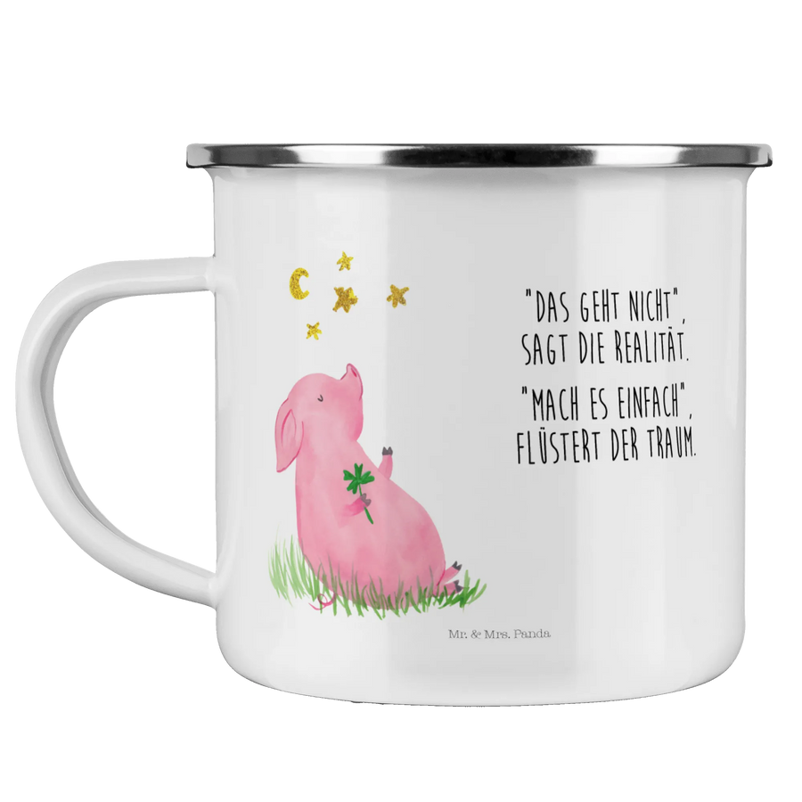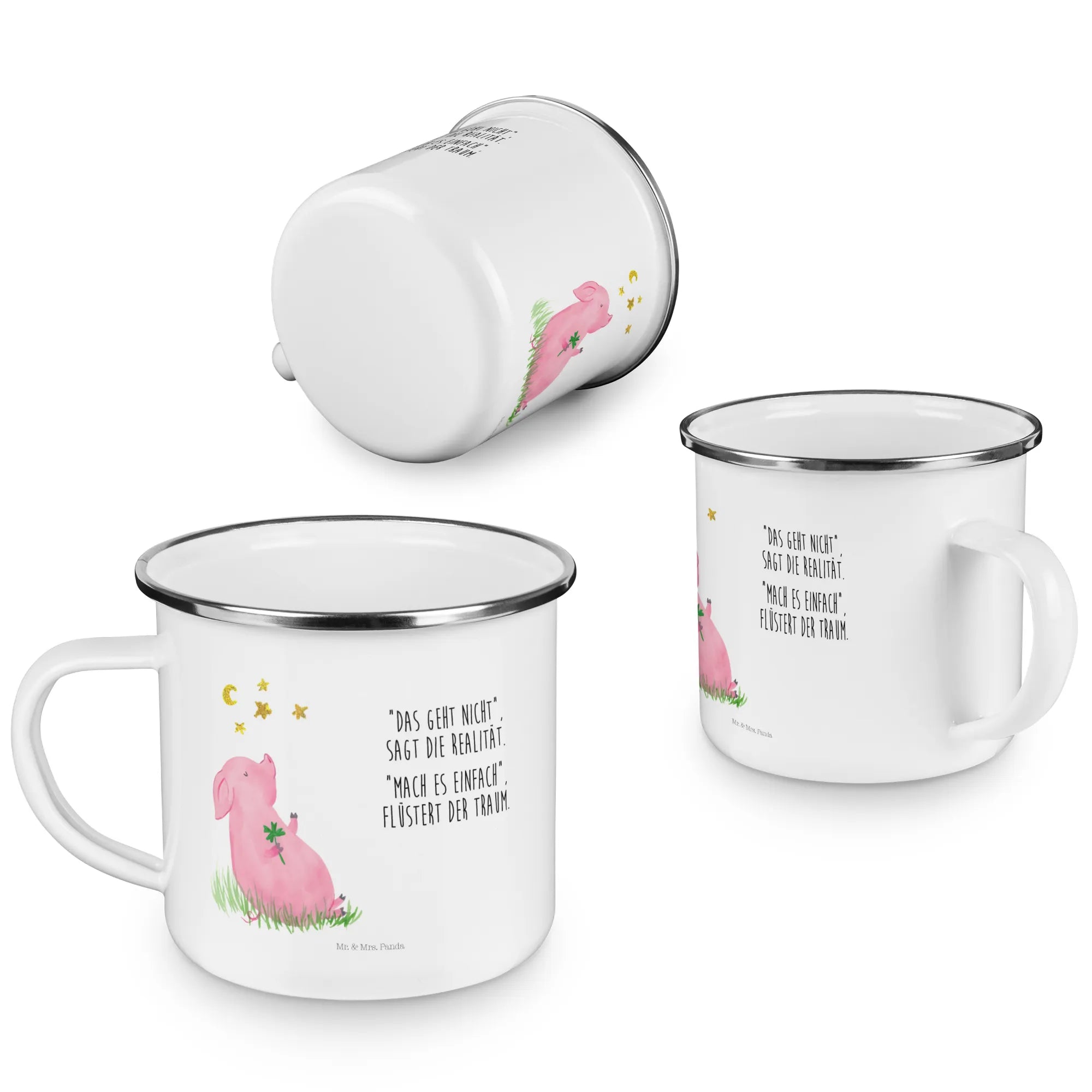Kempingowy kubek emaliowany świnia Szczęście - z napisem - Biały