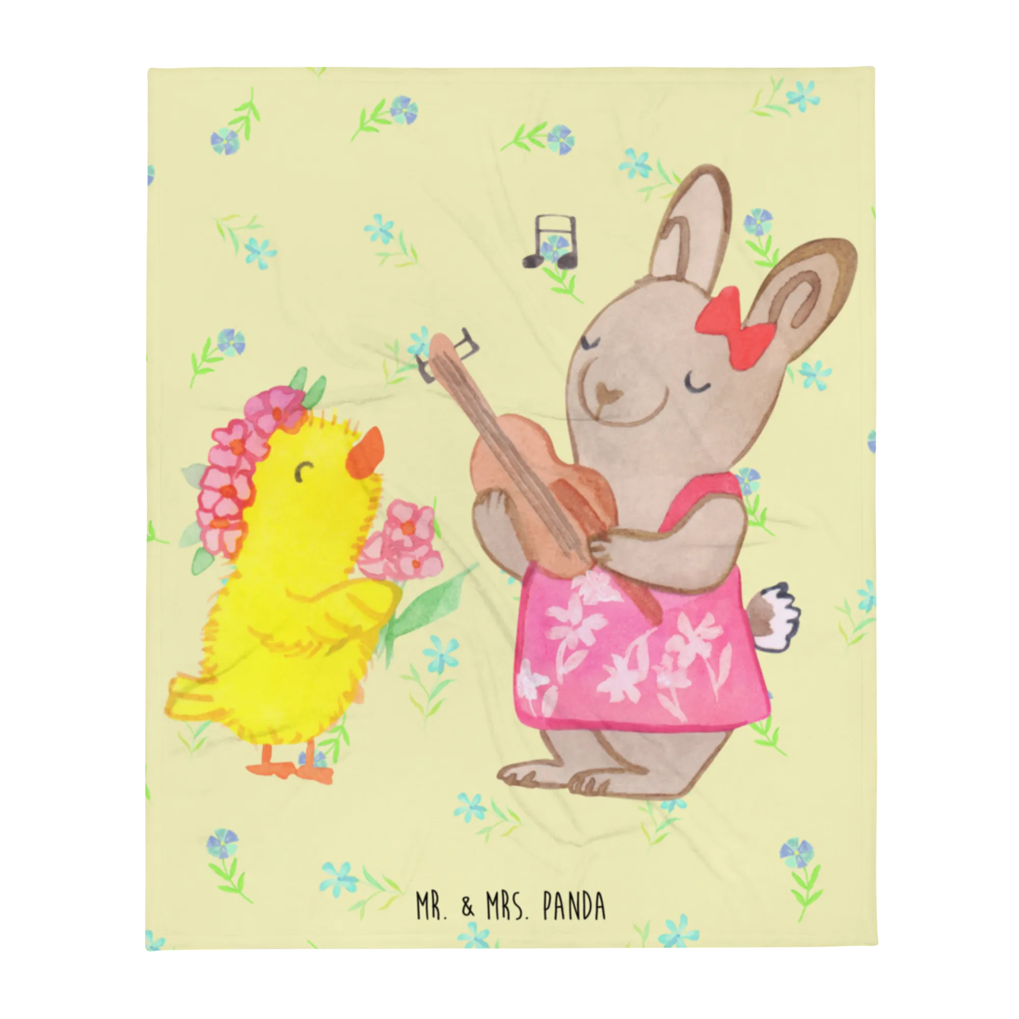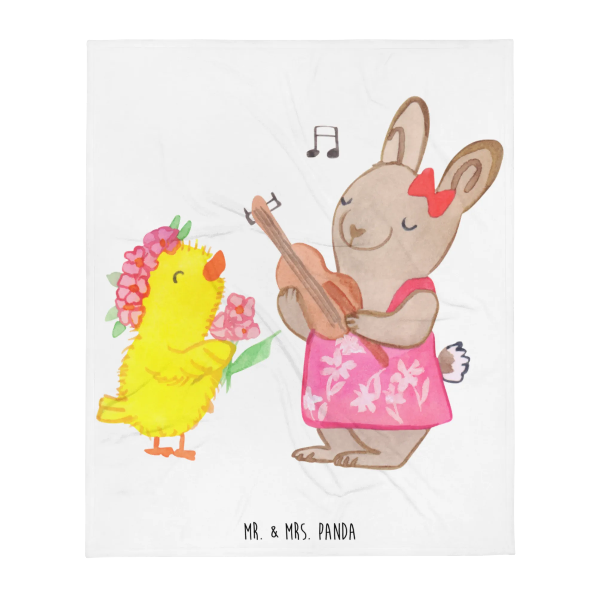 Diese hochwertige und wunderschöne Kuscheldecke ist mit einem süßen Motiv von einem fröhlichen Hasen in einem Sommerkleid, der einem niedlichen Küken ein Lied auf der Gitarre vorspielt, bedruckt. Mit ihrem einseitigen Druck und den super leuchtenden Farben bringt sie Frühlingsgefühle direkt in dein Zuhause.