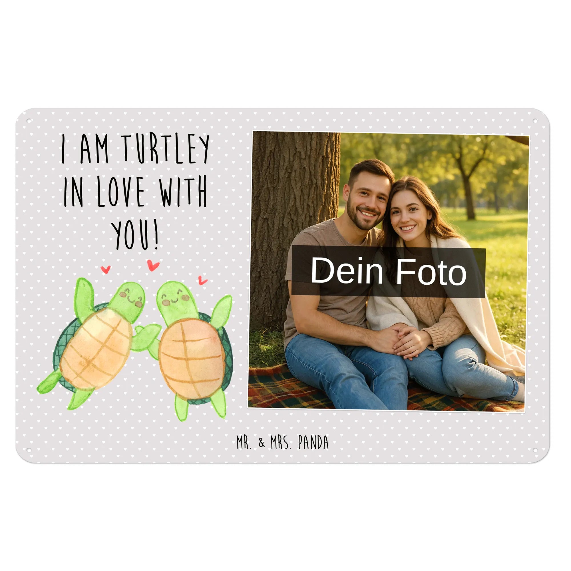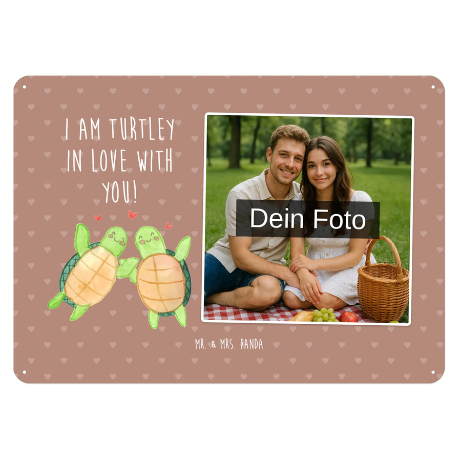 Ein persönliches Geschenk, das von Herzen kommt: Das personalisierte Foto Blechschild „Schildkröten Paar“ aus der Liebe-Kollektion von Mr. & Mrs. Panda vereint Dein Wunschfoto mit einem zuckersüßen Motiv und dem Spruch „I am turtley in love with you!“. Dieses Retro Blechschild mit Foto eignet sich perfekt als Liebesgeschenk zum Jahrestag, Valentinstag, zur Verlobung oder zum Hochzeitstag.