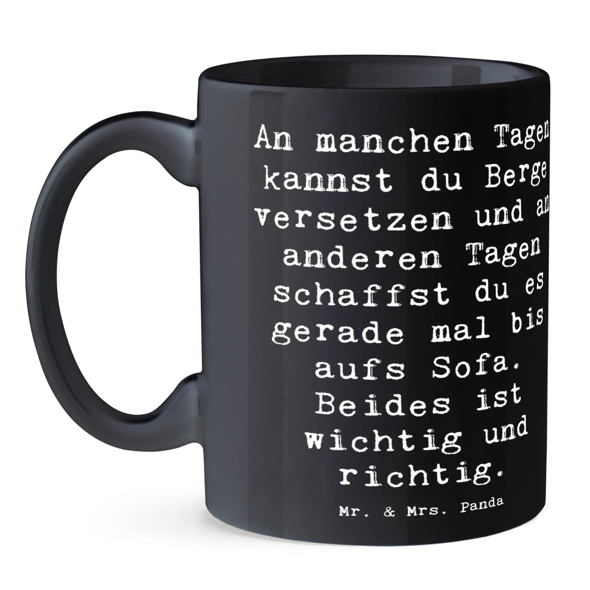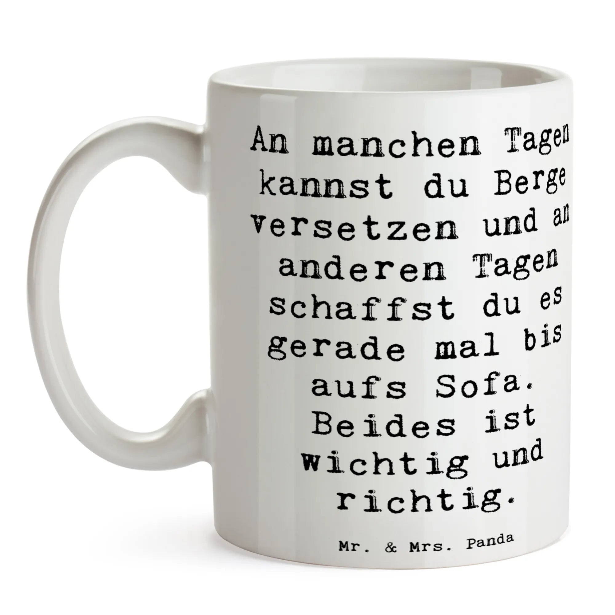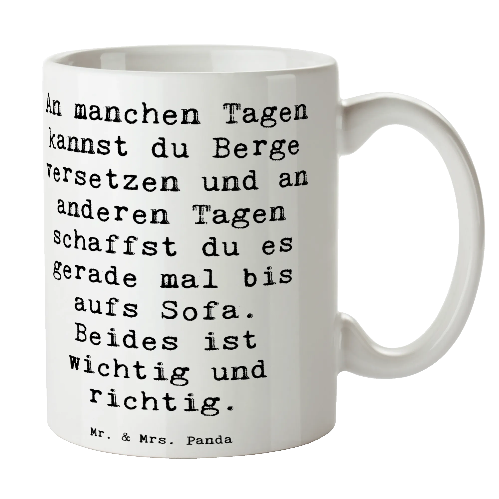 Diese Kaffeetasse aus der Kollektion Gefühle & Stimmungen trägt den liebevollen Spruch: „An manchen Tagen kannst du Berge versetzen und an anderen Tagen schaffst du es gerade mal bis aufs Sofa. Beides ist wichtig und richtig.“ Ein Satz, der tröstet, ermutigt und daran erinnert, dass es in Ordnung ist, verschieden zu sein – so wie die Tage auch.