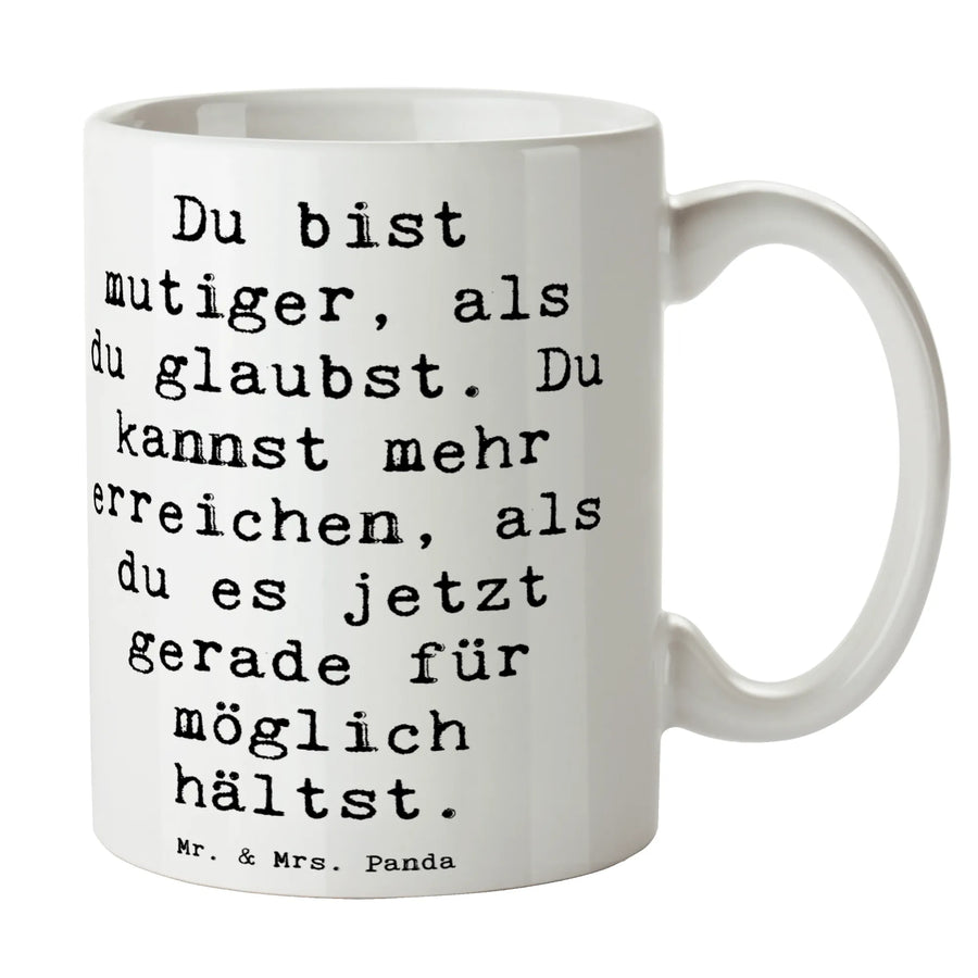 Du suchst nach dem perfekten Geschenk für jemanden, der gerade neuen Mut und Tapferkeit braucht? Die Tasse Tapferkeit aus der Kollektion Gefühle & Stimmungen von Mr. & Mrs. Panda ist genau das Richtige! Diese wunderschöne Keramiktasse, toll bedruckt mit dem inspirierenden Spruch "Du bist mutiger, als du glaubst. Du kannst mehr erreichen, als du es jetzt gerade für möglich hältst.", eignet sich hervorragend für alle, die eine kleine Aufmunterung im Alltag benötigen.