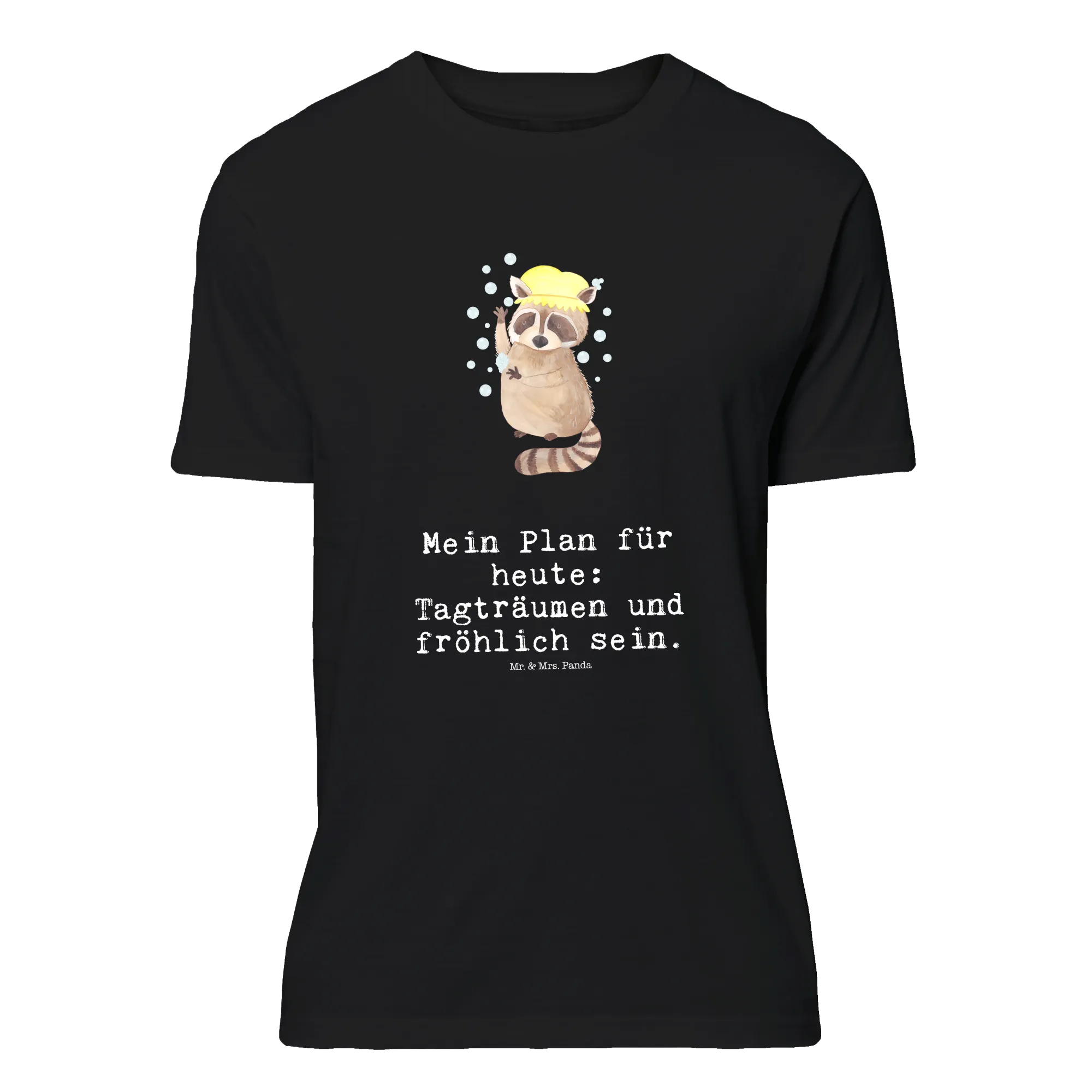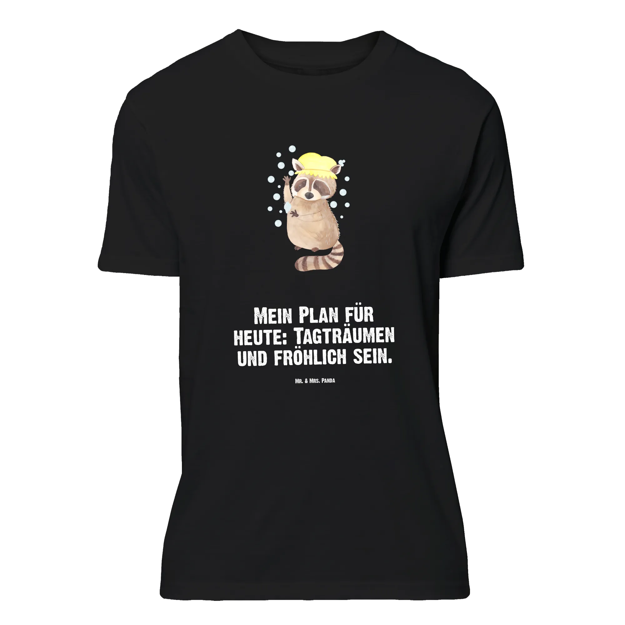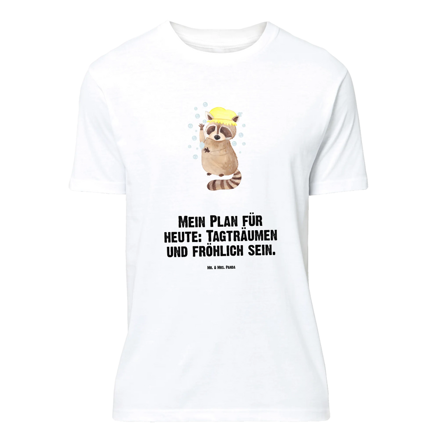 Der freche Waschbär steht vergnügt unter der Dusche, Seifenblasen tanzen um ihn herum und der Spruch „Mein Plan für heute: Tagträumen und fröhlich sein.“ macht das Motiv zur perfekten Gute-Laune-Botschaft. Dieses T-Shirt eignet sich wunderbar als Geschenk für Geburtstag, Jubiläum oder als witziges Mitbringsel beim Junggesellenabschied.