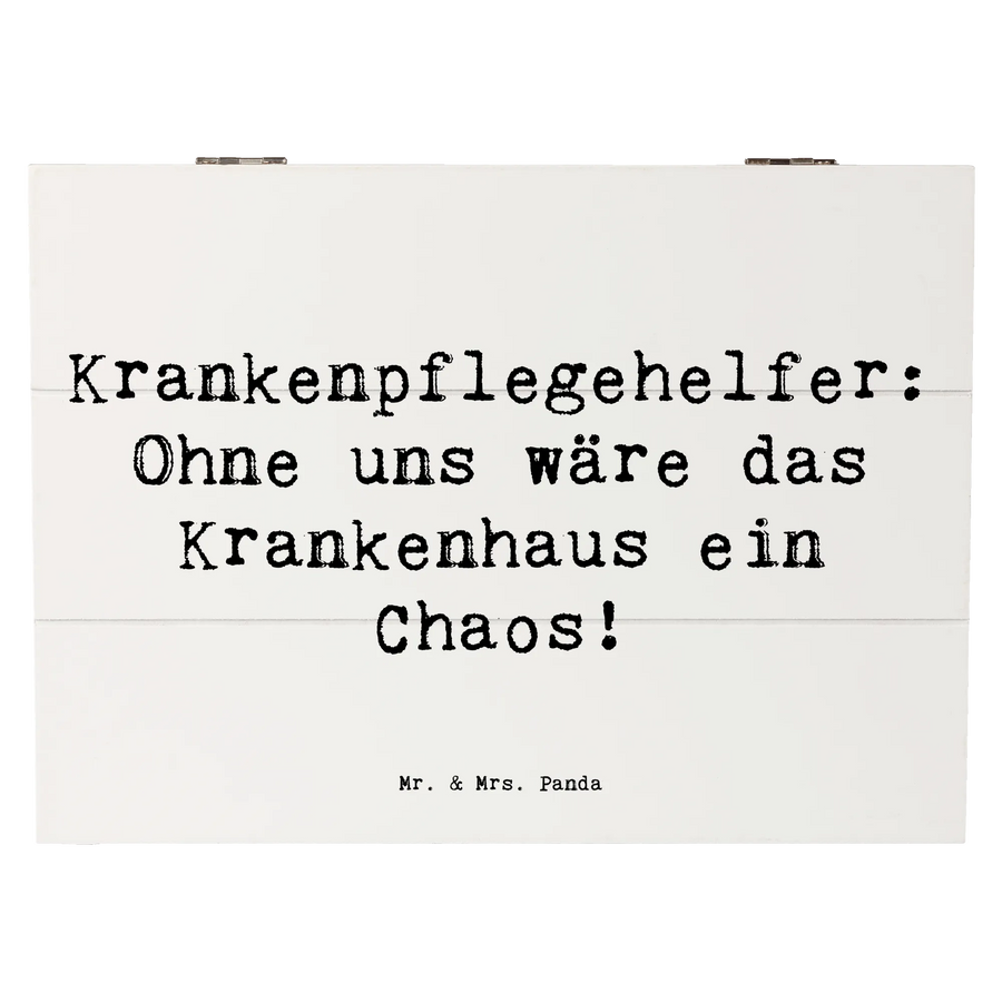 Die wunderschöne Holzkiste von Mr. & Mrs. Panda ist das perfekte Geschenk für alle, die in der Pflege tätig sind – insbesondere für Krankenpflegehelfer. Mit dem liebevollen Motiv "Krankenpflegehelfer: Ohne uns wäre das Krankenhaus ein Chaos!" bringt diese Kiste nicht nur Freude, sondern auch Wertschätzung für die oft unsichtbare und unverzichtbare Arbeit unserer Pflegehelden.