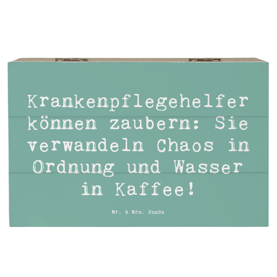 Entdecke die zauberhafte Holzkiste von Mr. & Mrs. Panda, die perfekt für Krankenpflegehelfer ist! Diese wunderschöne Kiste bietet nicht nur einen sicheren Aufbewahrungsort für all deine wertvollen Schätze, sondern bringt gleichzeitig auch einen Hauch von Humor in deinen Alltag. Mit dem einzigartigen Spruch "Krankenpflegehelfer können zaubern: Sie verwandeln Chaos in Ordnung und Wasser in Kaffee!" wird jeder, der diese Kiste sieht, an die außergewöhnlichen Fähigkeiten von Pflegekräften erinnert.