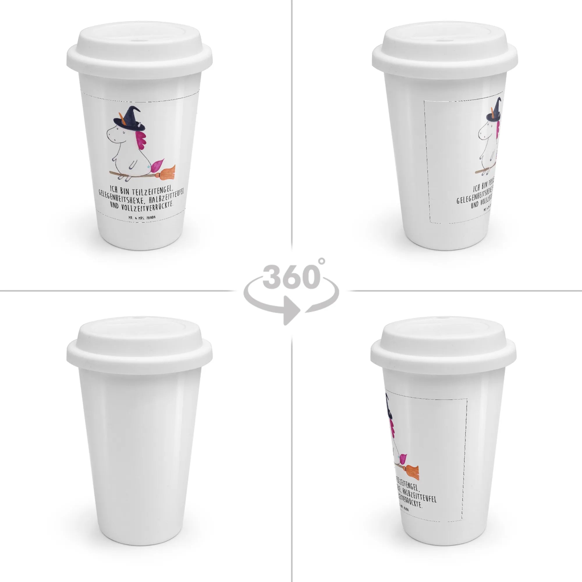 Zauberhaft, frech und absolut alltagstauglich: Unser Wunderschöner Coffee To Go Becher von Mr. & Mrs. Panda aus der Einhorn - Kollektion bringt Magie in Deinen Morgen. Das Motiv „Einhorn Hexe" zeigt ein süßes Einhorn mit Hexenhut auf einem Besen und wird von dem lustigen Spruch begleitet: „Ich bin Teilzeitengel, Gelegenheitshexe, Halbzeitteufel und Vollzeitverrückte." Ein echtes Statement für alle Einhorn-Fans, die das Leben nicht langweilig mögen. 🦄✨