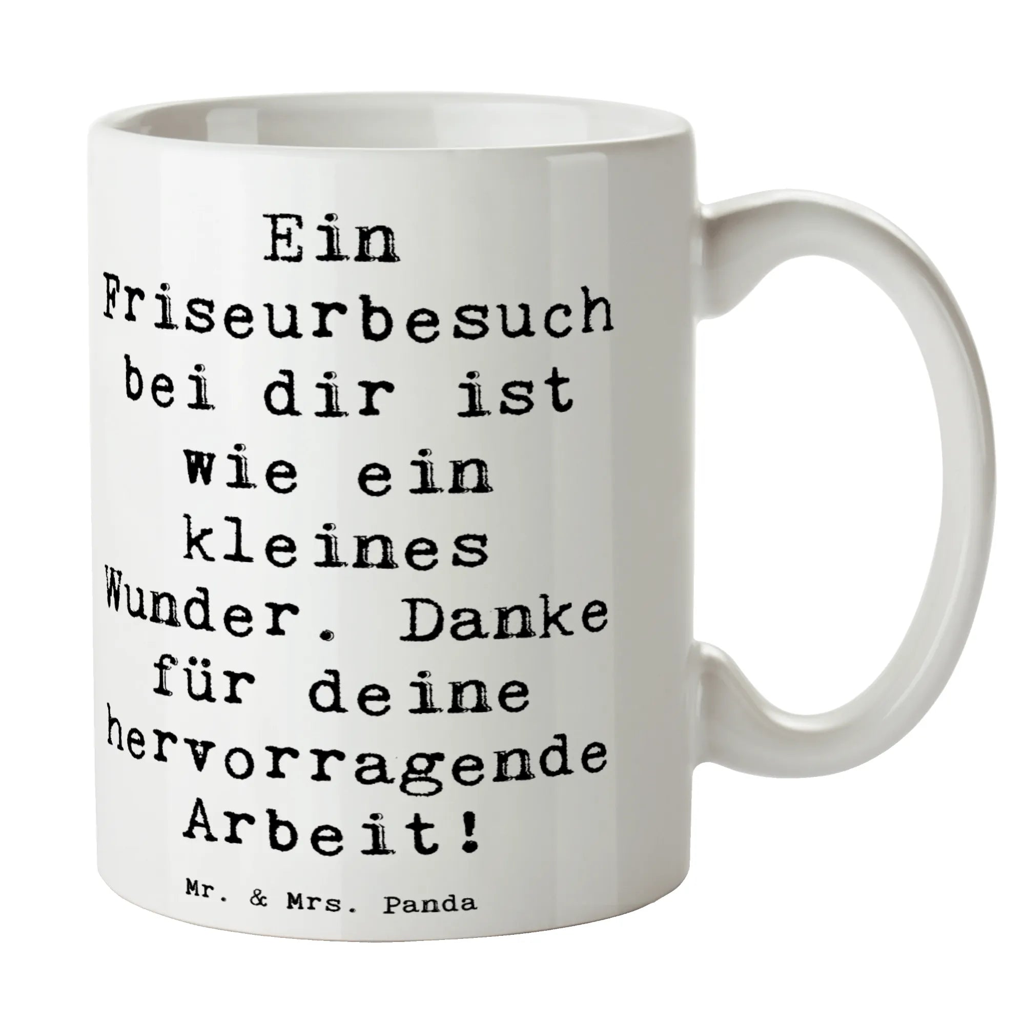 Mit dem liebevollen Spruch 'Ein Friseurbesuch bei dir ist wie ein kleines Wunder. Danke für deine hervorragende Arbeit!' wird dein Dank ganz besonders unterstrichen. Die Tasse hat eine Füllmenge von 325 ml und besitzt eine besonders glänzende Oberfläche, die dafür sorgt, dass sie auch nach vielen Spülgängen ihren Charme behält.