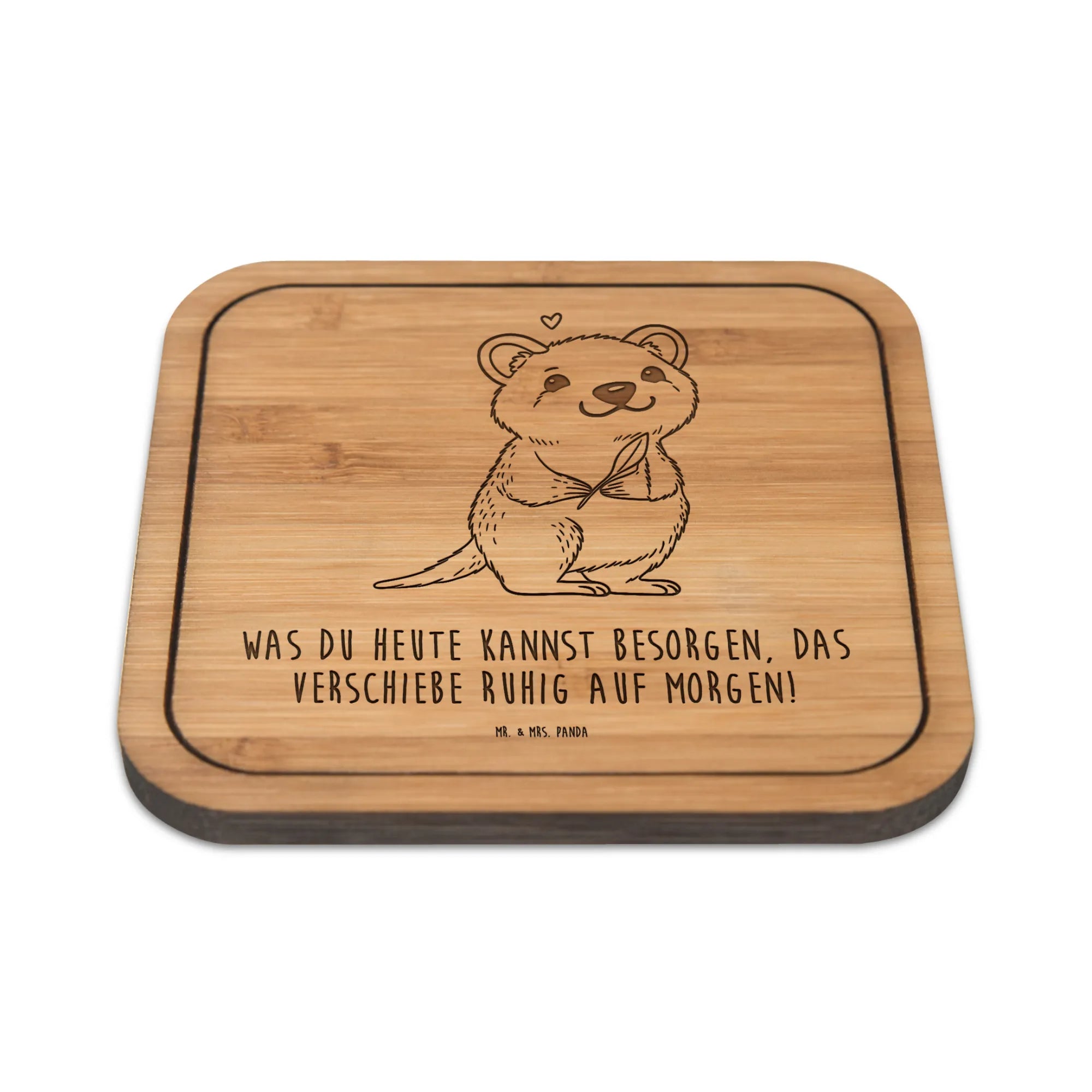 Ein kleines, fröhliches Accessoire für deinen Tisch: Der Untersetzer mit dem niedlichen Quokka aus der Small World Kollektion bringt sofort gute Laune in Küche, Wohnzimmer oder Büro. Das Quokka lächelt dich an, hält ein grünes Blatt in den Pfoten und über seinem Kopf schwebt ein zartes rosa Herz. Dazu der freche Spruch: „Was du heute kannst besorgen, das verschiebe ruhig auf morgen!“ – perfekt für Genießer und Aufschieber mit Humor. 😊