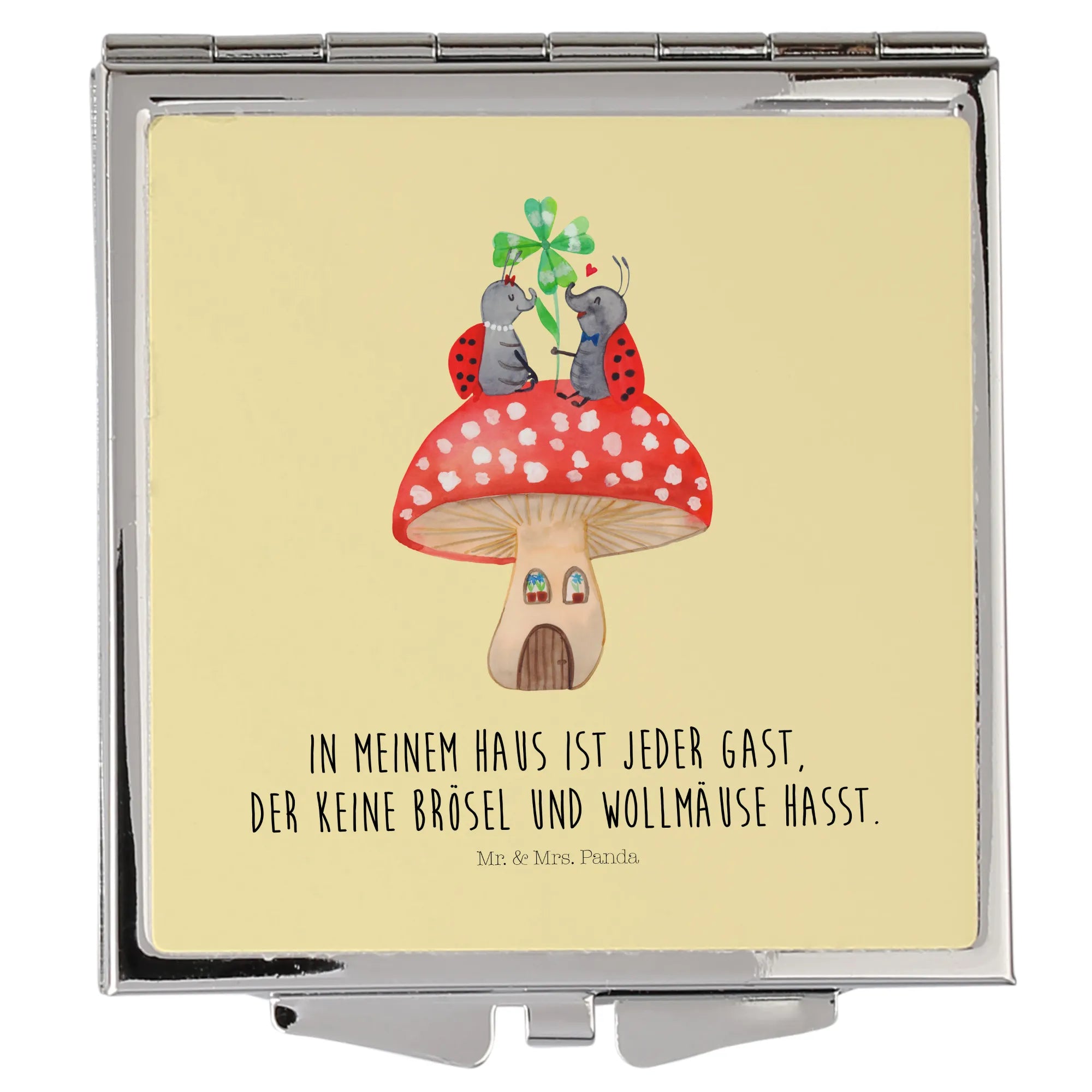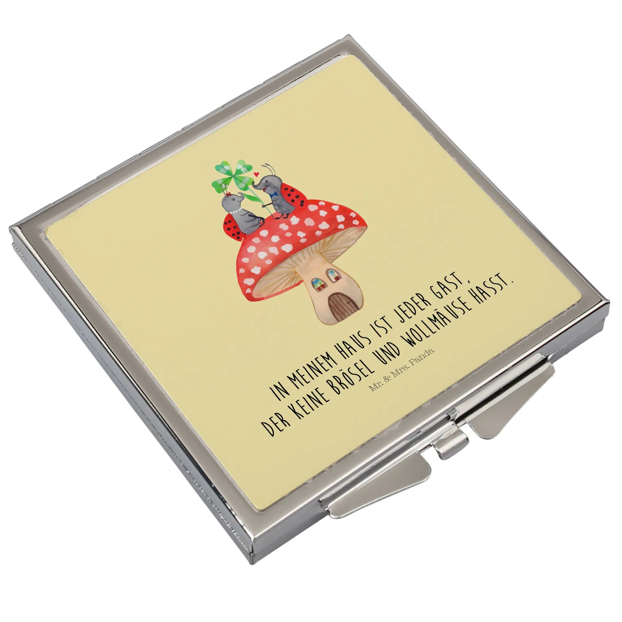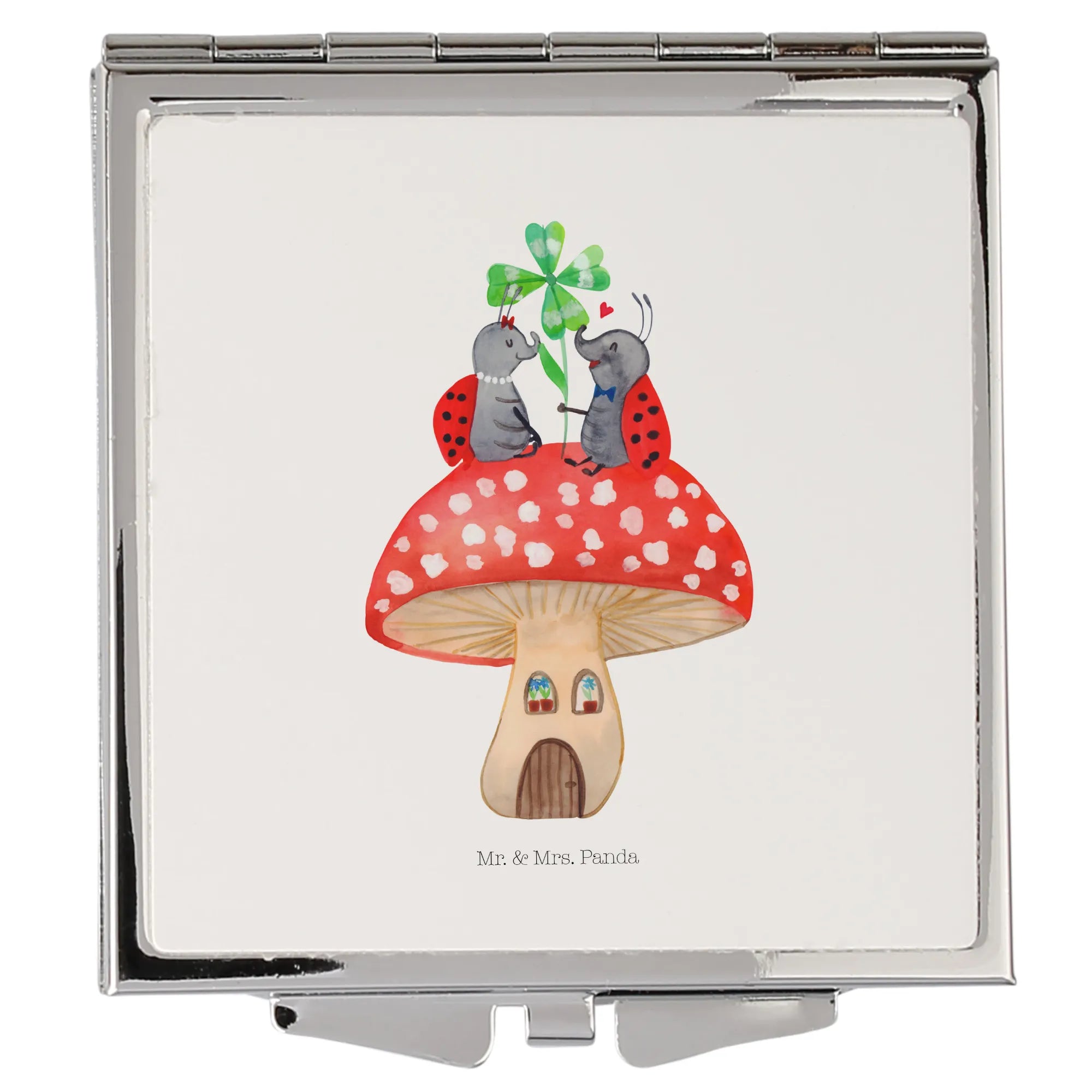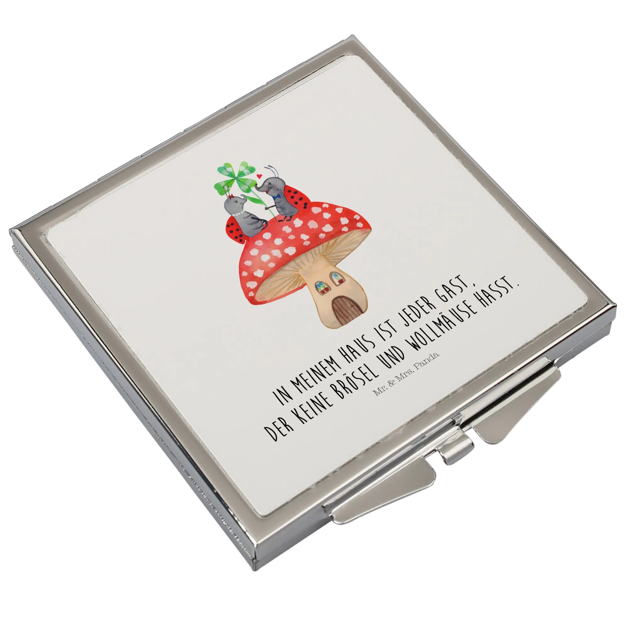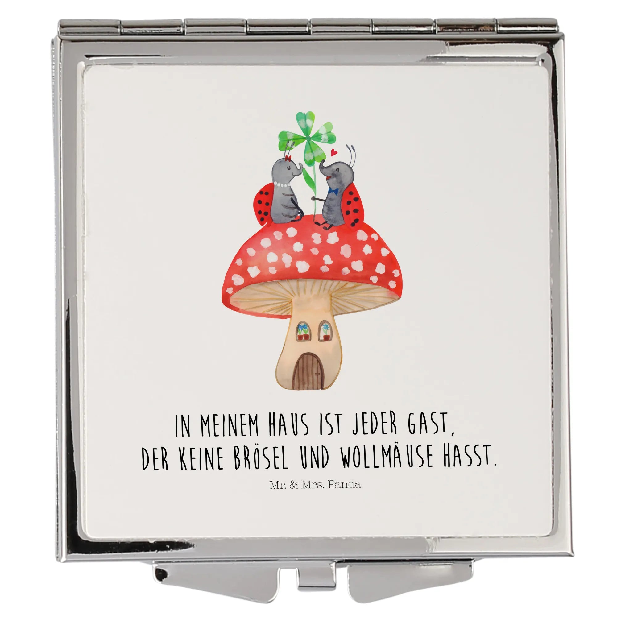Kwadratowe lusterko do torebki biedronka Muchomor - z napisem - biały