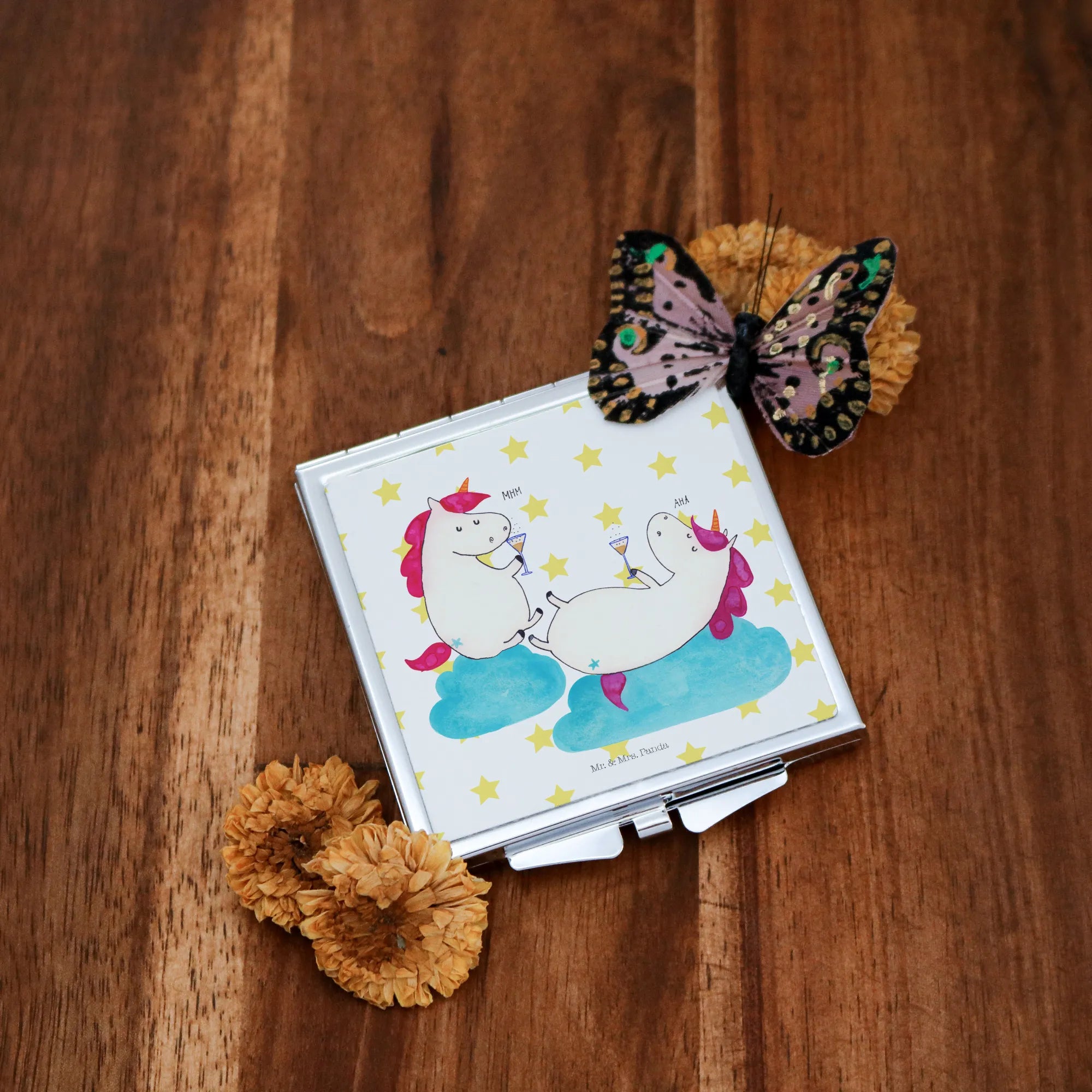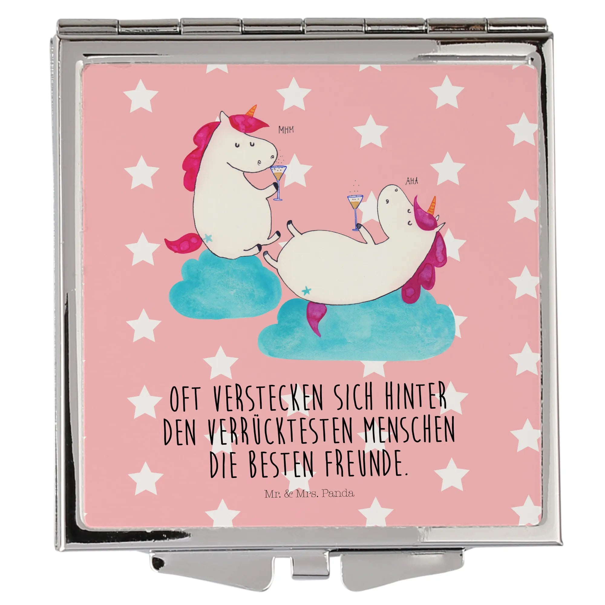 Ein kleiner Spiegel, große Freude: Der quadratische Handtaschenspiegel „Einhörner Sekt“ von Mr. & Mrs. Panda bringt Glitzer, Spaß und praktische Funktion in Deinen Alltag. Zwei Einhörner, die gemeinsam Sekt schlürfen, zieren die Vorderseite und machen ihn zum perfekten Begleiter für Mädelsabend, Party oder als Geschenk für die beste Freundin.
