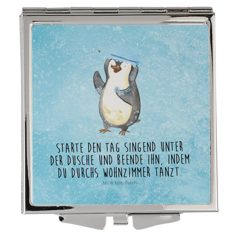Kwadratowe lusterko do torebki Pingwin Prysznic - z napisem - lodowoniebieski