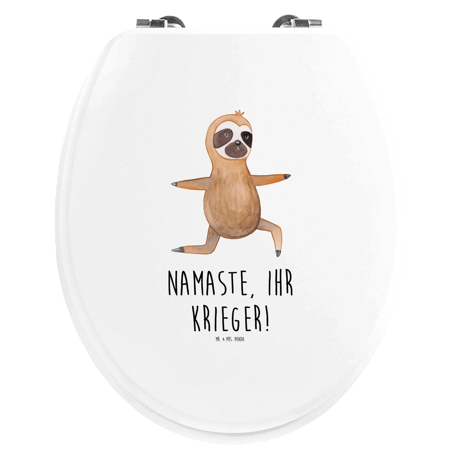 Wohlfühl-Design fürs Badezimmer: Der Motiv WC Sitz aus der Faultier - Kollektion von Mr. & Mrs. Panda verwandelt Dein Badezimmer in einen Ort der Entspannung und Lebensfreude. Das süße Faultier sitzt in der Yoga-Figur des Kriegers und strahlt Ruhe und Gelassenheit aus. Das farbenfrohe, handgezeichnete Motiv ist ein echter Blickfang und bringt Humor und Wärme in jeden Raum.