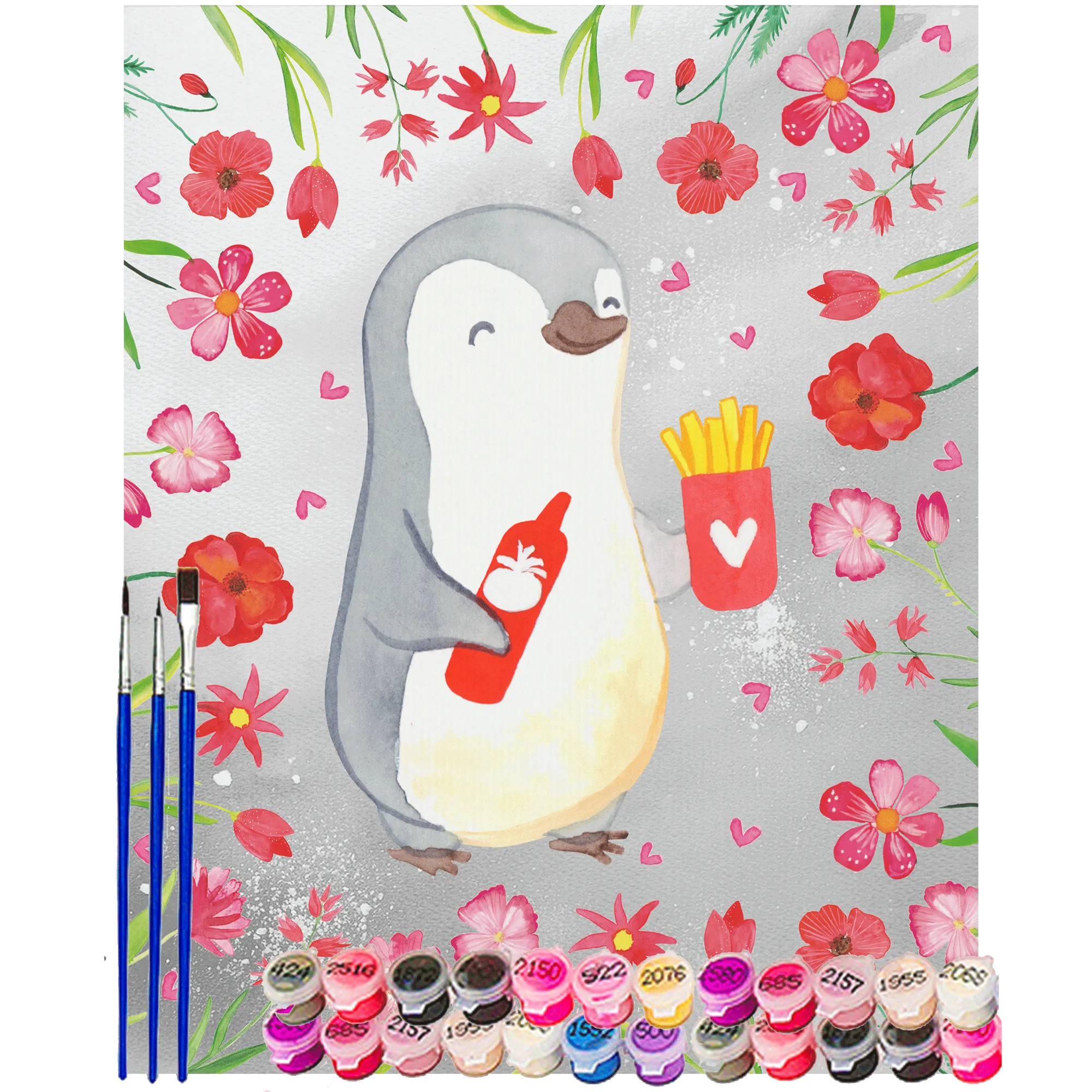 Entdecke die zauberhafte Welt des Malens mit unserem Malen nach Zahlen Set "Pinguin Pommes" aus der Kollektion Liebe von Mr. & Mrs. Panda! Dieses einzigartige Kunstwerk zeigt einen süßen, lächelnden Pinguin, der eine Portion Pommes und eine Flasche Ketchup in seinen Flügeln hält.