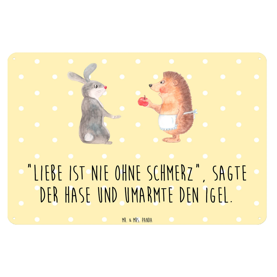 Das niedliche Blechschild "Liebe ist nie ohne Schmerz" von Mr. & Mrs. Panda ist die perfekte Deko für dein Zuhause oder als Geschenk für einen lieben Menschen. Mit dem süßen Motiv, das einen Igel und einen Hasen zeigt, wird dein Raum zum Verweilen und Träumen einladen. Ob als Wandschild in der Küche, im Wohnzimmer oder als Türschild für dein Schlafzimmer, dieses Schild bringt gute Laune in jeden Raum.