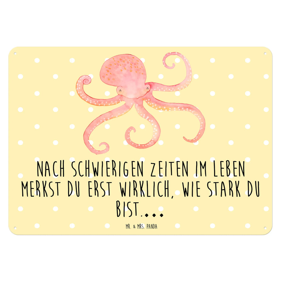 Das edle Blechschild mit dem fröhlichen Tintenfischmotiv ist der perfekte Begleiter für dein Zuhause! Mit einem liebevoll gestalteten Design von Mr. & Mrs. Panda bringt dieses Deko Schild nicht nur Farbe in deine Räume, sondern vermittelt auch eine positive Einstellung. Der Tintenfisch mit seinen vielen Armen winkt dir fröhlich zu und erinnert dich daran, dass nach schwierigen Zeiten im Leben jeder wirklich stark ist.