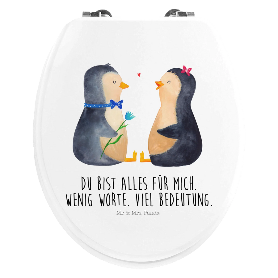 Perfektes Geschenk für Verliebte: Unser Motiv WC Sitz „Pinguin Pärchen" von Mr. & Mrs. Panda ist ein liebevoll gestalteter Toilettensitz, der Design und Emotion verbindet. Zwei süße Pinguine schauen sich verliebt an und der Slogan „Du bist alles für mich. Wenig Worte. Viel Bedeutung.“ macht ihn zum idealen Liebesgeschenk für Hochzeit, Verlobung oder Jahrestag.