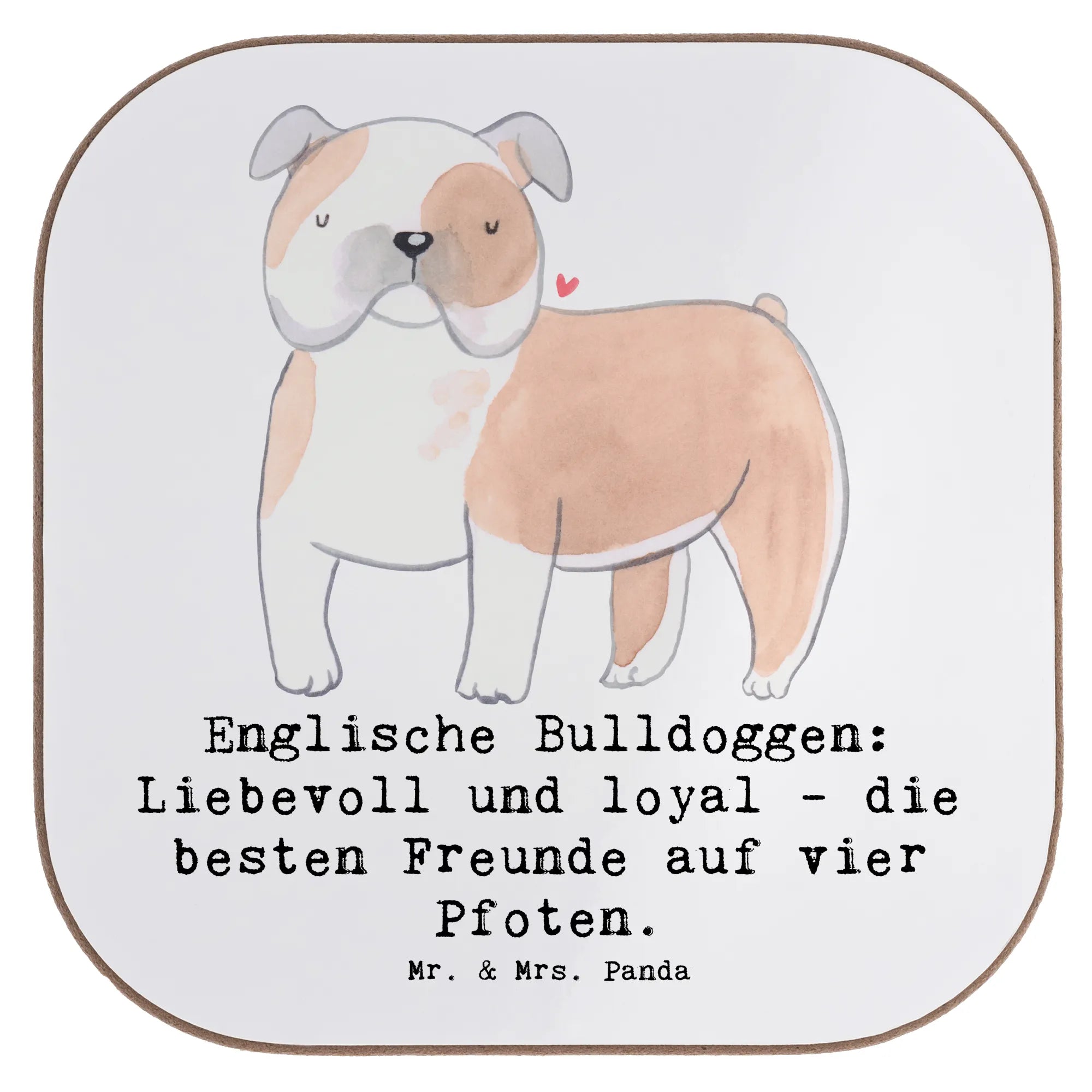 Du suchst ein Geschenk für Bulldoggen-Fans oder möchtest deinem Zuhause eine persönliche Note verleihen? Unser quadratischer Untersetzer aus der Hunderassen-Kollektion vereint liebevolle Illustration und nützlichen Schutz für Tischflächen. Das Motiv wurde von Mrs. Panda aquarelliert und trägt den charmanten Spruch: „Englische Bulldoggen: Liebevoll und loyal - die besten Freunde auf vier Pfoten.“