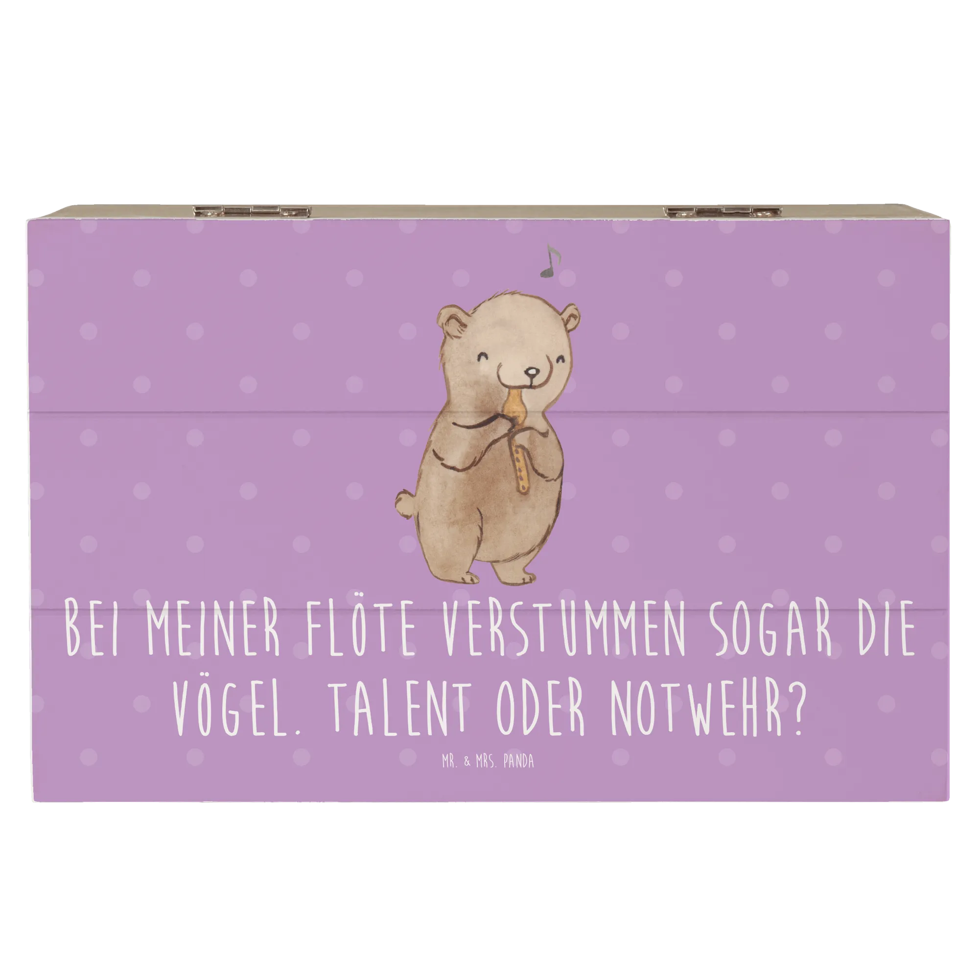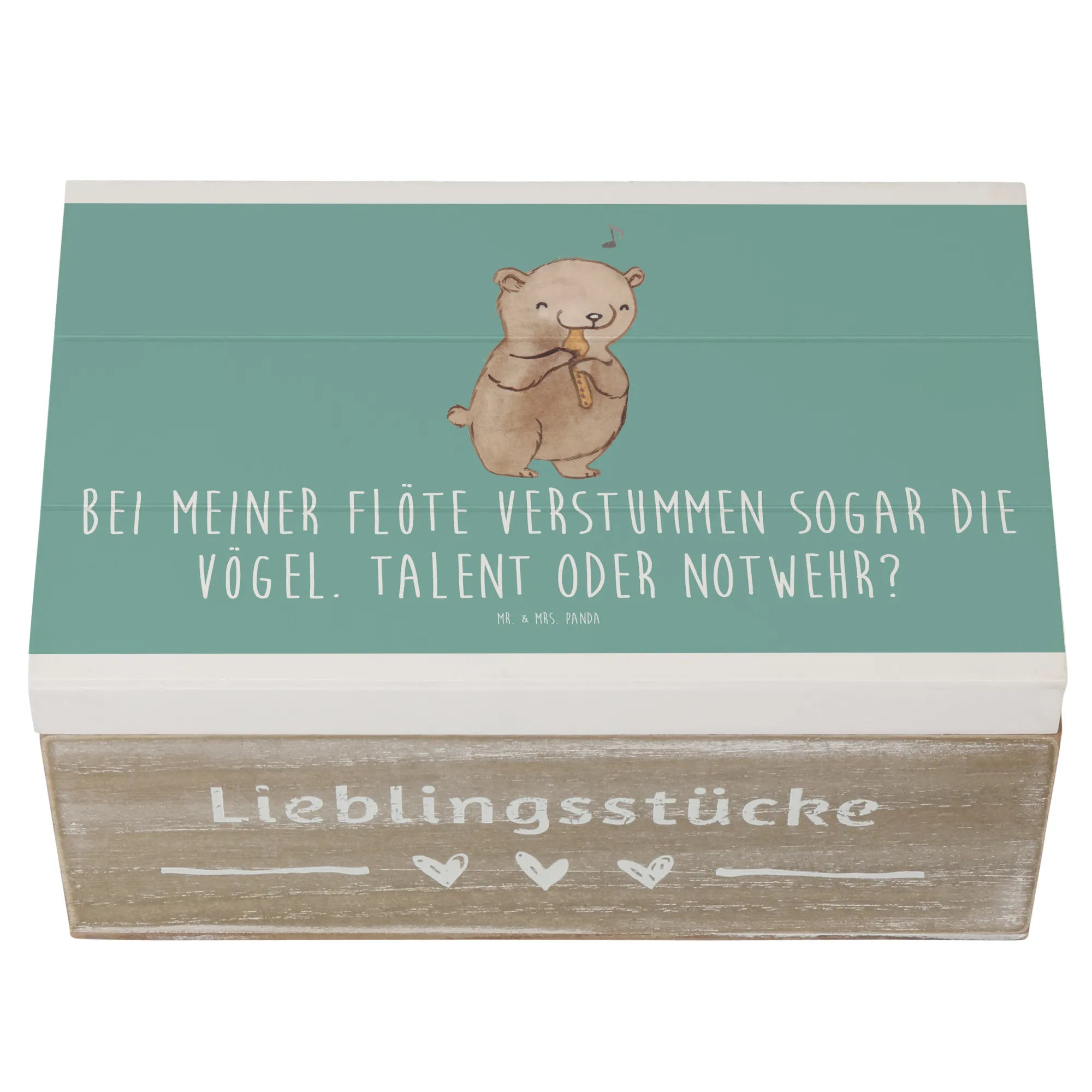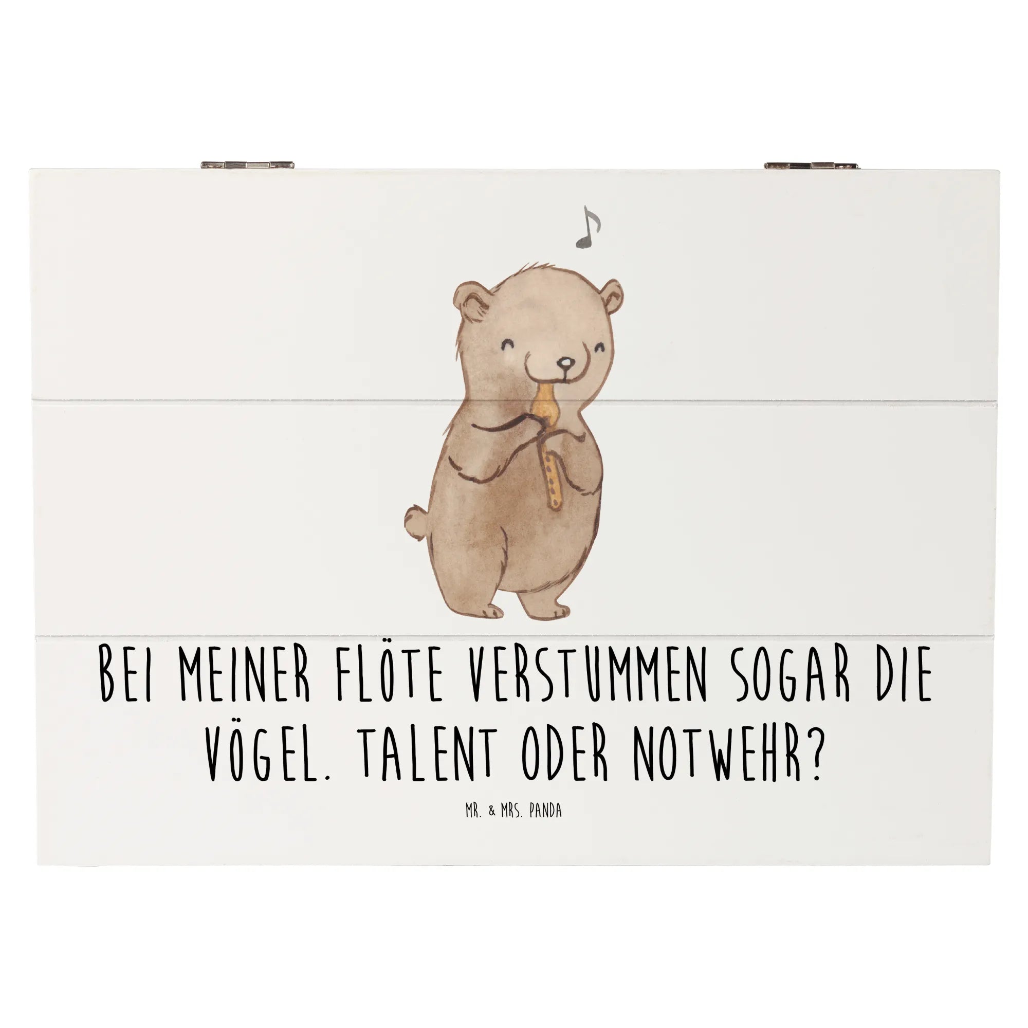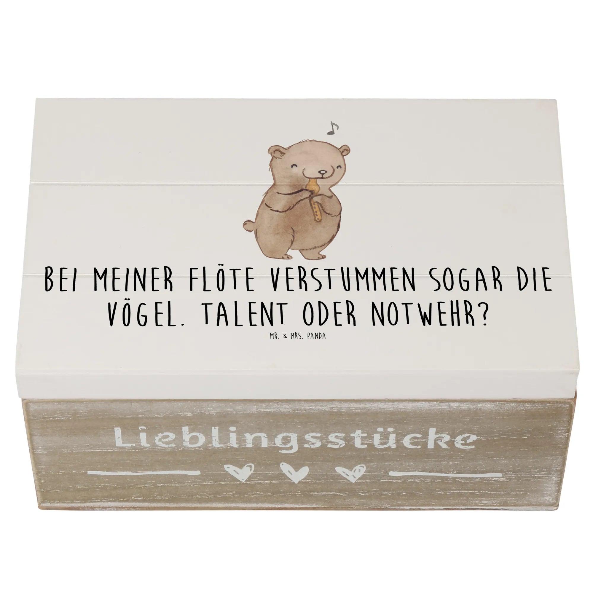 Mit den Maßen 190 mm x 120 mm x 100 mm bietet sie ausreichend Platz für Fotos, kleine Instrumente oder andere kostbare Dinge. Der Slogan „Bei meiner Flöte verstummen sogar die Vögel. Talent oder Notwehr?“ bringt nicht nur ein Lächeln ins Gesicht, sondern macht die Kiste zu einem ganz besonderen Unikat.