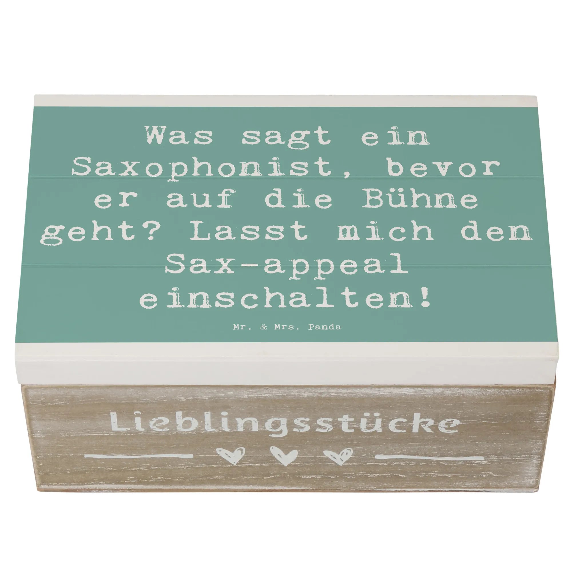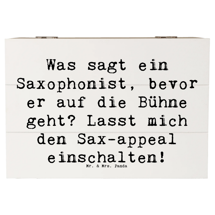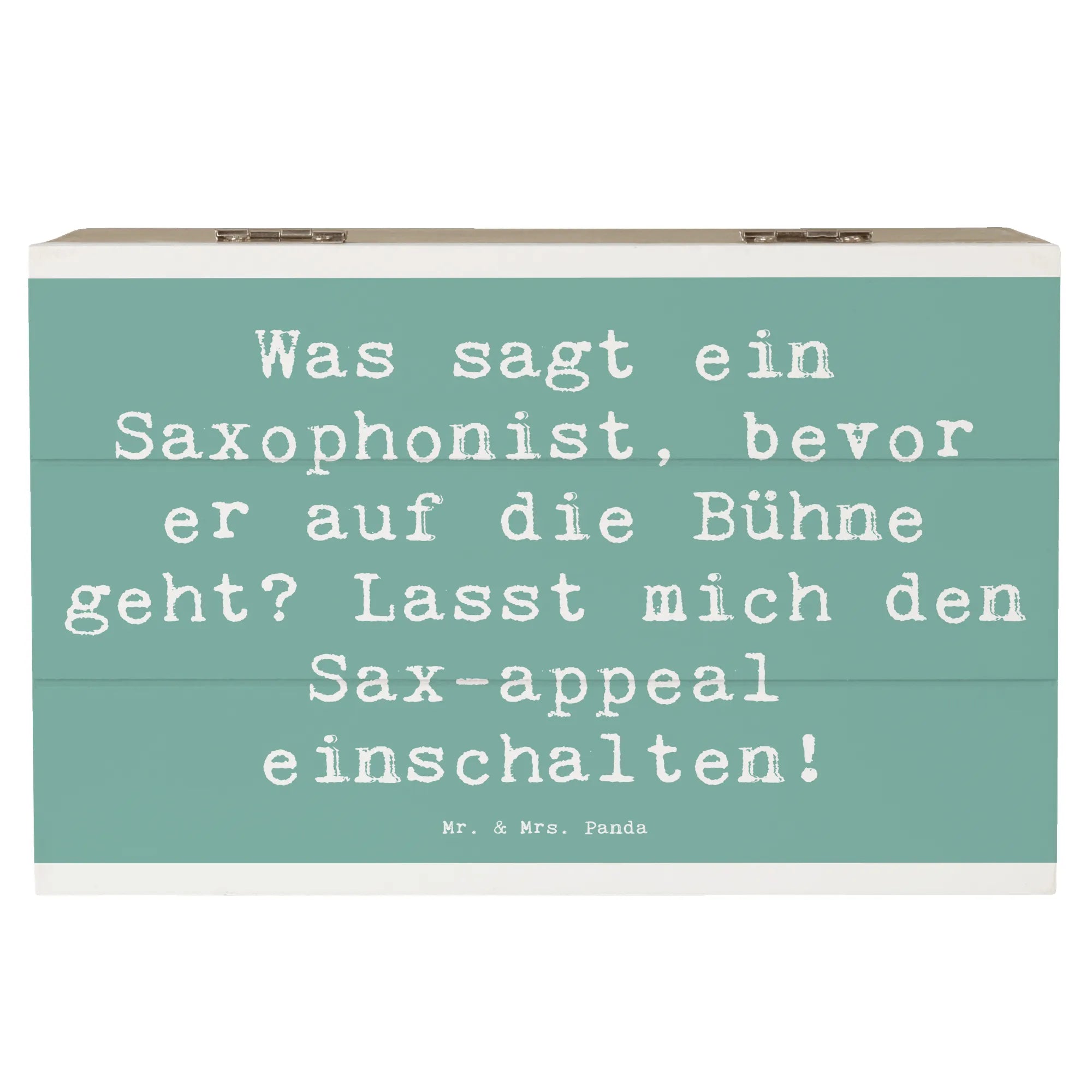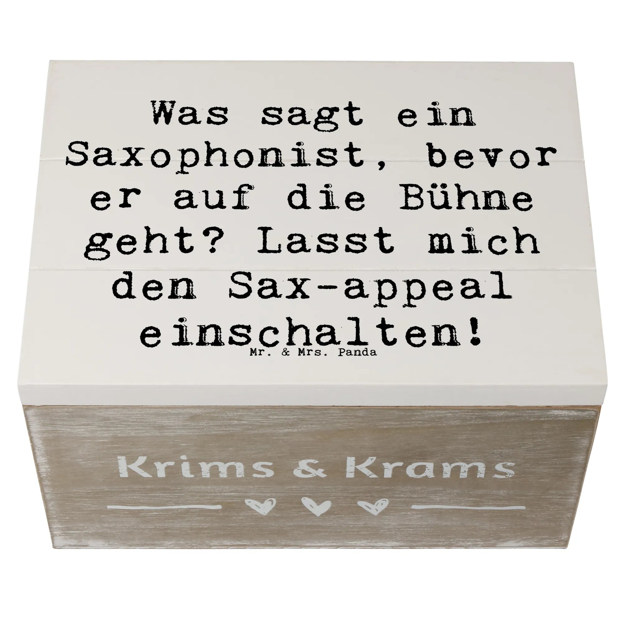 Die liebevoll gestaltete Kiste mit dem einzigartigen Saxophon-Motiv und dem spritzigen Spruch "Was sagt ein Saxophonist, bevor er auf die Bühne geht? Lasst mich den Sax-appeal einschalten!" bringt nicht nur Freude, sondern auch eine Portion Humor in dein Zuhause.