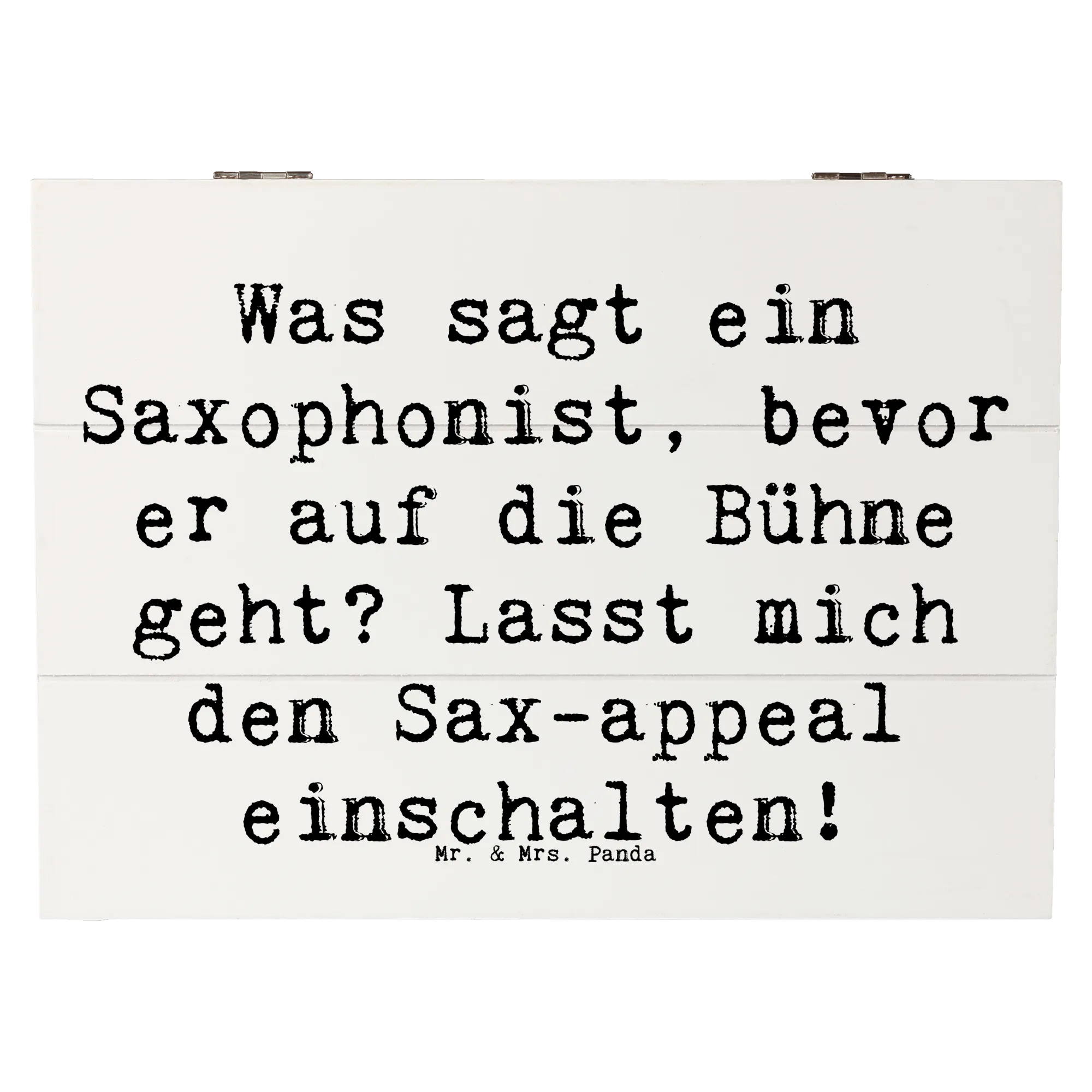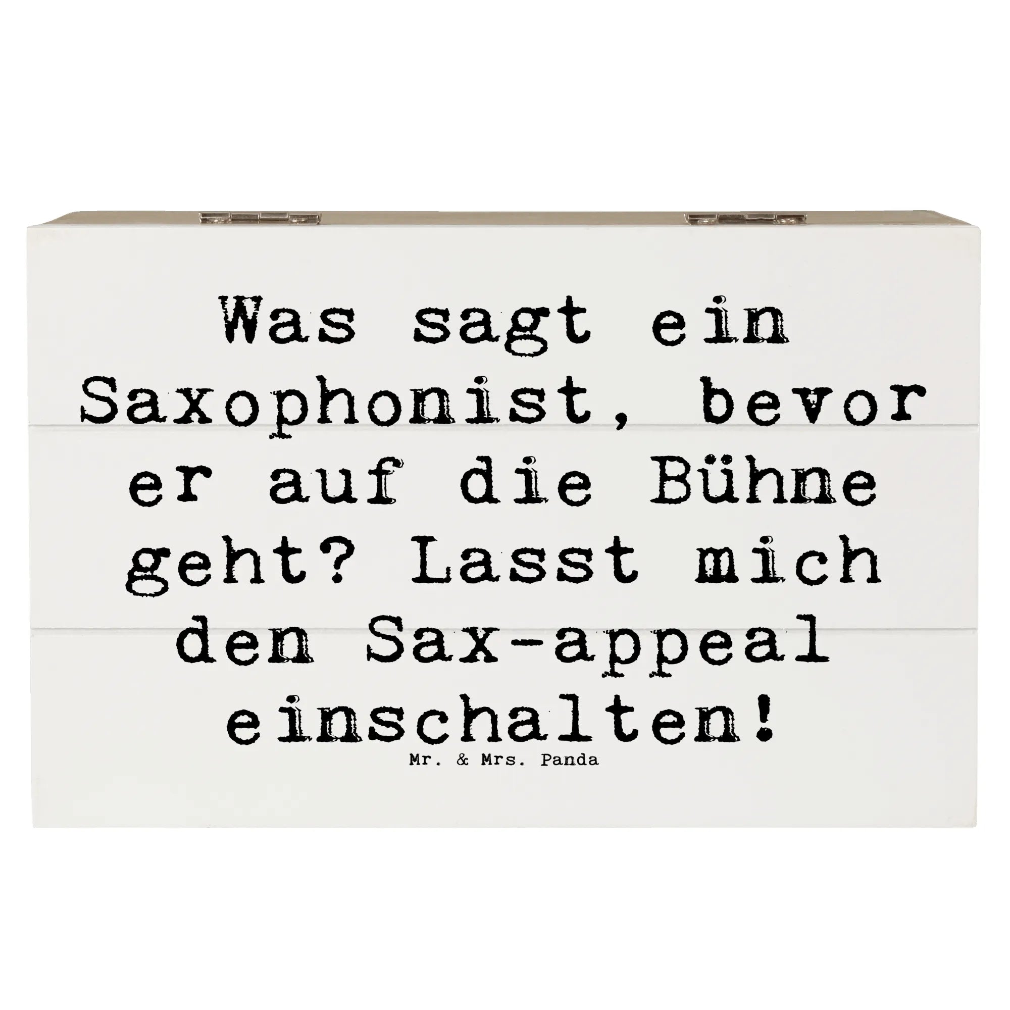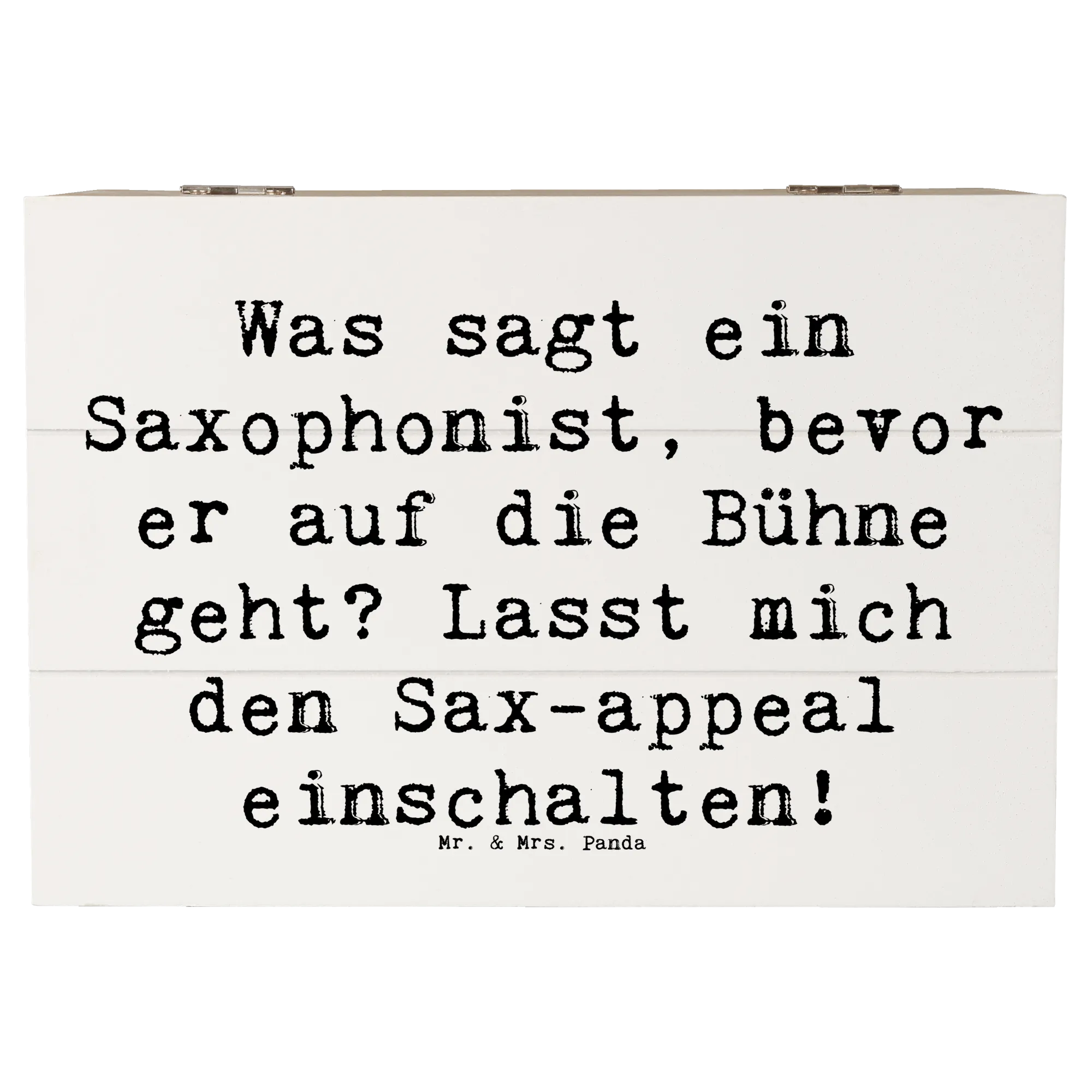 Die liebevoll gestaltete Kiste mit dem einzigartigen Saxophon-Motiv und dem spritzigen Spruch "Was sagt ein Saxophonist, bevor er auf die Bühne geht? Lasst mich den Sax-appeal einschalten!" bringt nicht nur Freude, sondern auch eine Portion Humor in dein Zuhause.
