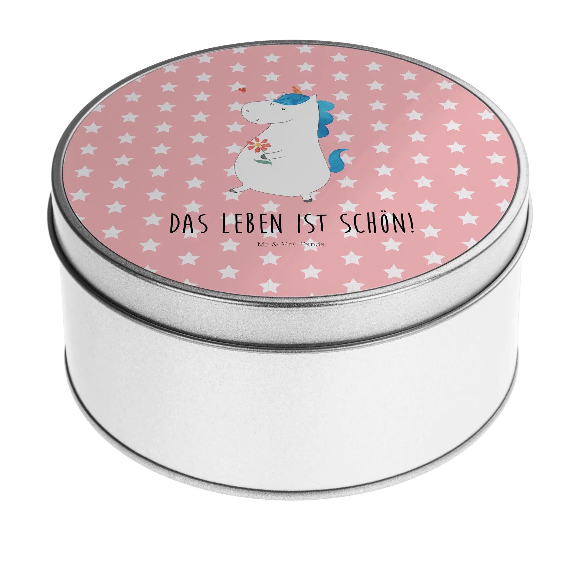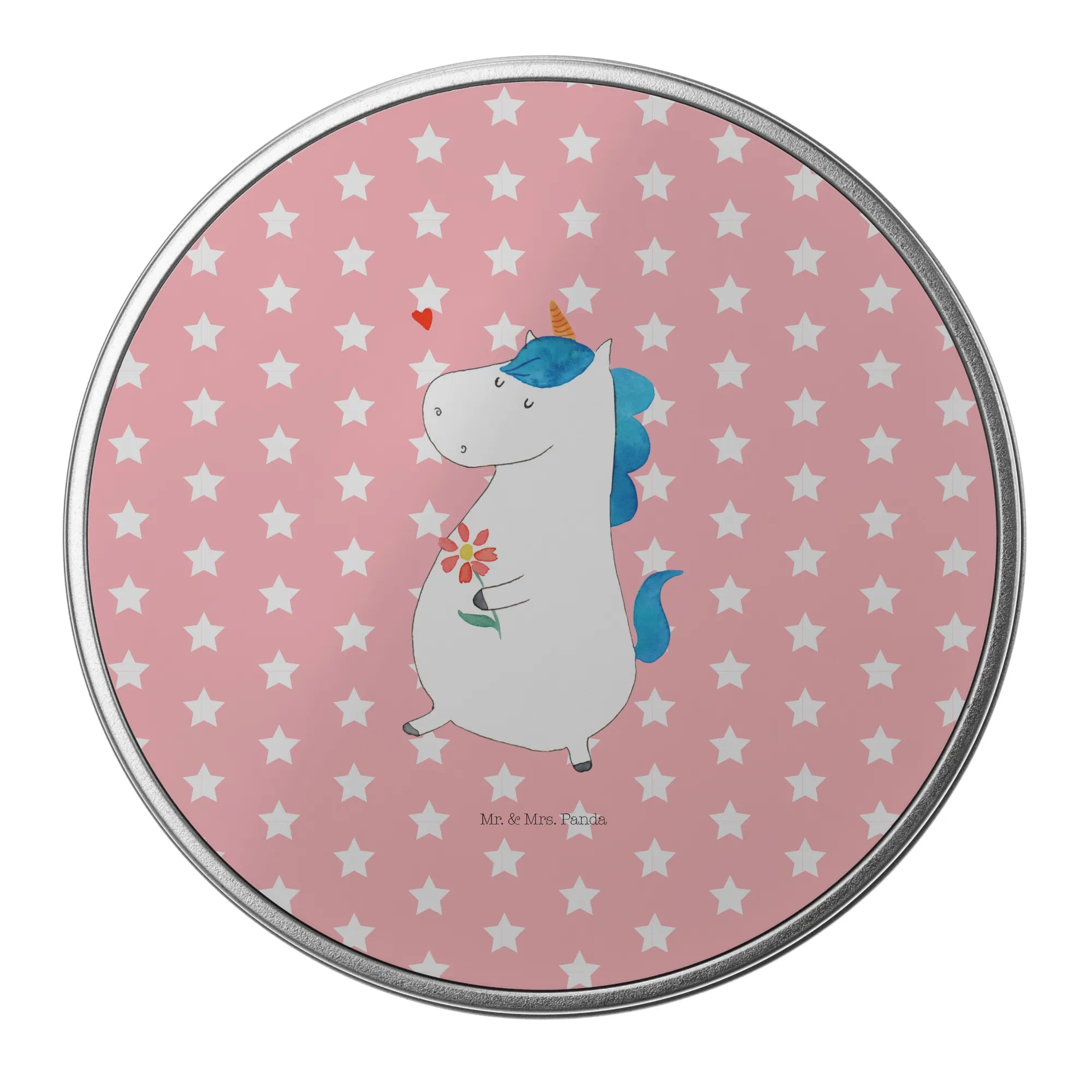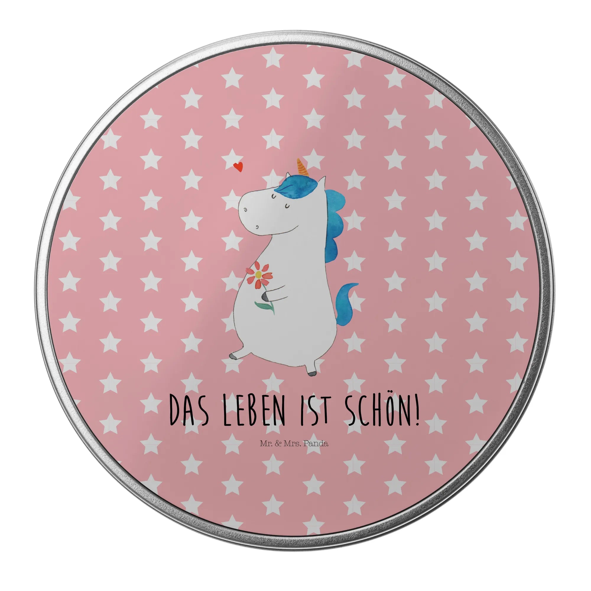 okrągła puszka z blachy Jednorożec spacer - z napisem
