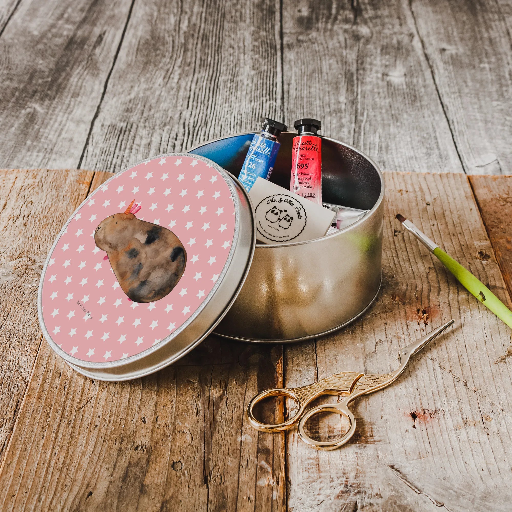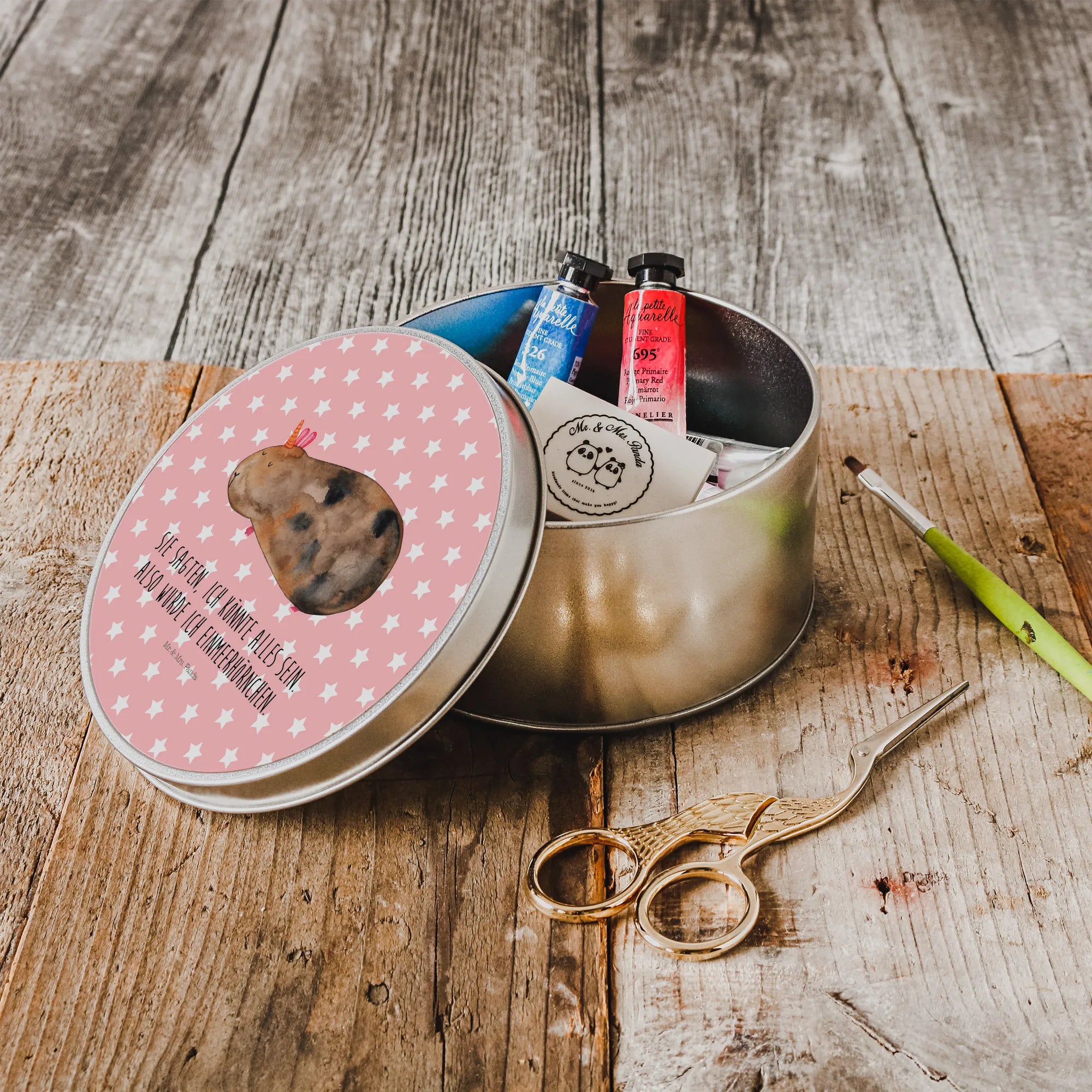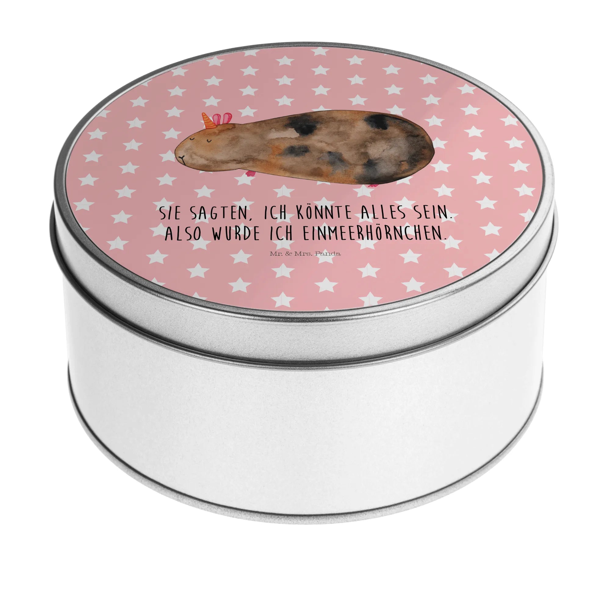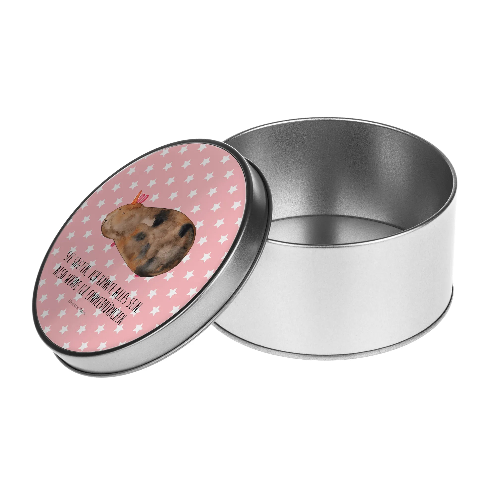 okrągła puszka z blachy Jednorożec świnka morska - z napisem