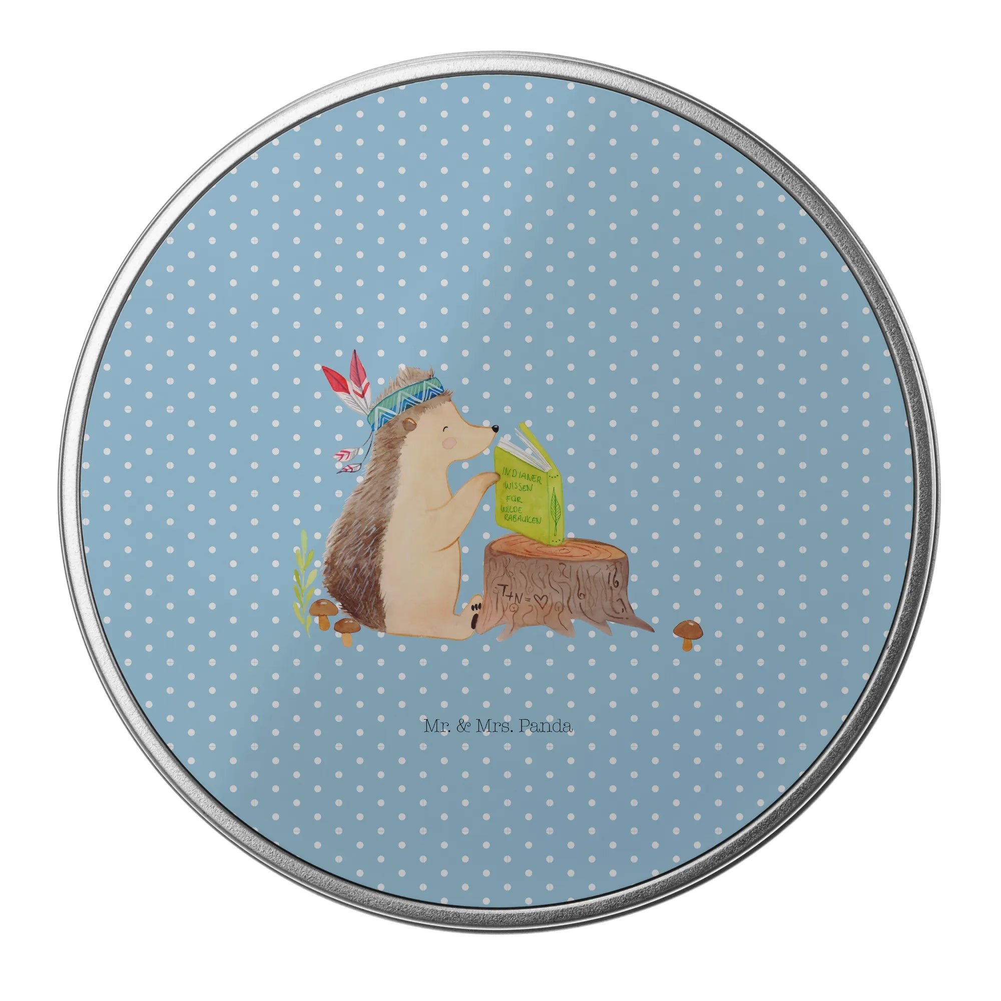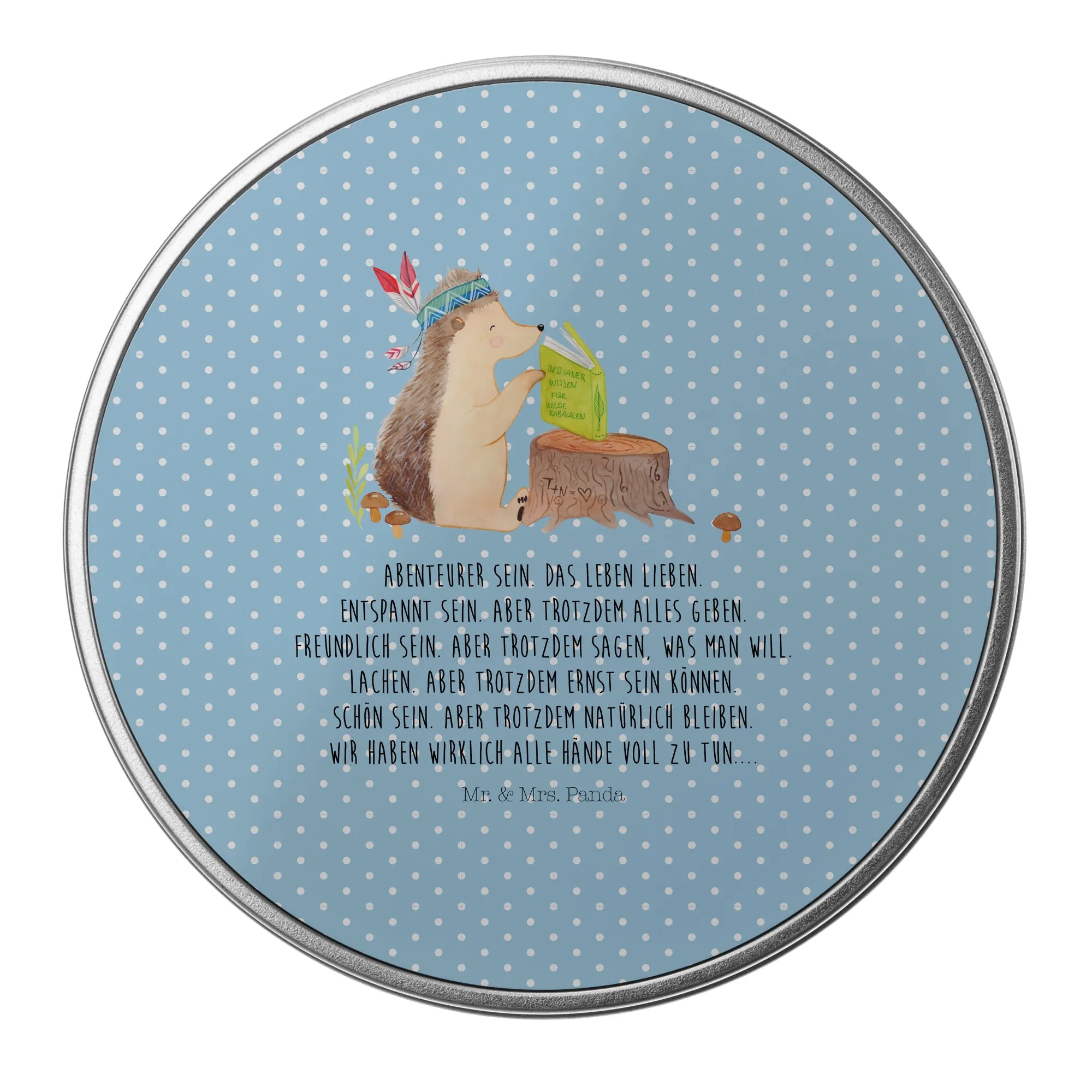 okrągła puszka z blachy jeż Ozdoba z piór - z napisem