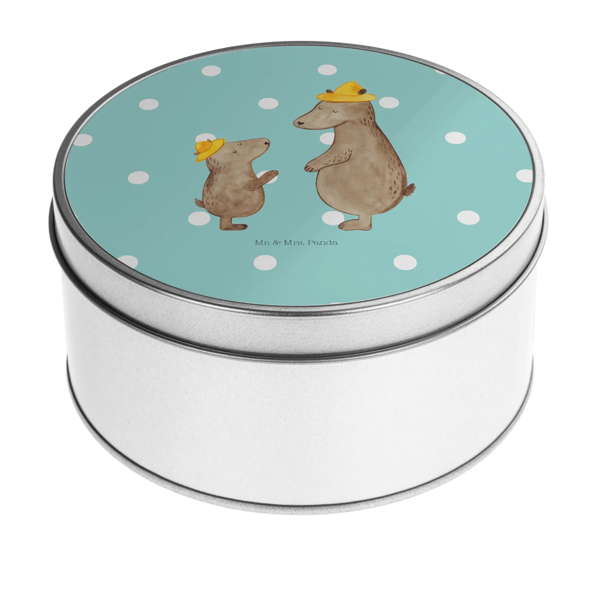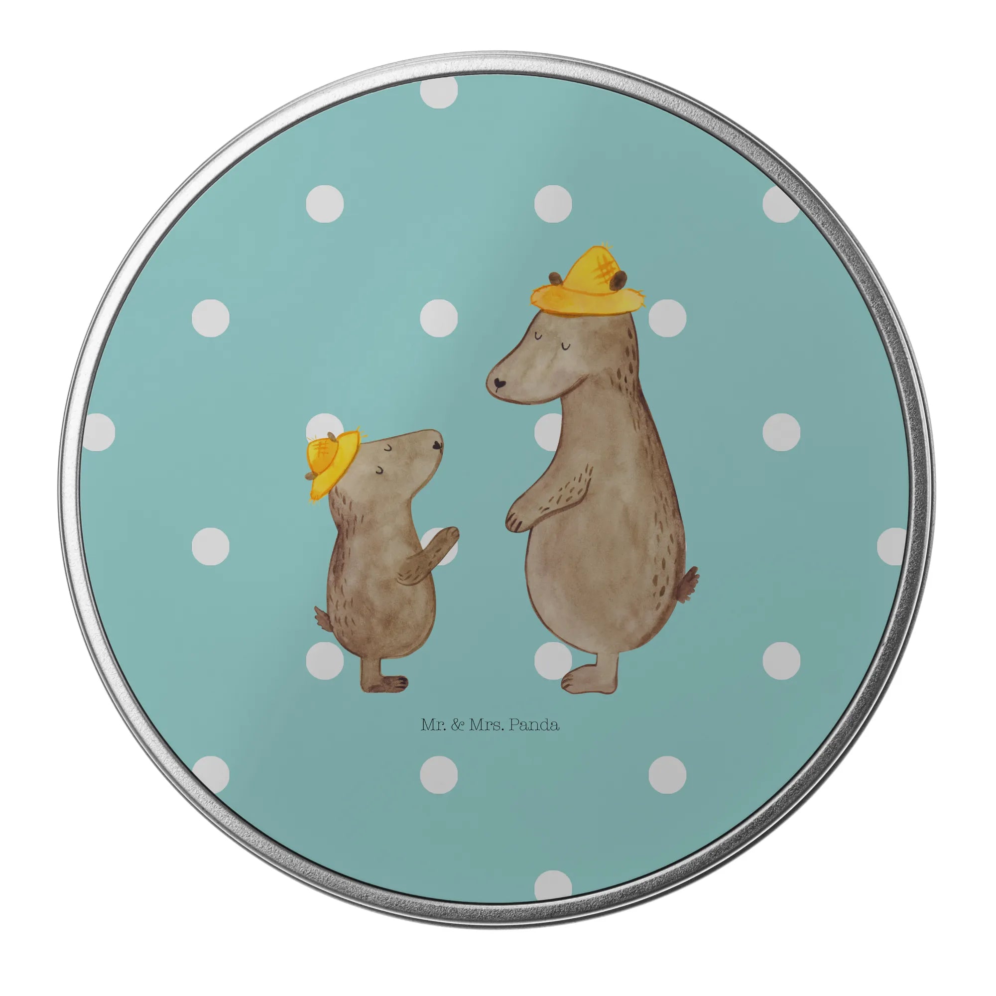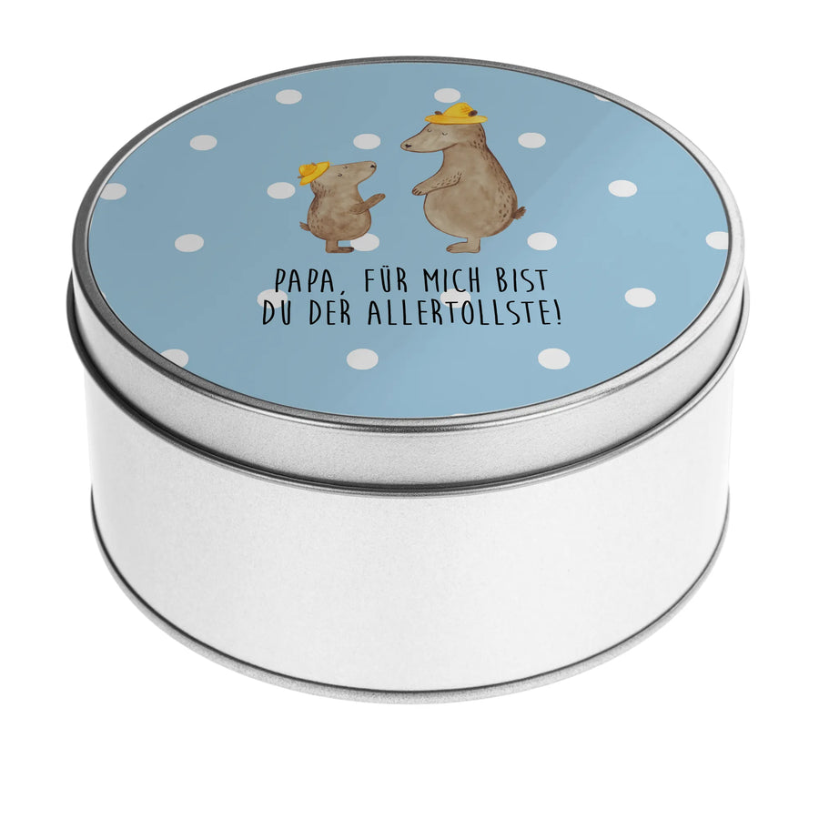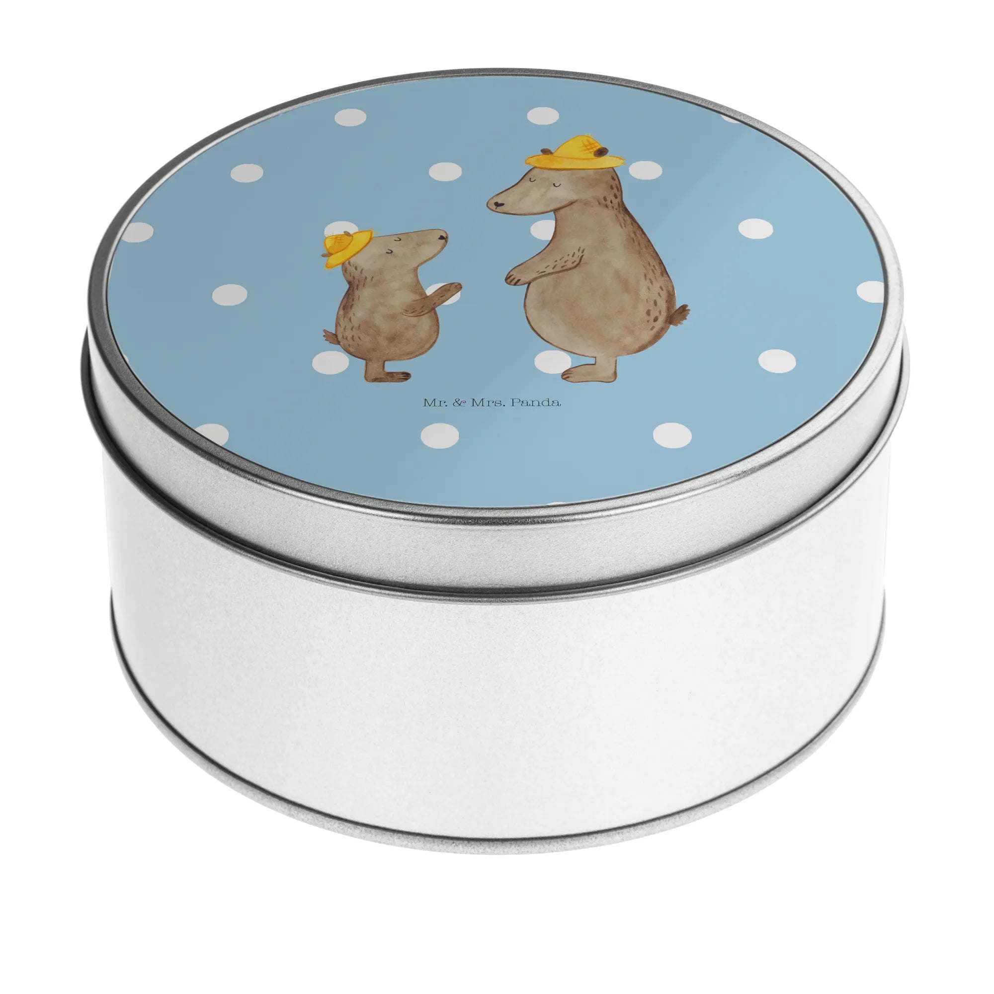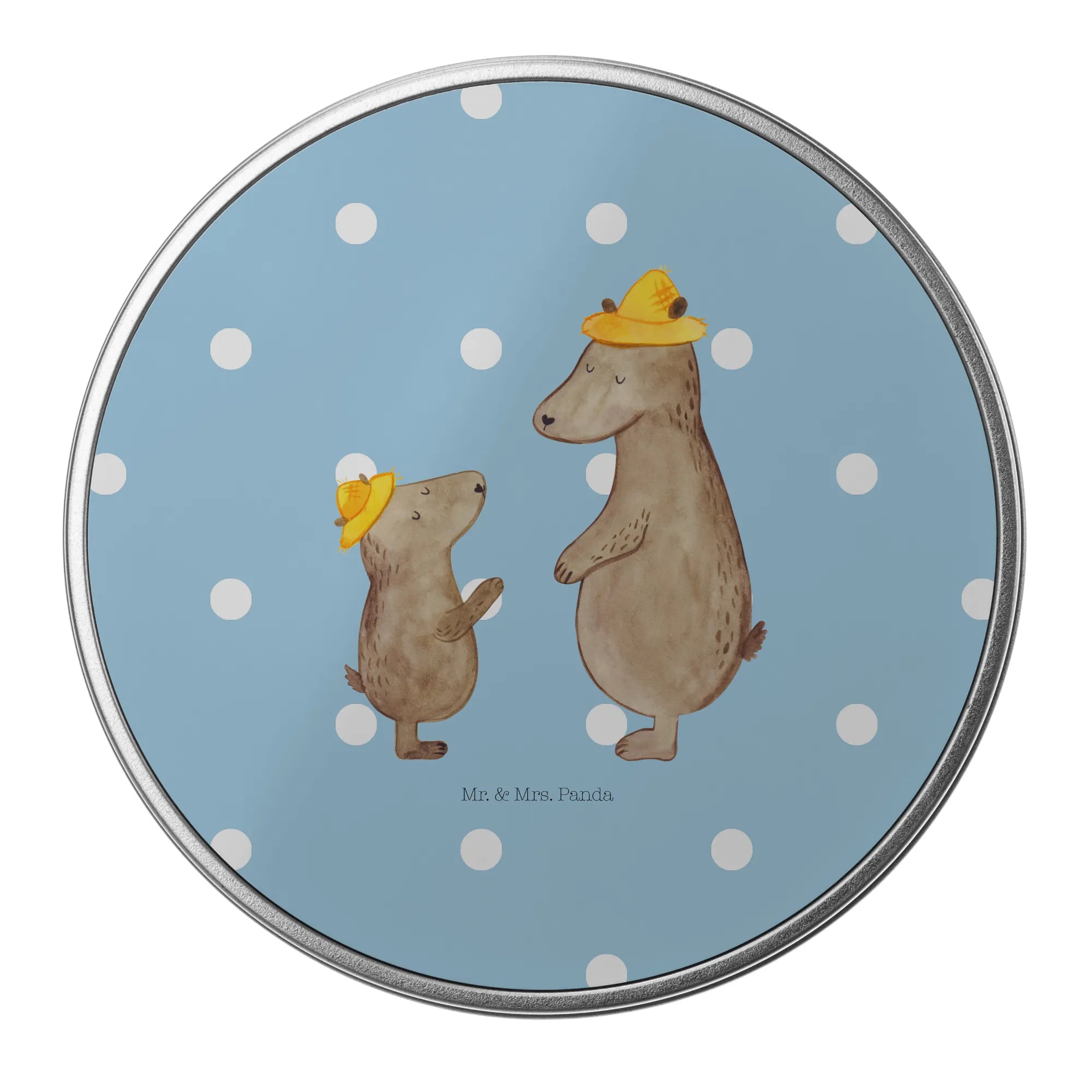 okrągła puszka z blachy Niedźwiedzie z kapeluszami - z napisem - Niebieski Pastel