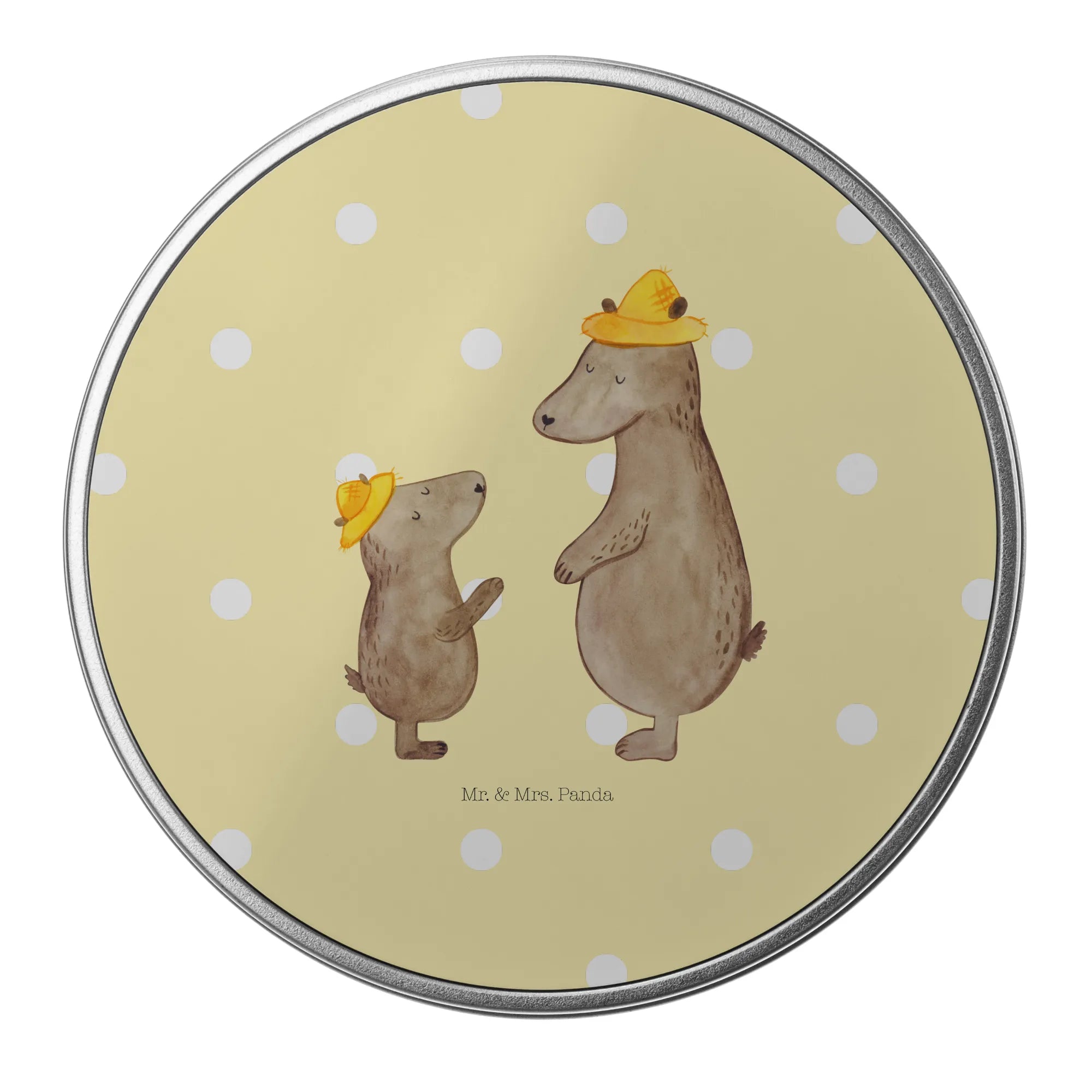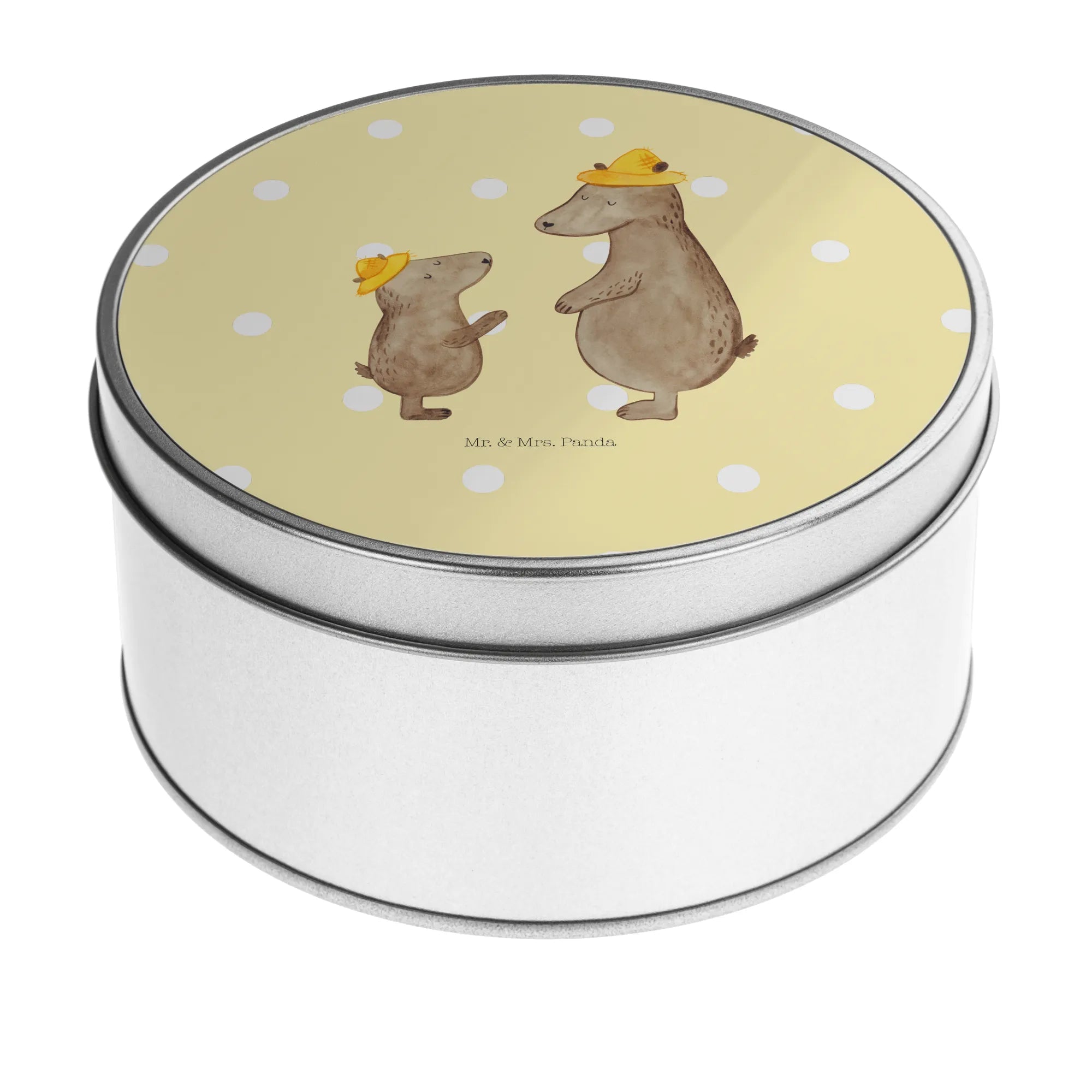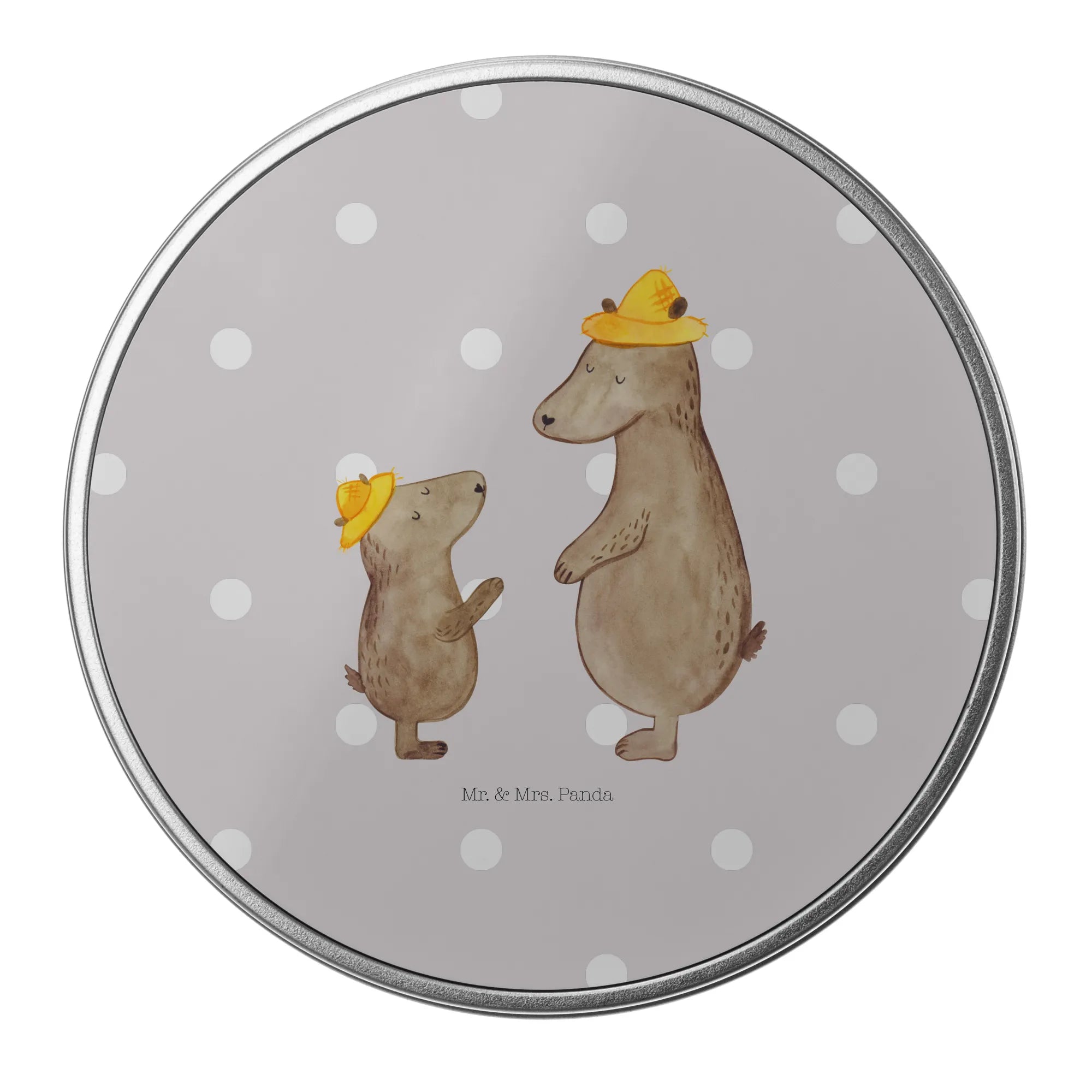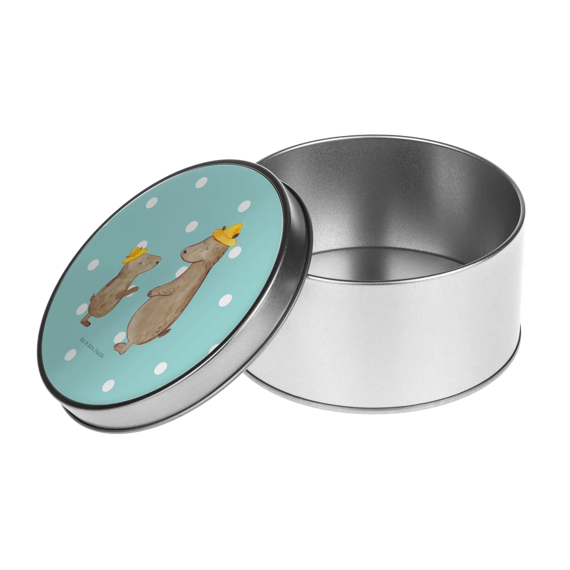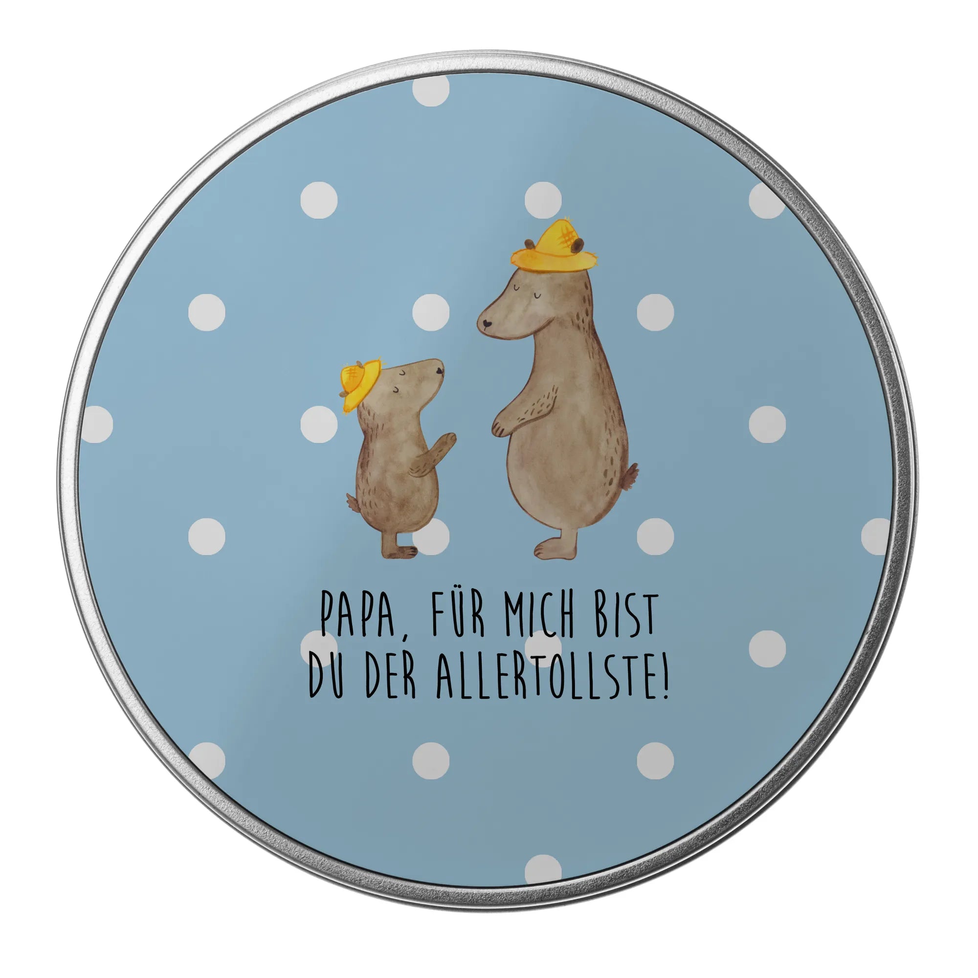 okrągła puszka z blachy Niedźwiedzie z kapeluszami - z napisem - Niebieski Pastel