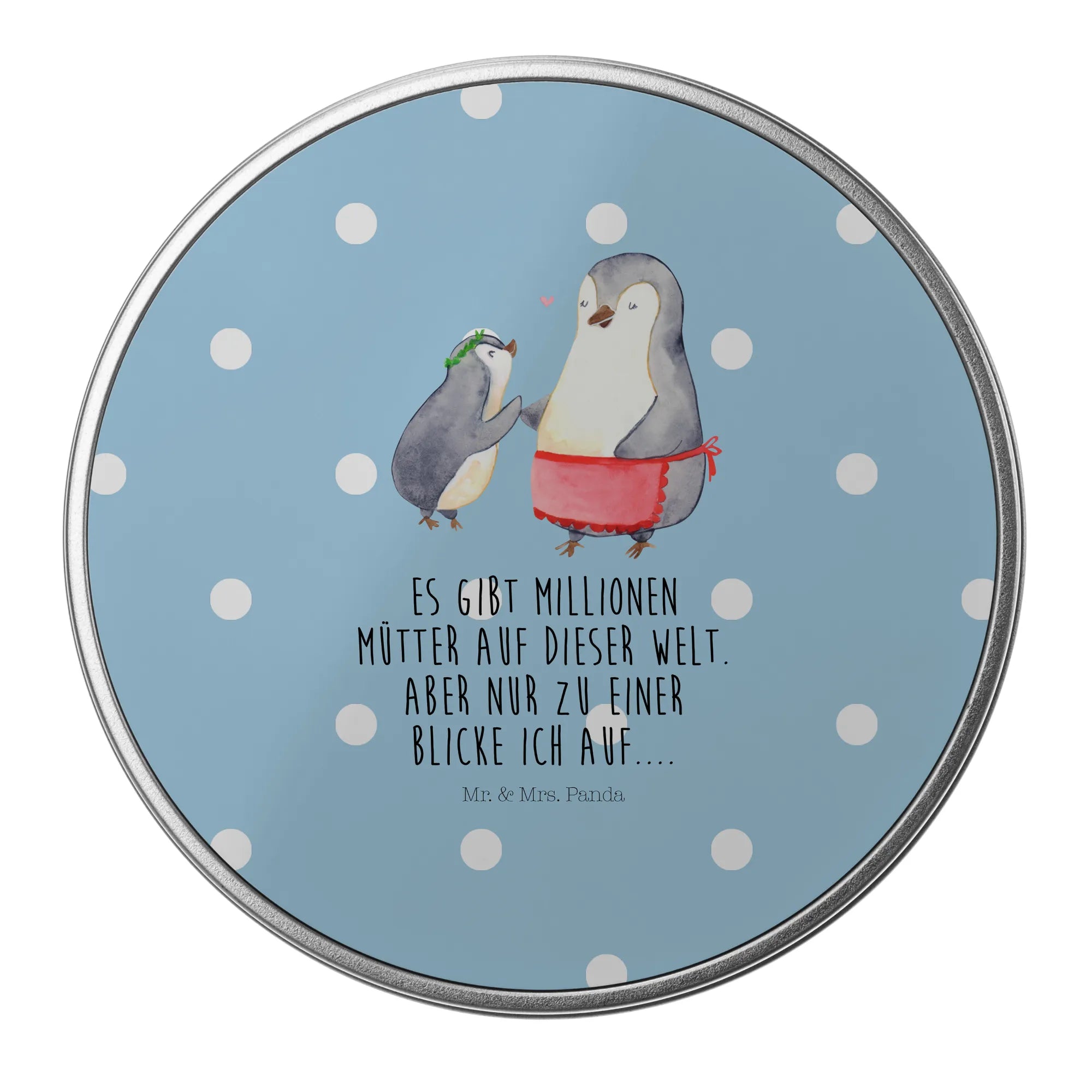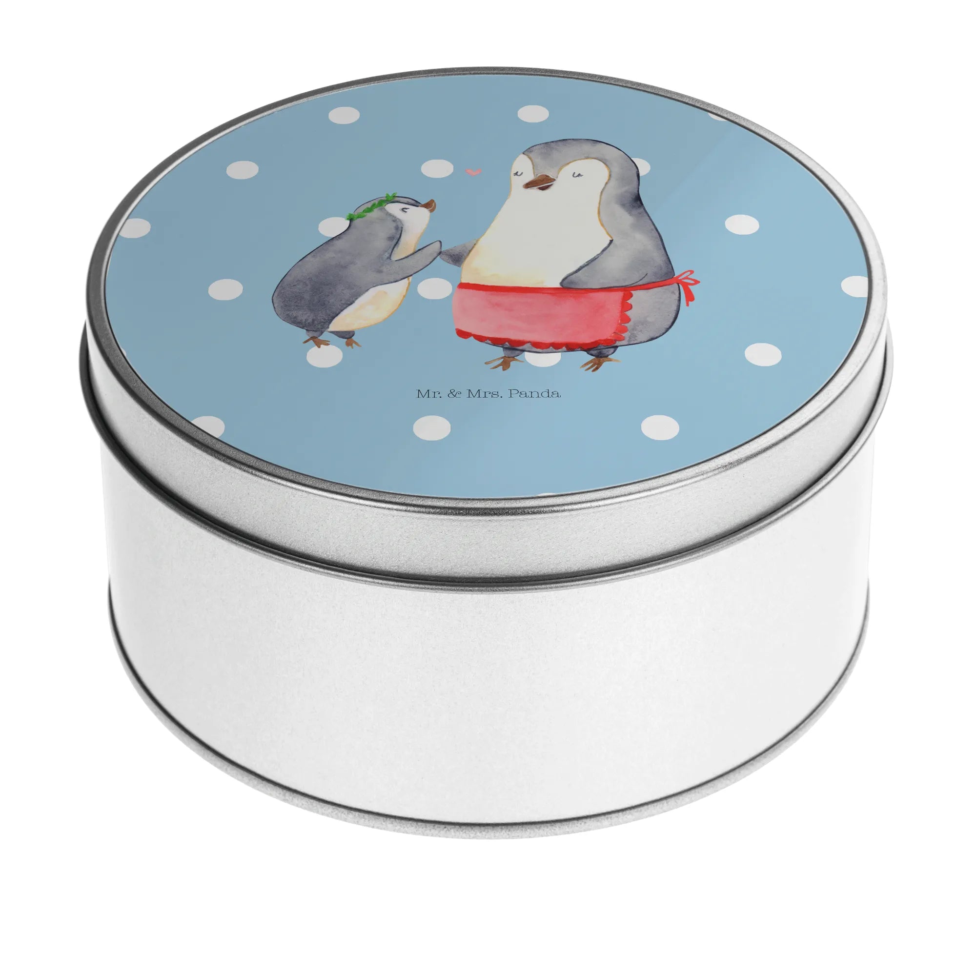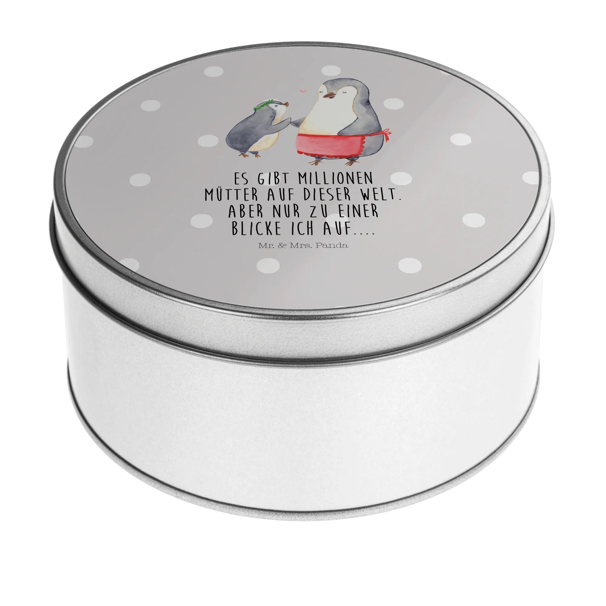 okrągła puszka z blachy Pingwin z dzieckiem - z napisem - Pastelowy szary