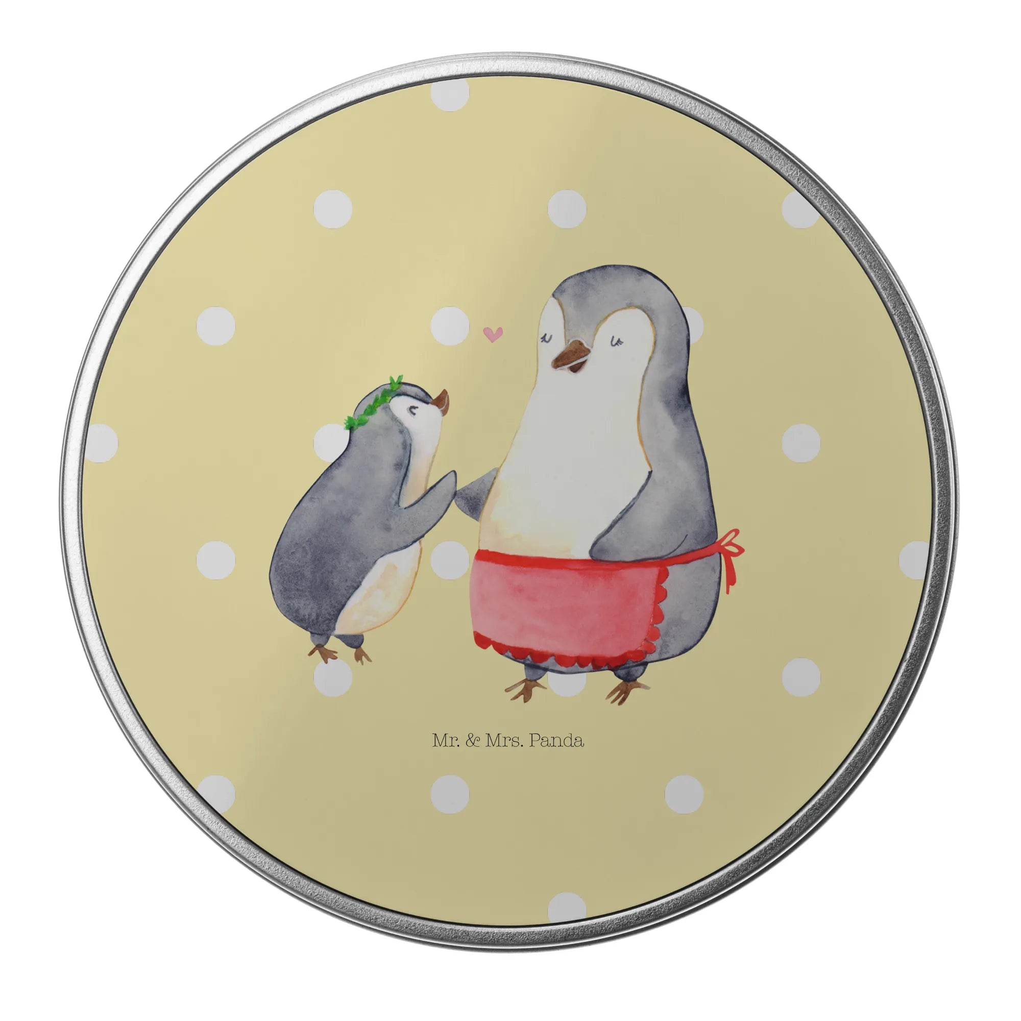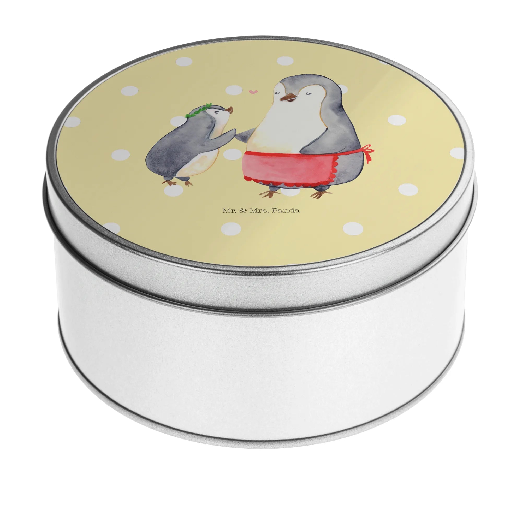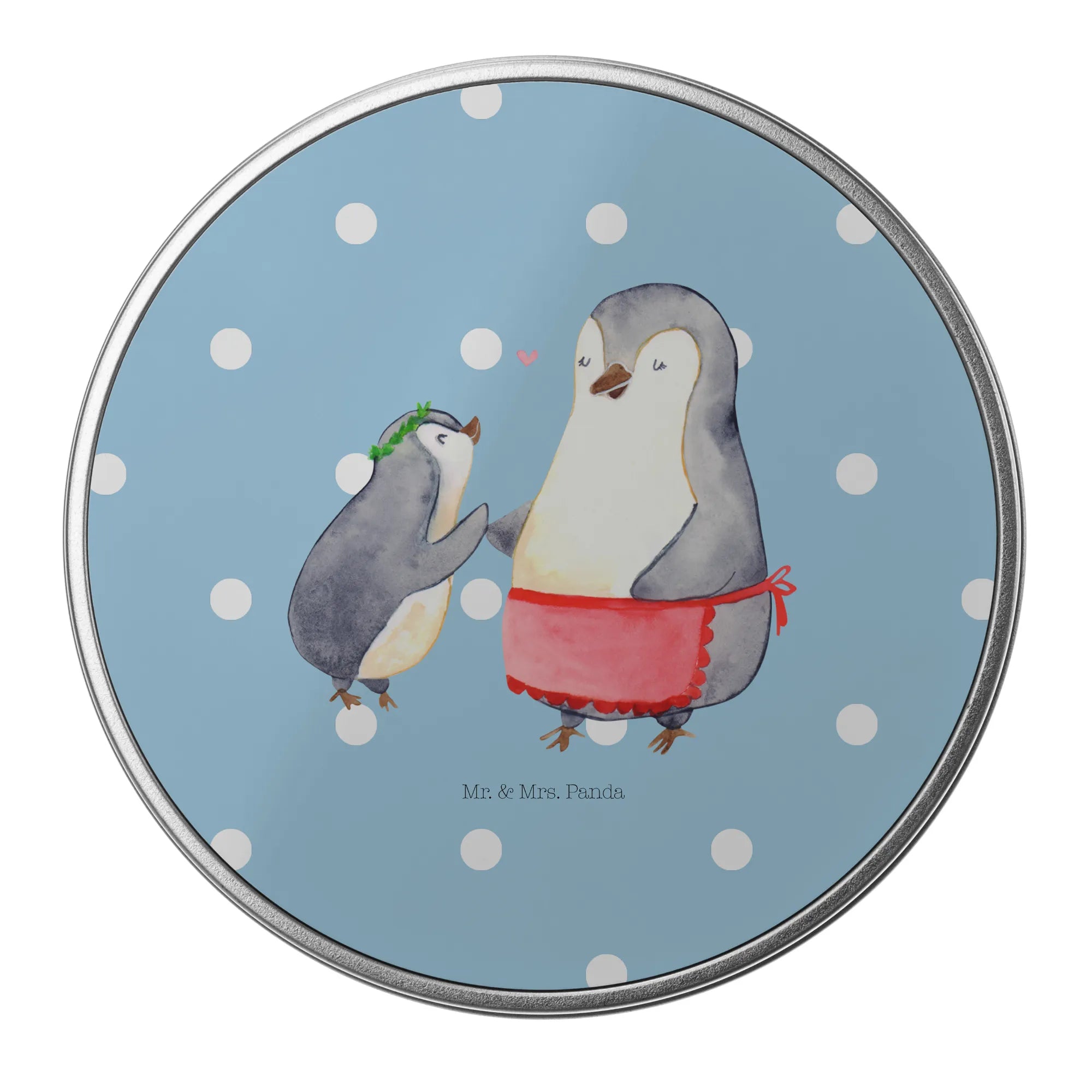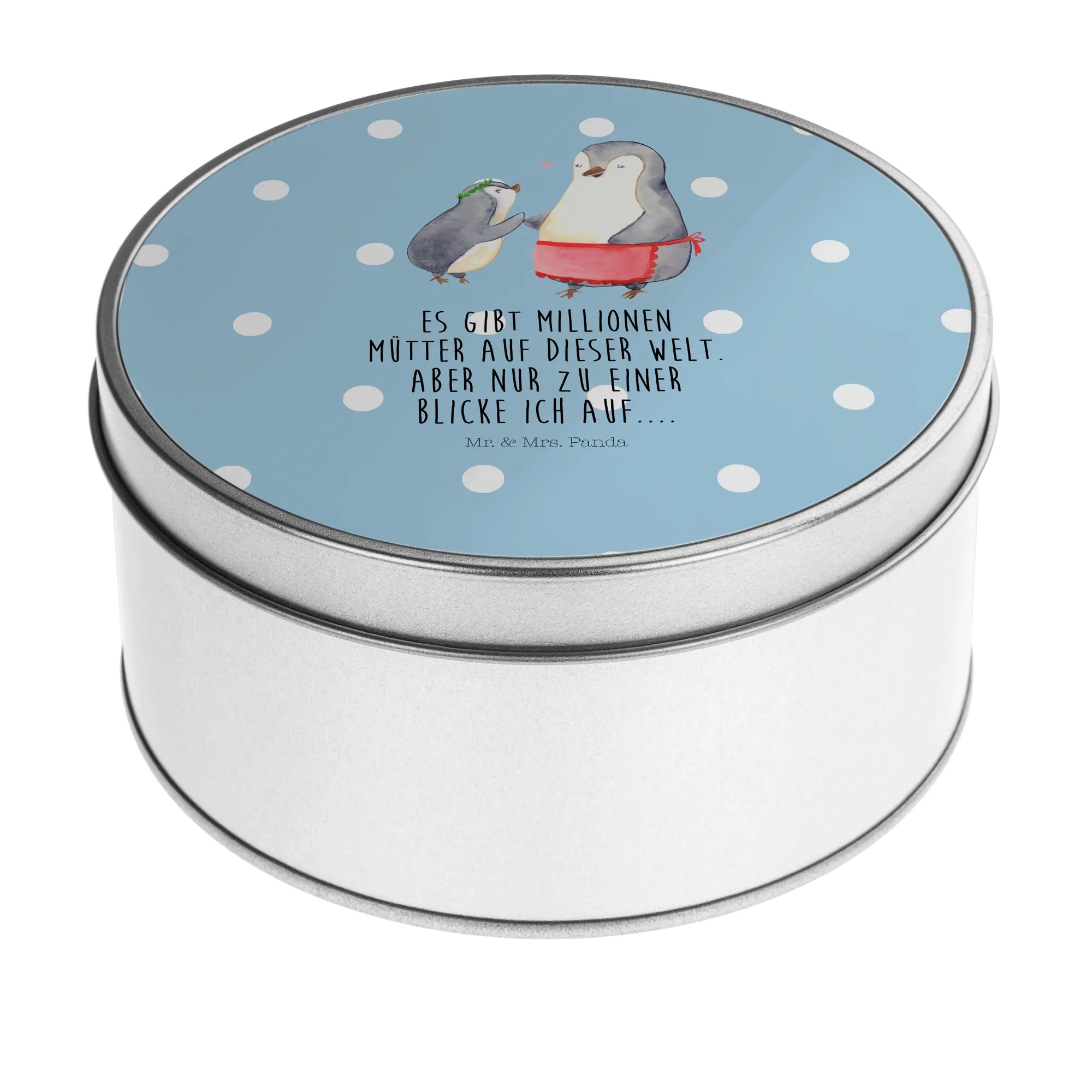 okrągła puszka z blachy Pingwin z dzieckiem - z napisem - Pastelowy szary