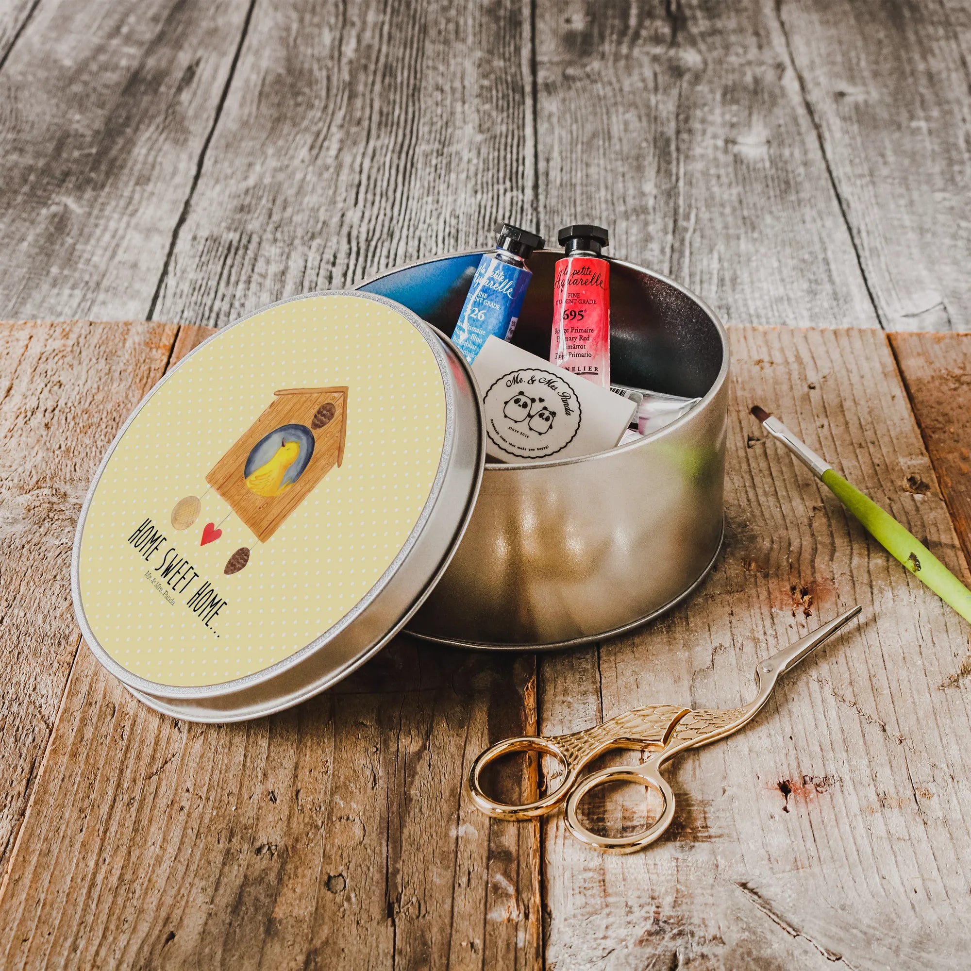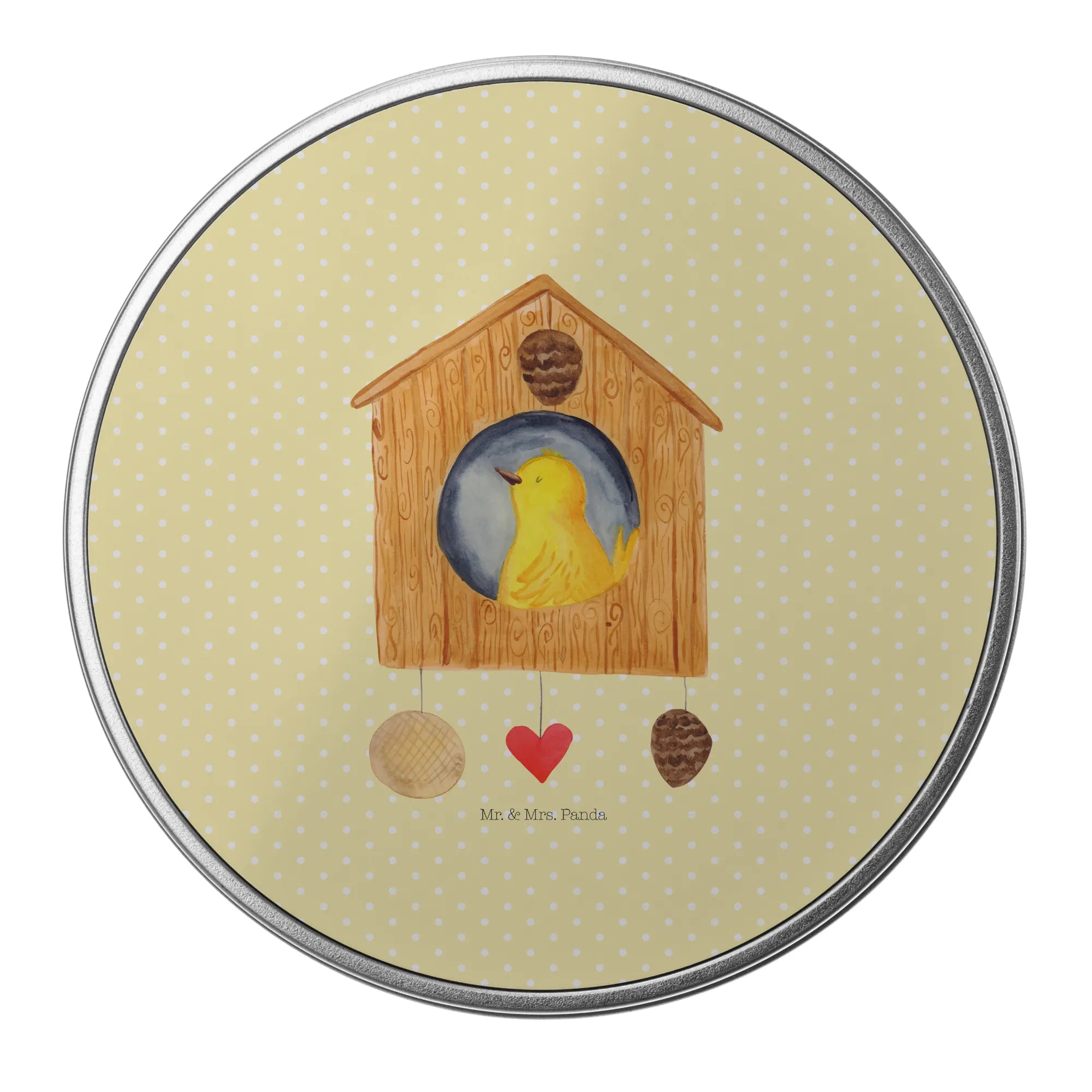 okrągła puszka z blachy ptasi domek Strona główna - z napisem