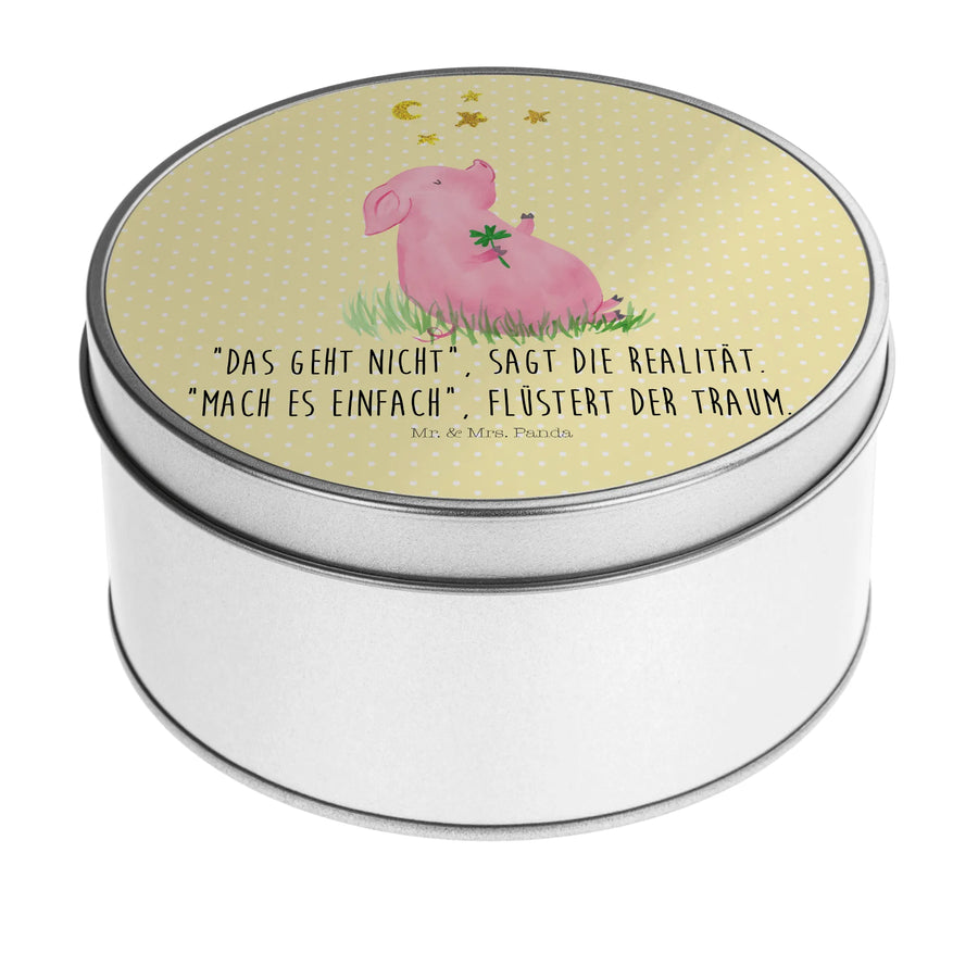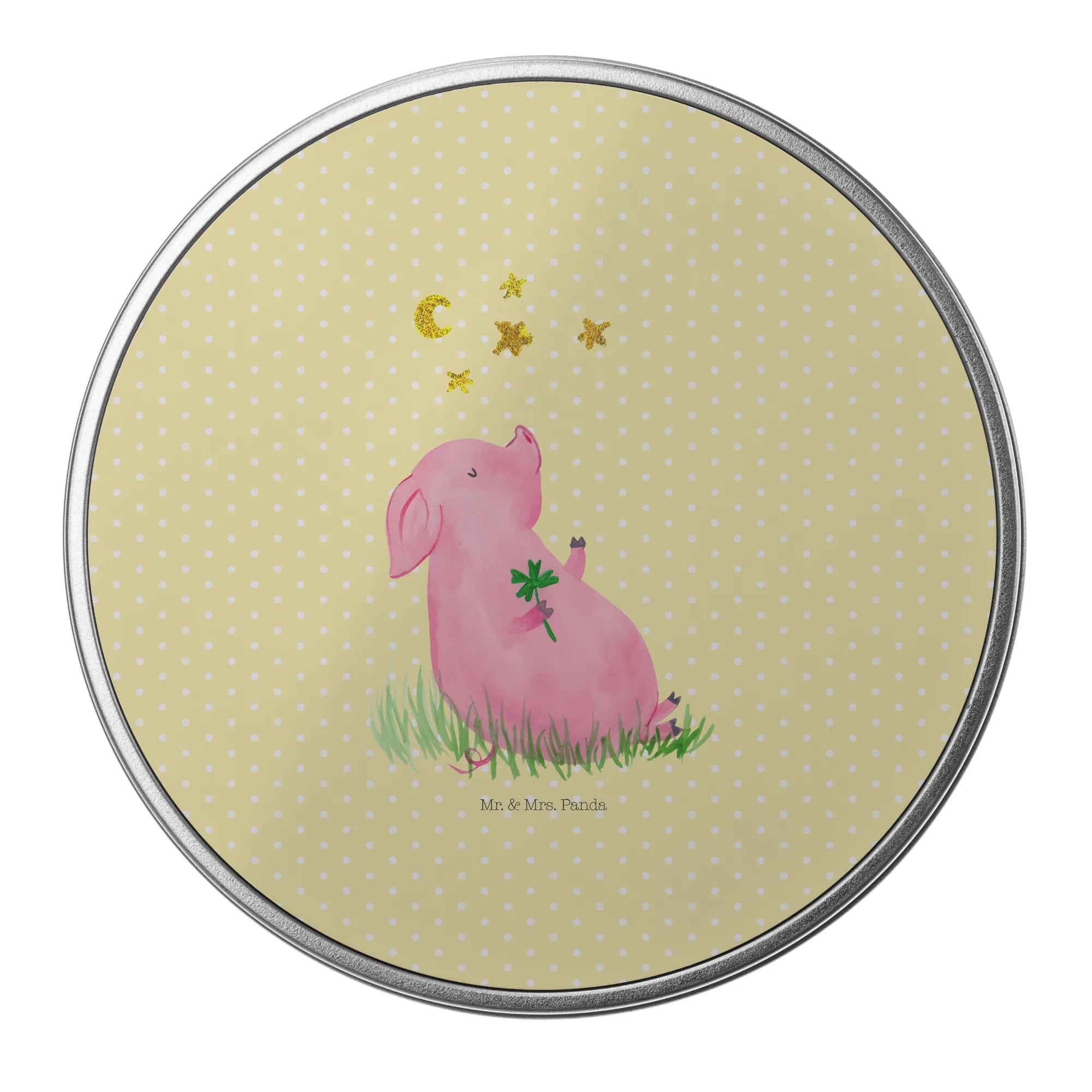 okrągła puszka z blachy świnia Szczęście - z napisem