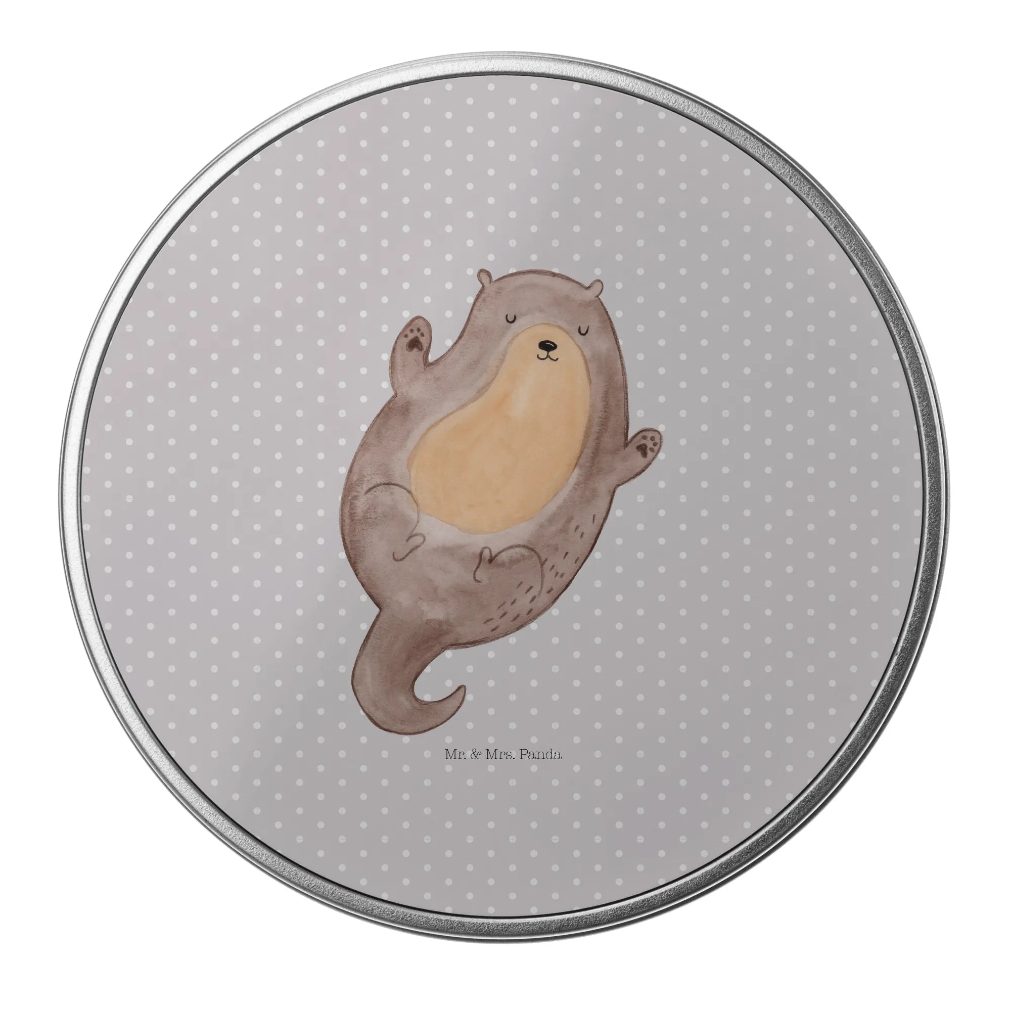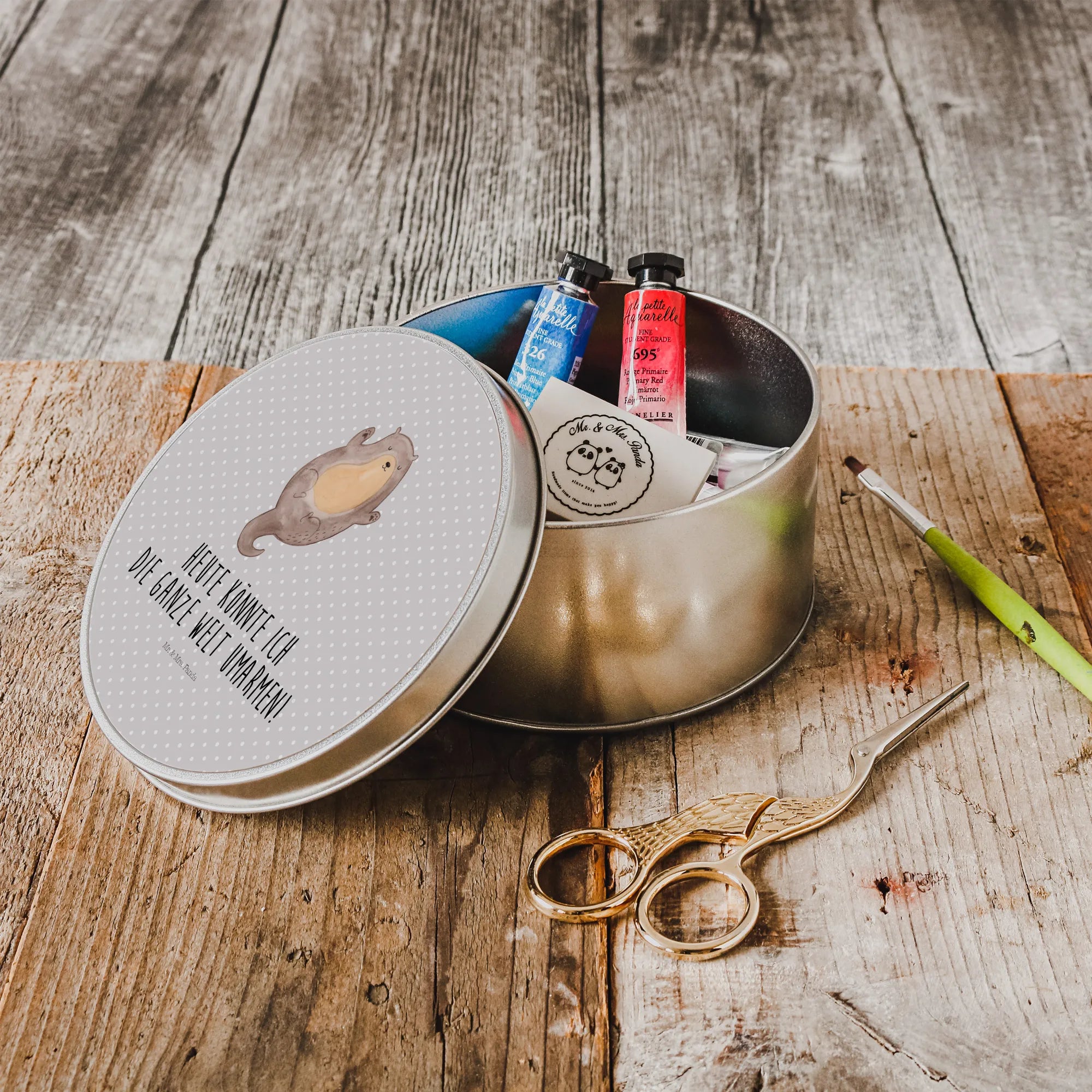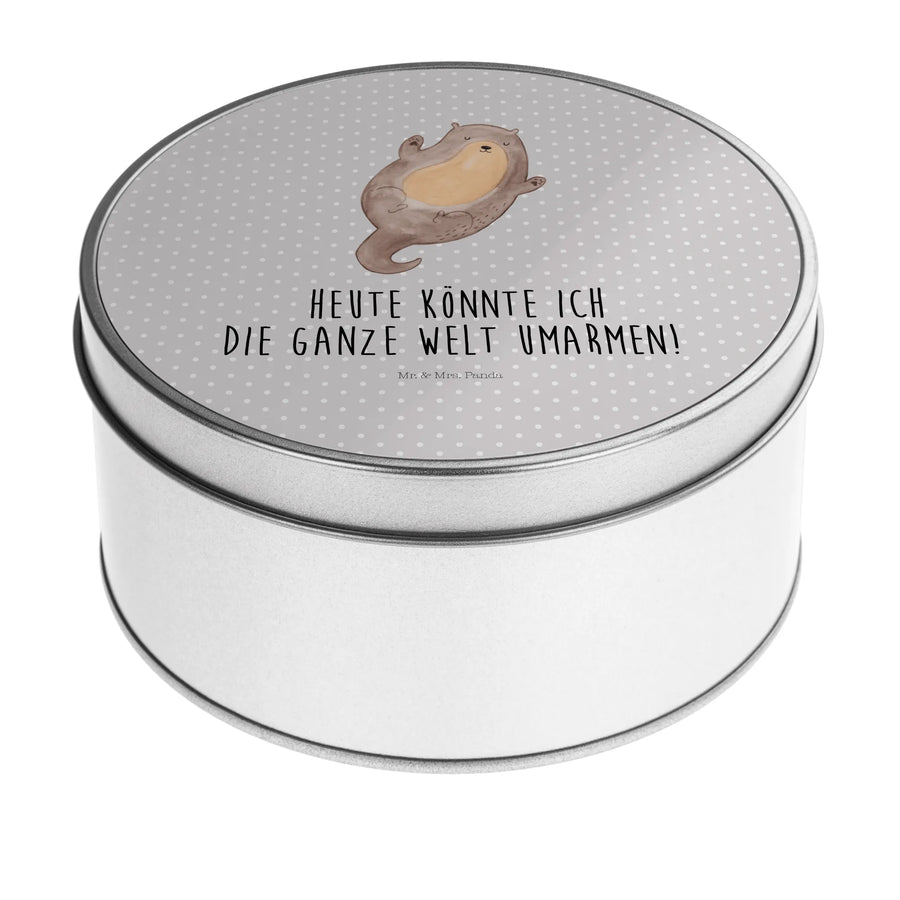 okrągła puszka z blachy wydra Przytulić - z napisem