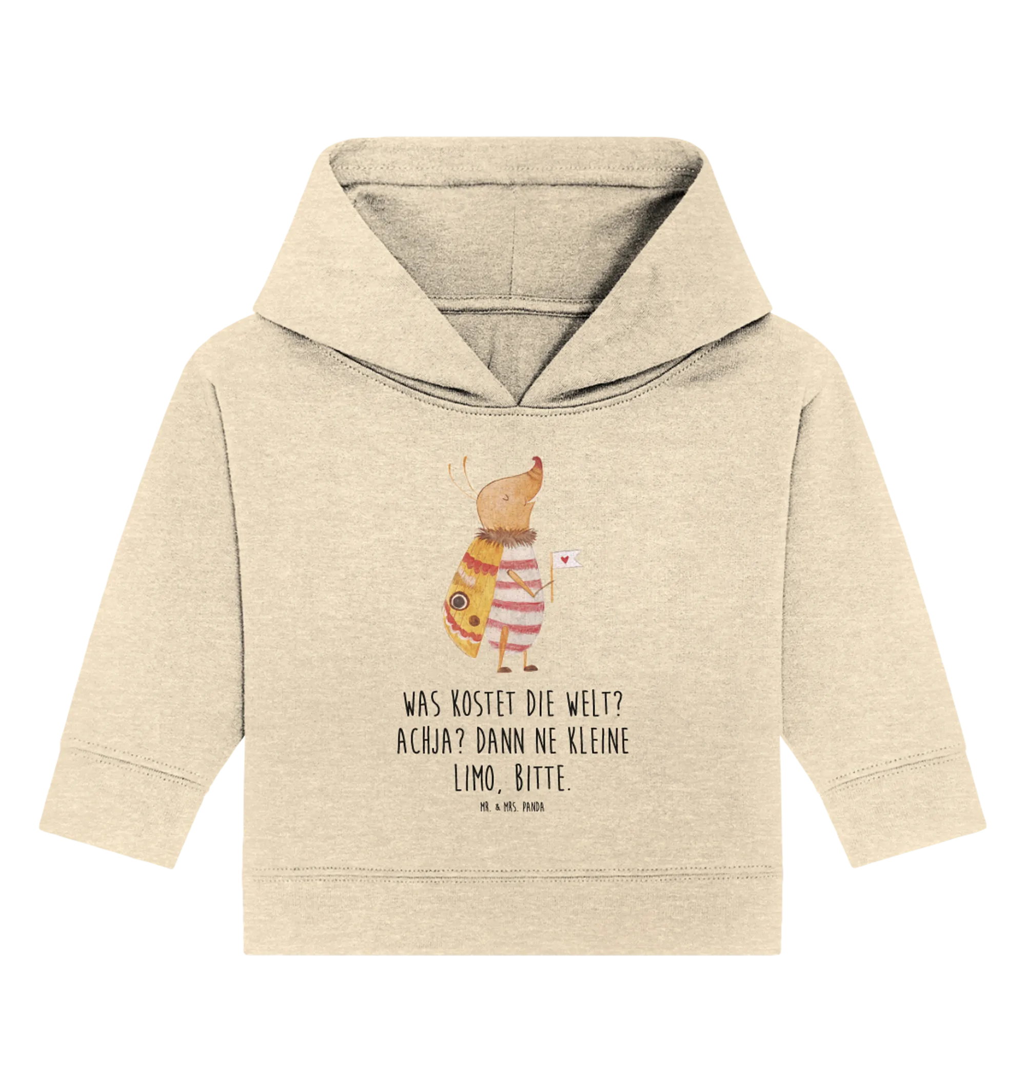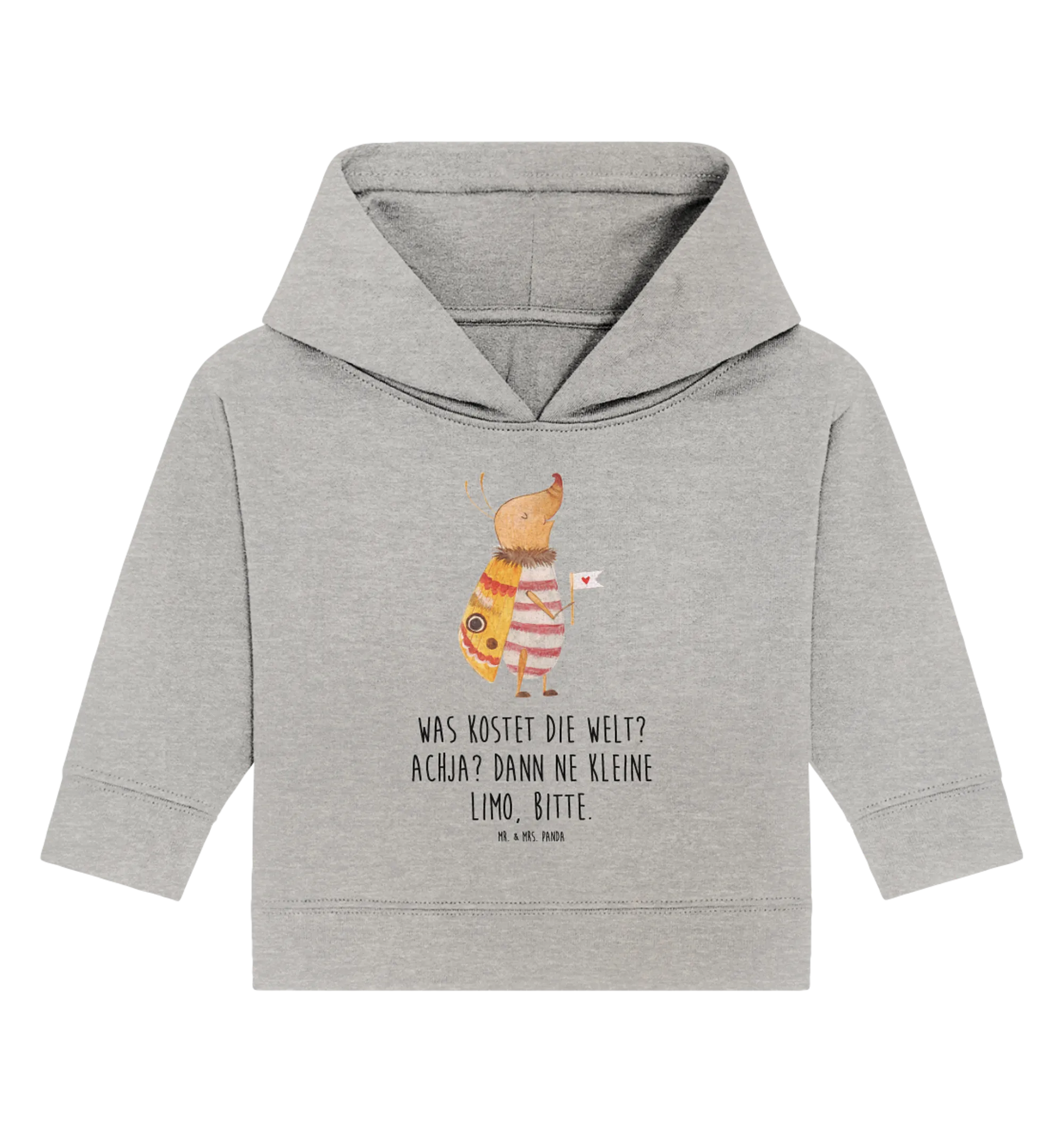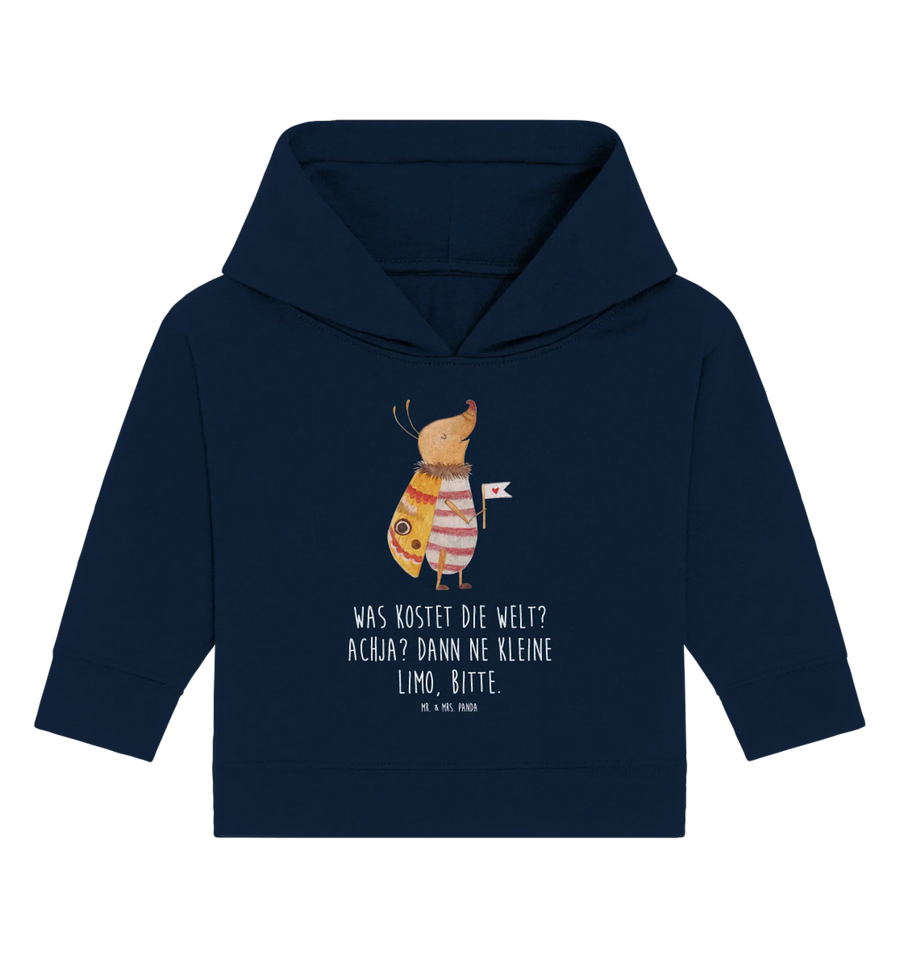 Dieser Kapuzenpulli eignet sich hervorragend als Geschenk zur Geburt, zur Taufe oder auch zum ersten Geburtstag. Alle werden neidisch auf den kleinen Nachtfalter mit den witzigen Sprüchen voller guter Laune sein: „Was kostet die Welt? Achja? Dann ne kleine Limo, bitte.“