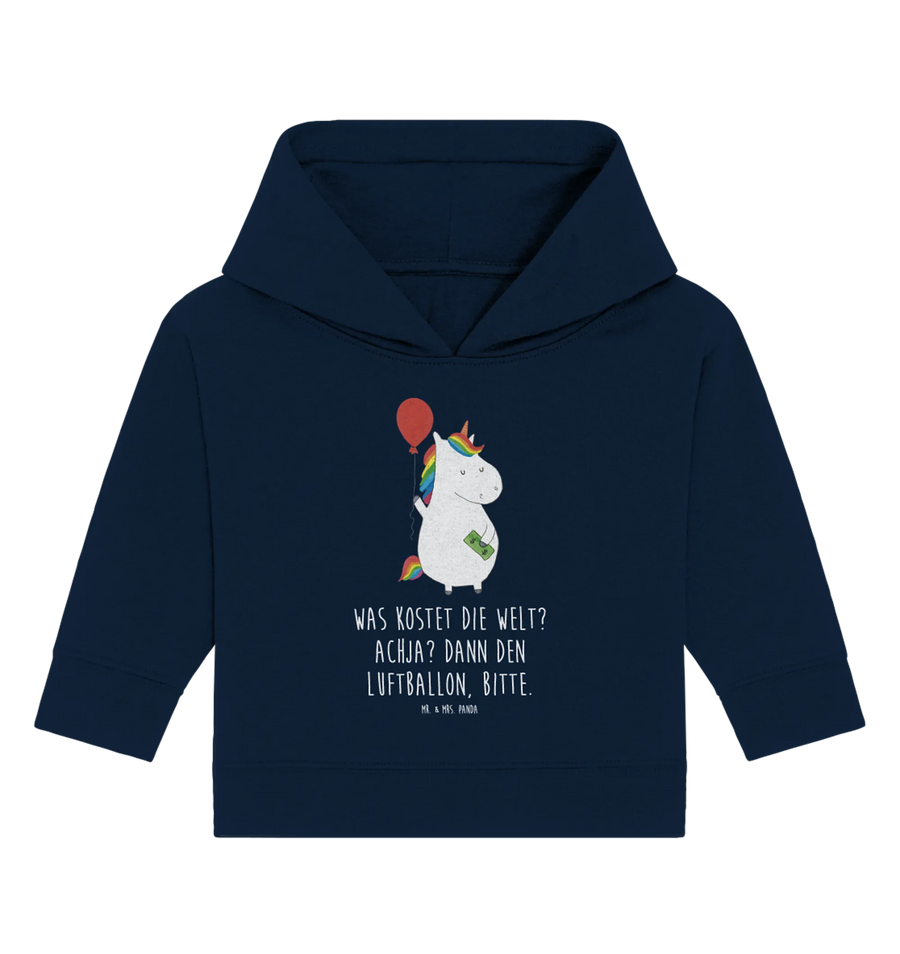 Unser Organic Baby Hoodie aus der Einhorn - Kollektion von Mr. & Mrs. Panda ist mehr als nur ein Baby Kapuzenshirt – er ist ein liebenswertes Statement voller Lebenslust. Das handgezeichnete Einhorn hält einen Luftballon in der einen Hand und ein paar Geldscheine in der anderen, begleitet vom frechen Spruch: „Was kostet die Welt? Achja? Dann den Luftballon, bitte.“
