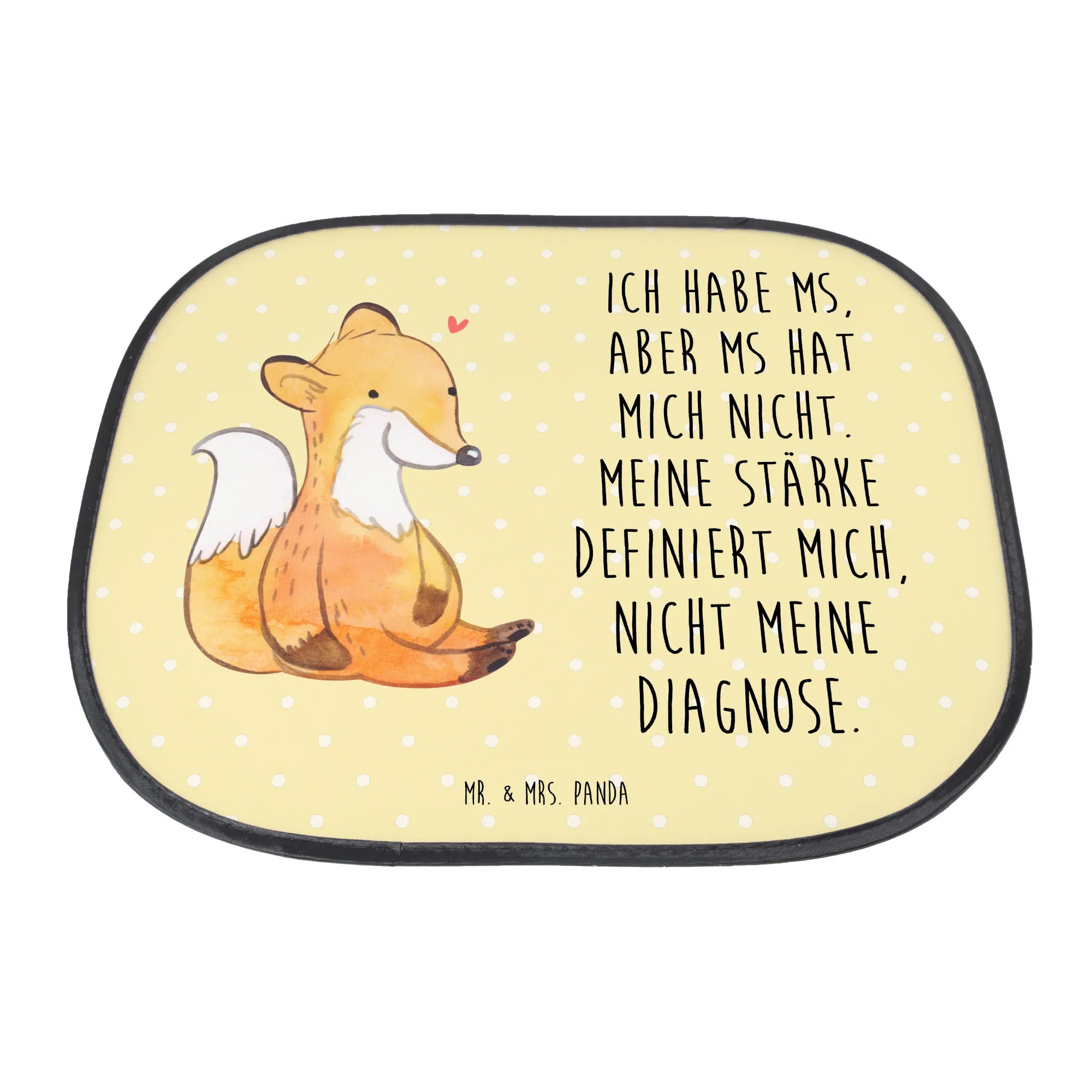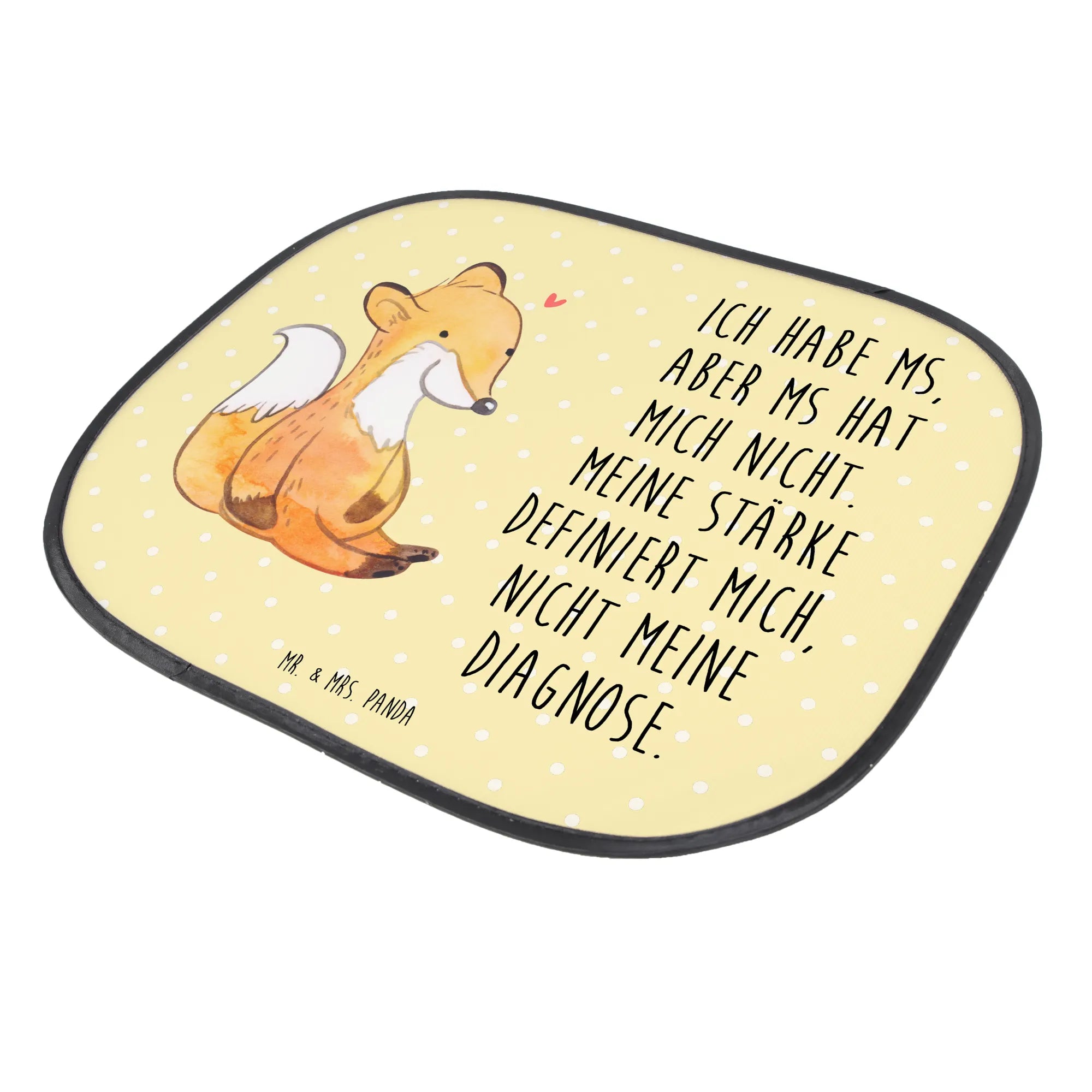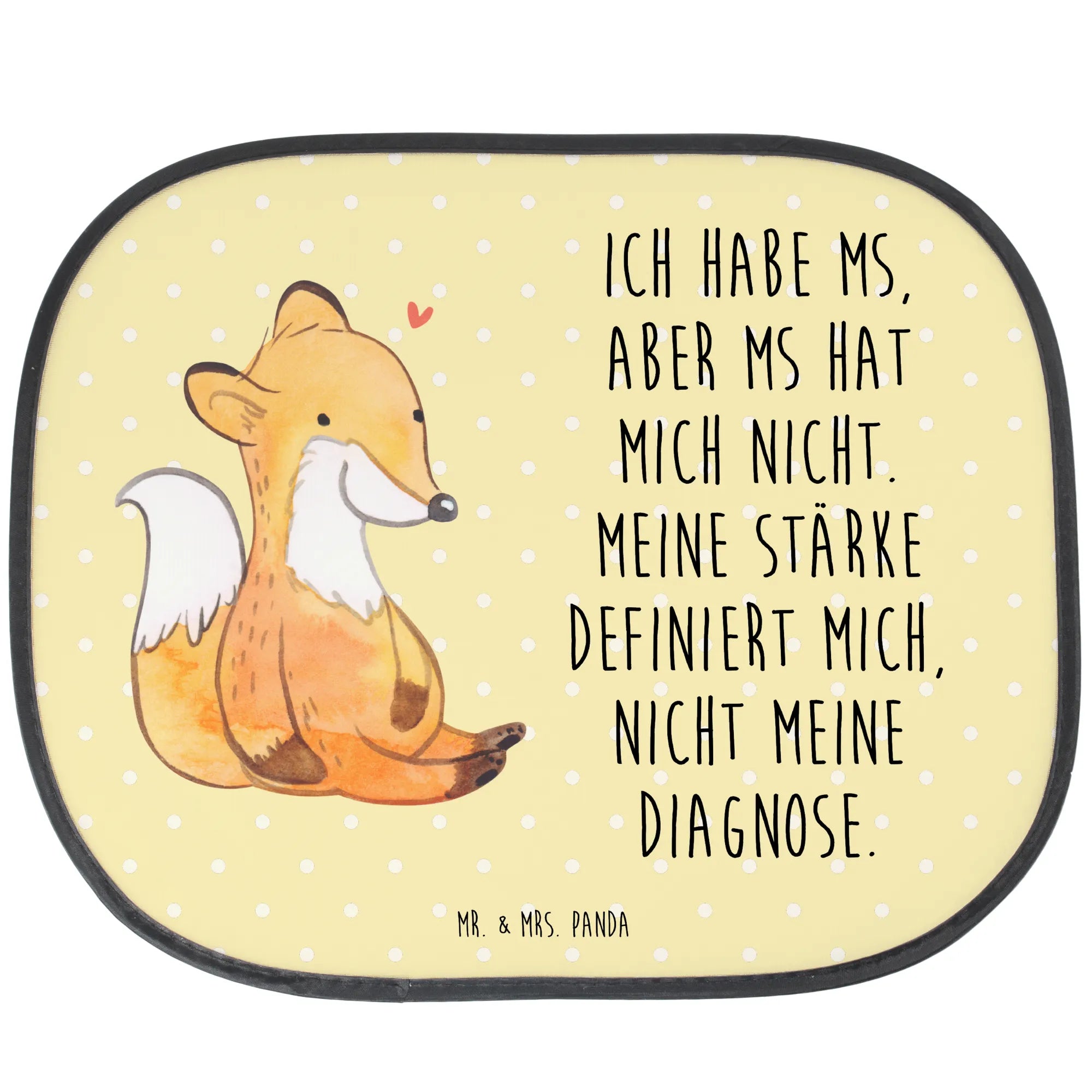 Ein dezenter, respektvoller Sonnenschutz für dein Auto: Auf einem pastellgelben Hintergrund sitzt ein ruhiger Fuchs und trägt die Botschaft ‚Ich habe MS, aber MS hat mich nicht. Meine Stärke definiert mich, nicht meine Diagnose.‘ Das Motiv aus der Kollektion Tiere mit Superkräften verbindet Schutzfunktion mit Aufmerksamkeit für Menschen mit Multiple Sklerose.