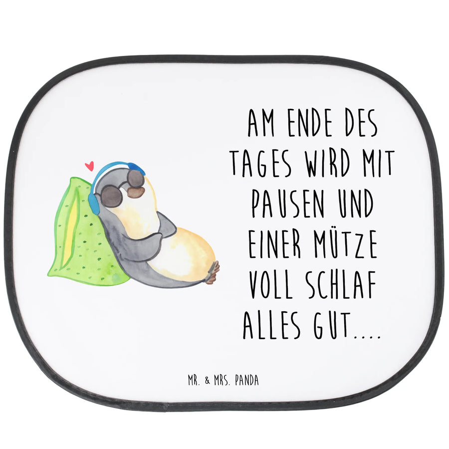 Unser seitlicher Sonnenschutz für die Autoscheibe aus der Kollektion Tiere mit Superkräften verbindet Alltagstauglichkeit mit einer ruhigen, respektvollen Botschaft. Das Motiv zeigt Pinguin PEM, der erschöpft mit Sonnenbrille und Kopfhörern auf einem Kissen liegt, begleitet von dem Satz „Am Ende des Tages wird mit Pausen und einer Mütze voll Schlaf alles gut....“ – ein leiser Hinweis auf Achtsamkeit und Selbstfürsorge.
