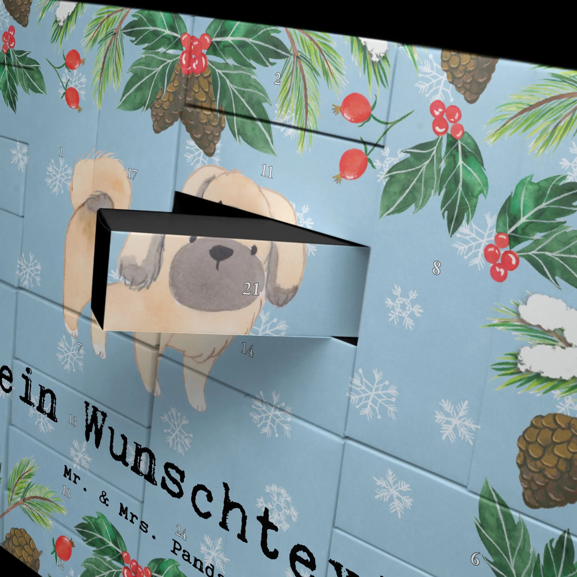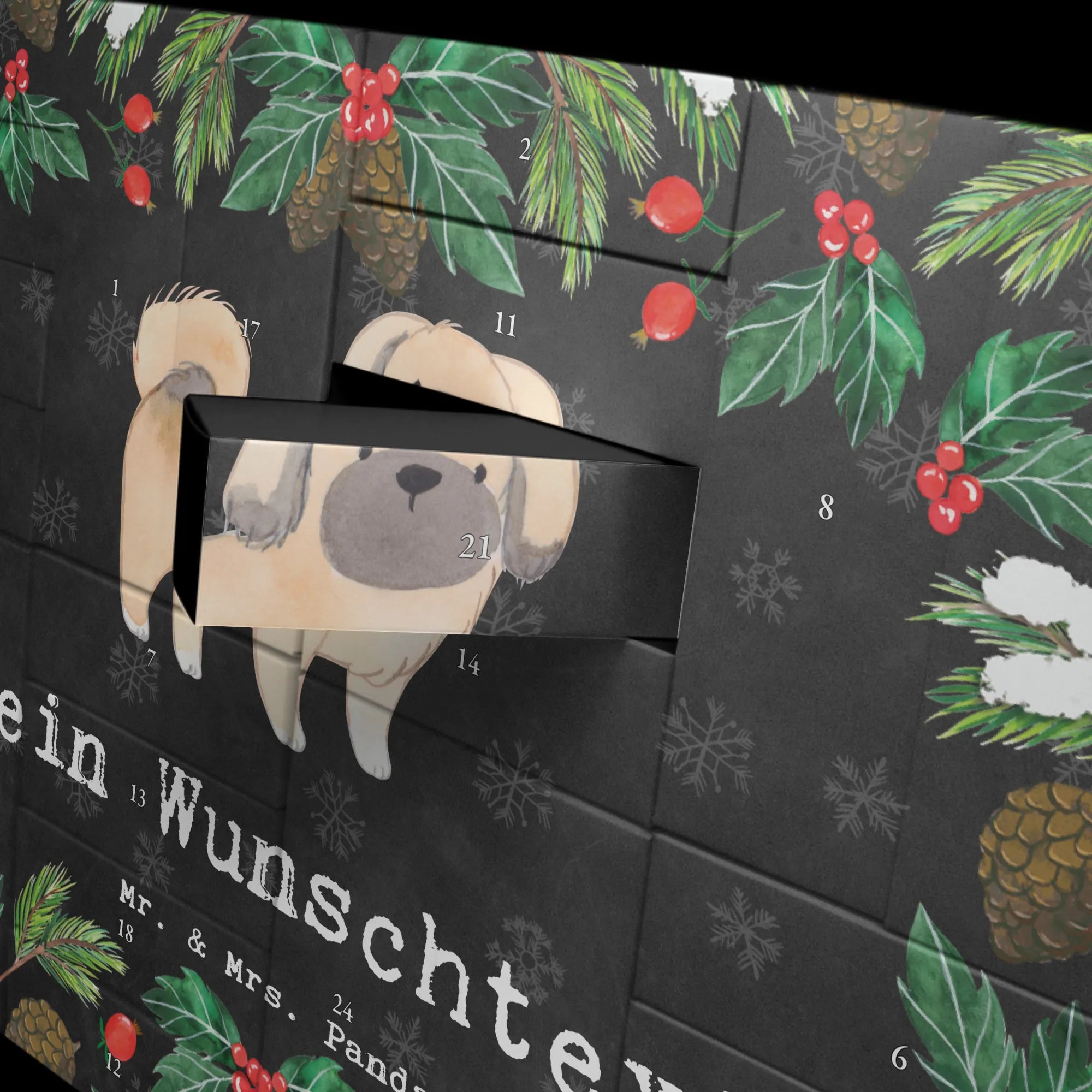 Dieser Adventskalender, liebevoll von Mrs. Panda entworfen, zeigt einen niedlichen Pekingesen, der mit seinem rundlichen, freundlichen Gesicht und dem kuscheligen Fell einfach zum Verlieben einlädt. Der Kalender ist aus hochwertigem 300 Gramm Karton gefertigt und beeindruckt durch seine seidenmatte Oberfläche, die die Zeichnung perfekt zur Geltung bringt.