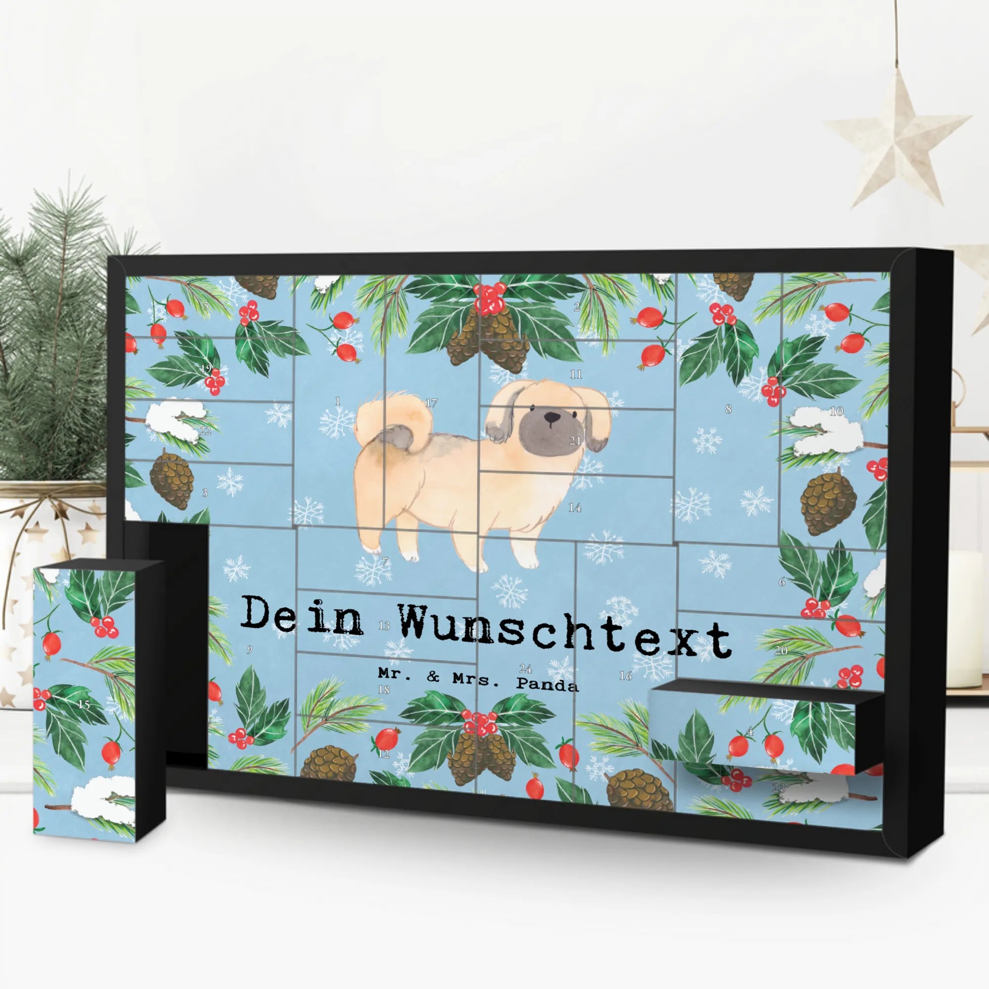 Der personalisierbare Befüllbare Adventskalender mit dem bezaubernden Motiv "Pekingese Moment" von Mr. & Mrs. Panda ist das perfekte Geschenk für Hundeliebhaber und Besitzer dieser charmanten Hunderasse. Vorfreude auf die schönste Zeit des Jahres mit einem Kalender, der nicht nur dein Zuhause festlich schmückt, sondern auch jeden Tag zu einem besonderen Erlebnis macht.