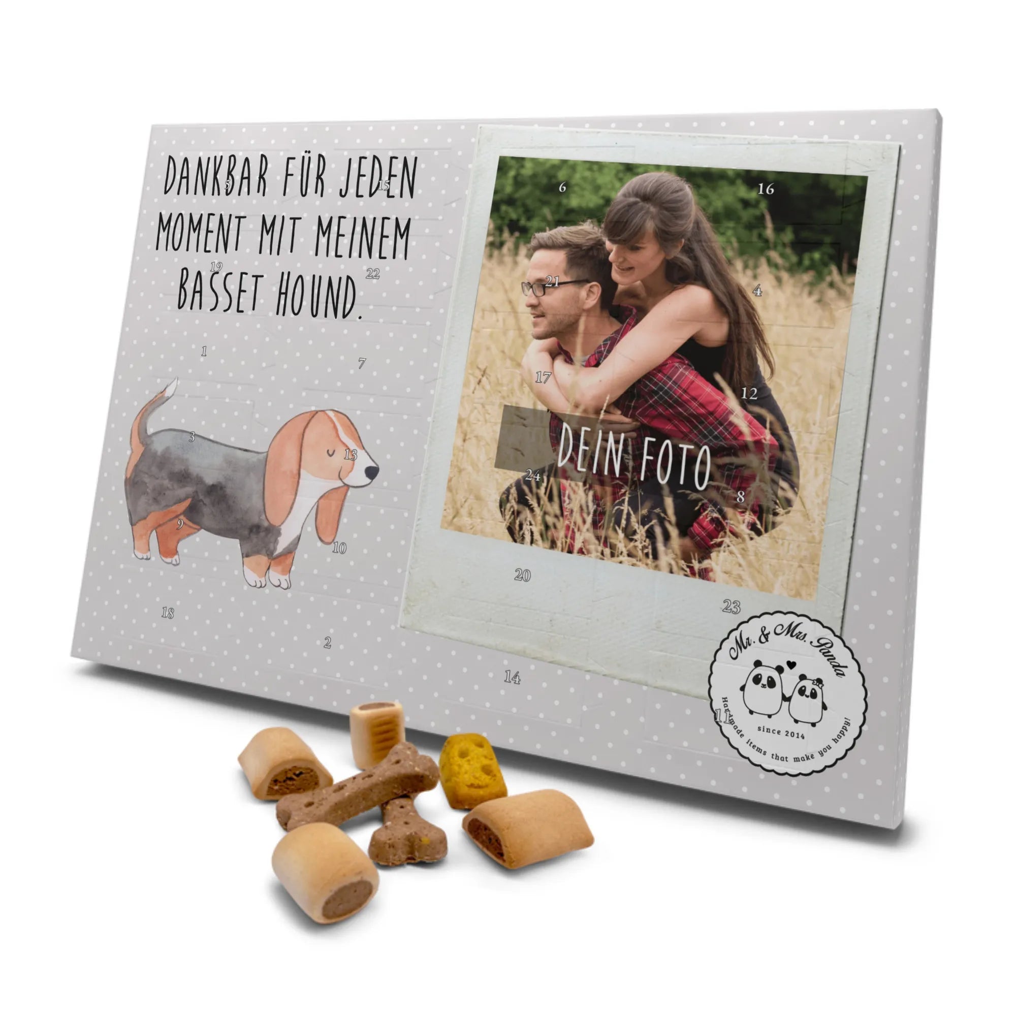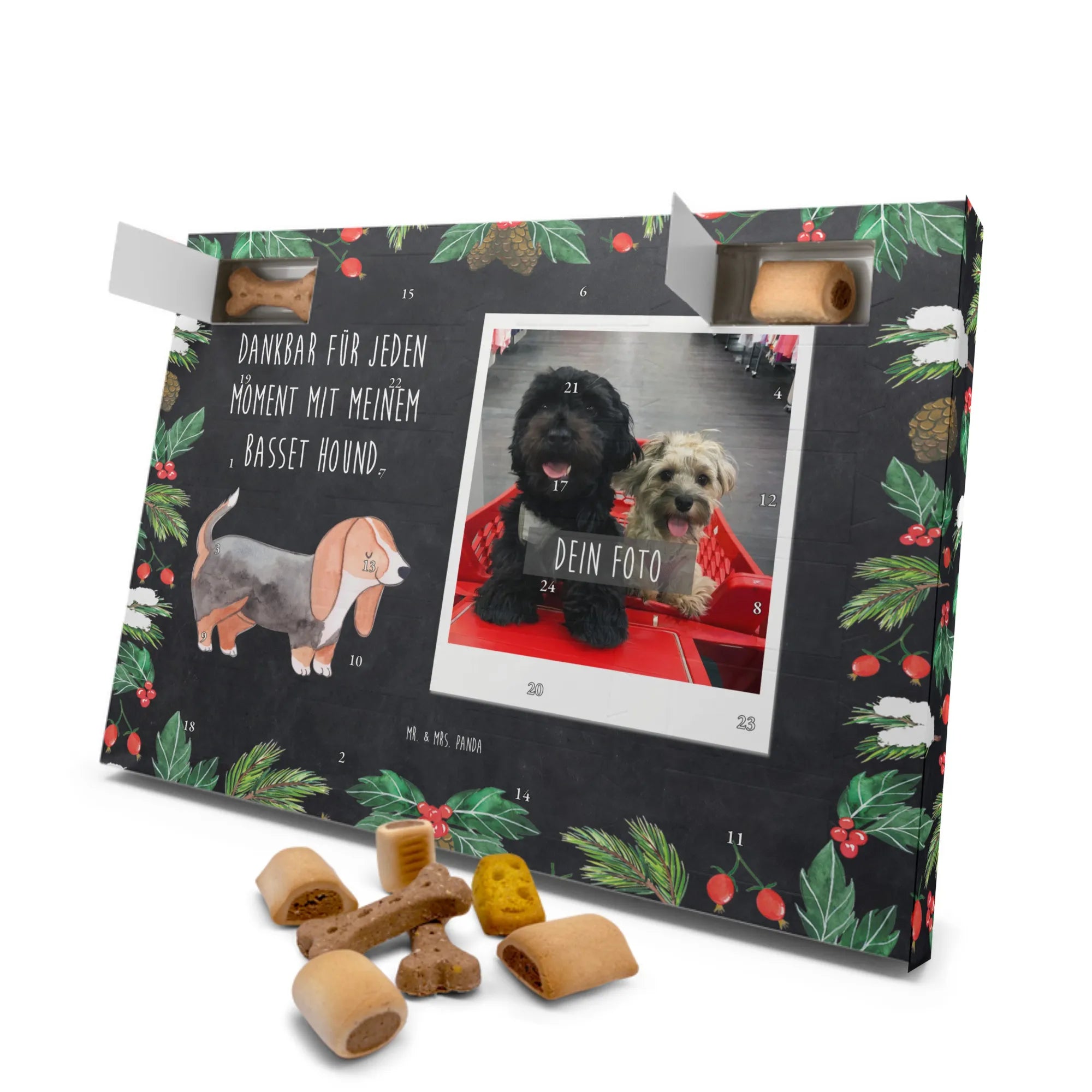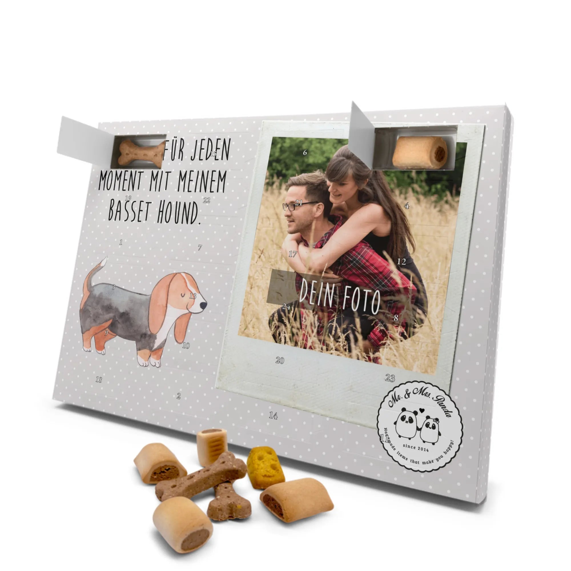 Der personalisierte Hunde Foto Adventskalender "Basset Hound Moment" von Mr. & Mrs. Panda ist das perfekte Geschenk für jeden Hunde- und Basset Hound-Liebhaber! Dieser einzigartige Adventskalender ist nicht nur ein schöner Hingucker, sondern er steckt auch voller süßer Leckereien für deinen pelzigen Freund. Du kannst ihn mit einem persönlichen Foto gestalten und er wird mit dem liebevollen Slogan "Dankbar für jeden Moment mit meinem Basset Hound" bedruckt.