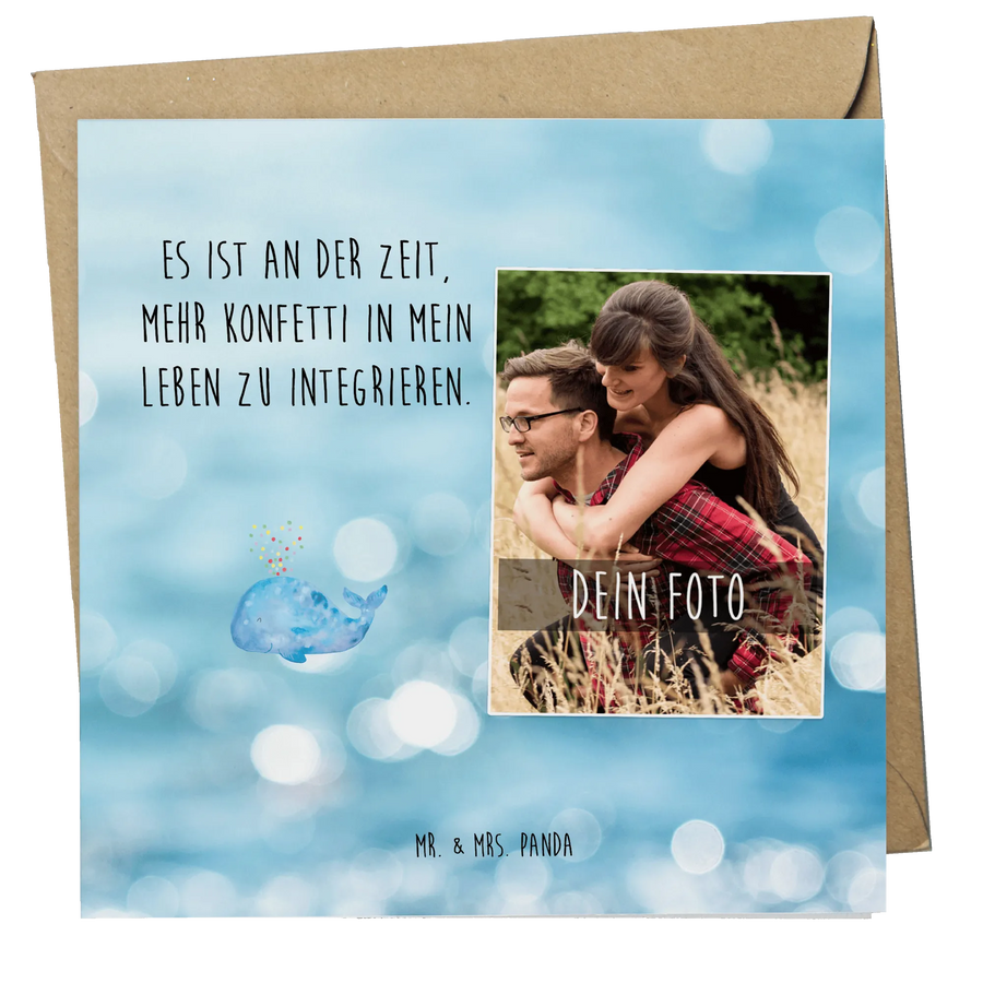 Du suchst nach dem perfekten Geschenk, das Freude bereitet und gleichzeitig eine persönliche Note hat? Die personalisierte Foto Deluxe Karte mit dem niedlichen Wal und Konfetti aus der Meerestiere Kollektion von Mr. & Mrs. Panda ist genau das Richtige für dich!