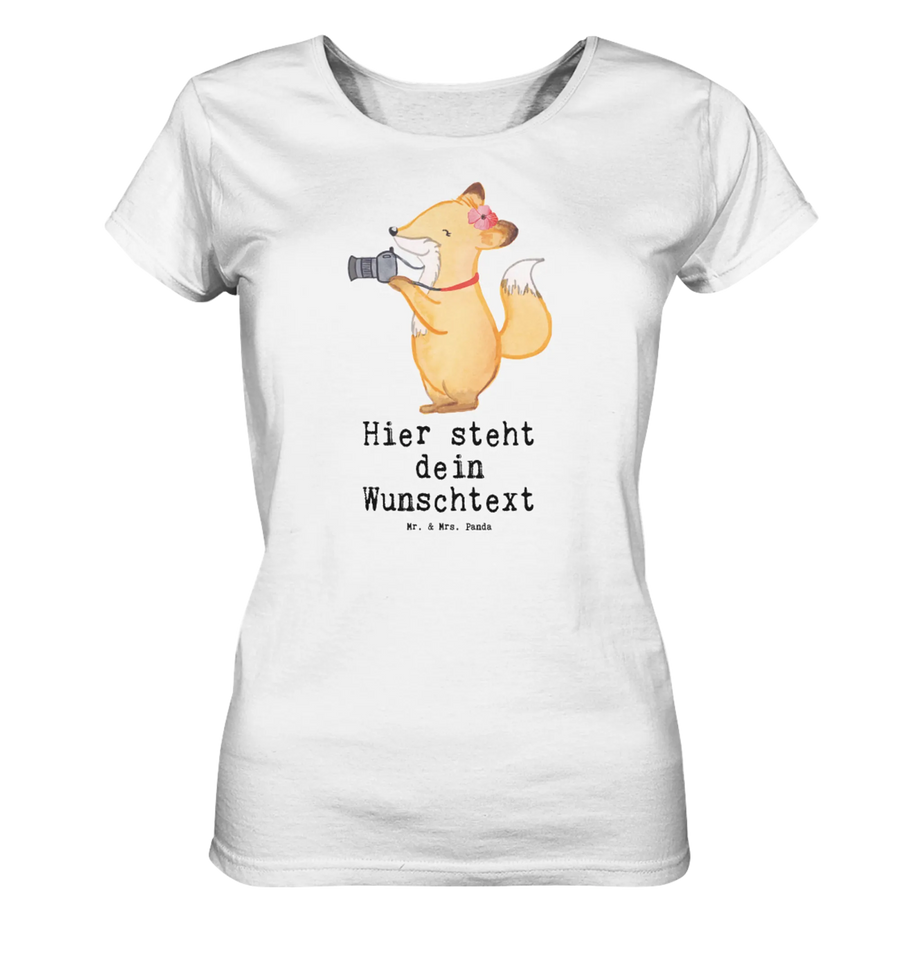Das personalisierte Shirt Damen mit dem einzigartigen Motiv "Fotografin mit Herz" ist das perfekte Geschenk für all jene, die mit Leidenschaft ihre Umgebung durch die Linse ihrer Kamera festhalten. Egal, ob du eine Hobbyfotografin, eine Profi-Fotografin oder einfach nur einen lieben Menschen beschenken möchtest, dieses Shirt wird für große Freude sorgen. Das süße Motiv zeigt einen weiblichen Fuchs mit einer Kamera um den Hals und symbolisiert die Leidenschaft und Kreativität, die in jedem Klick steckt.